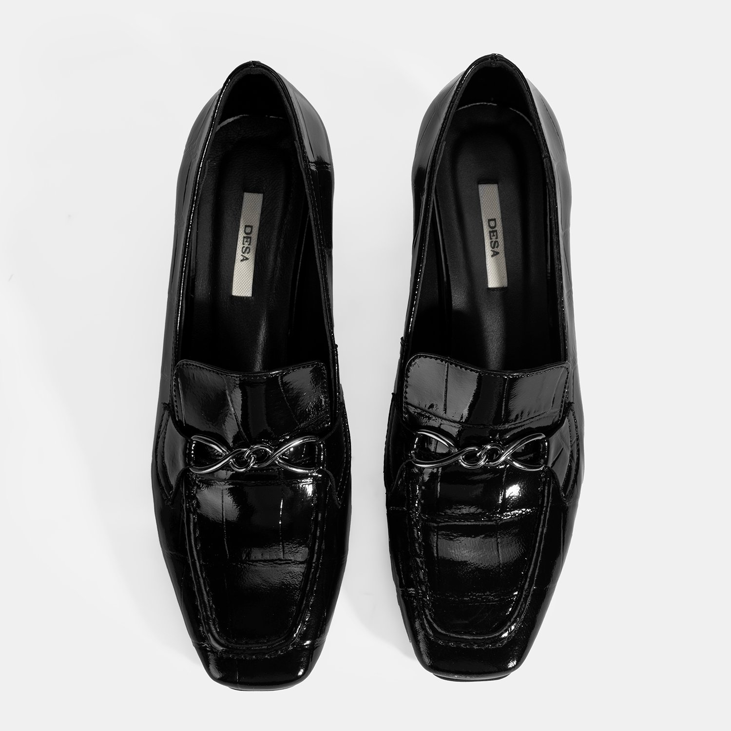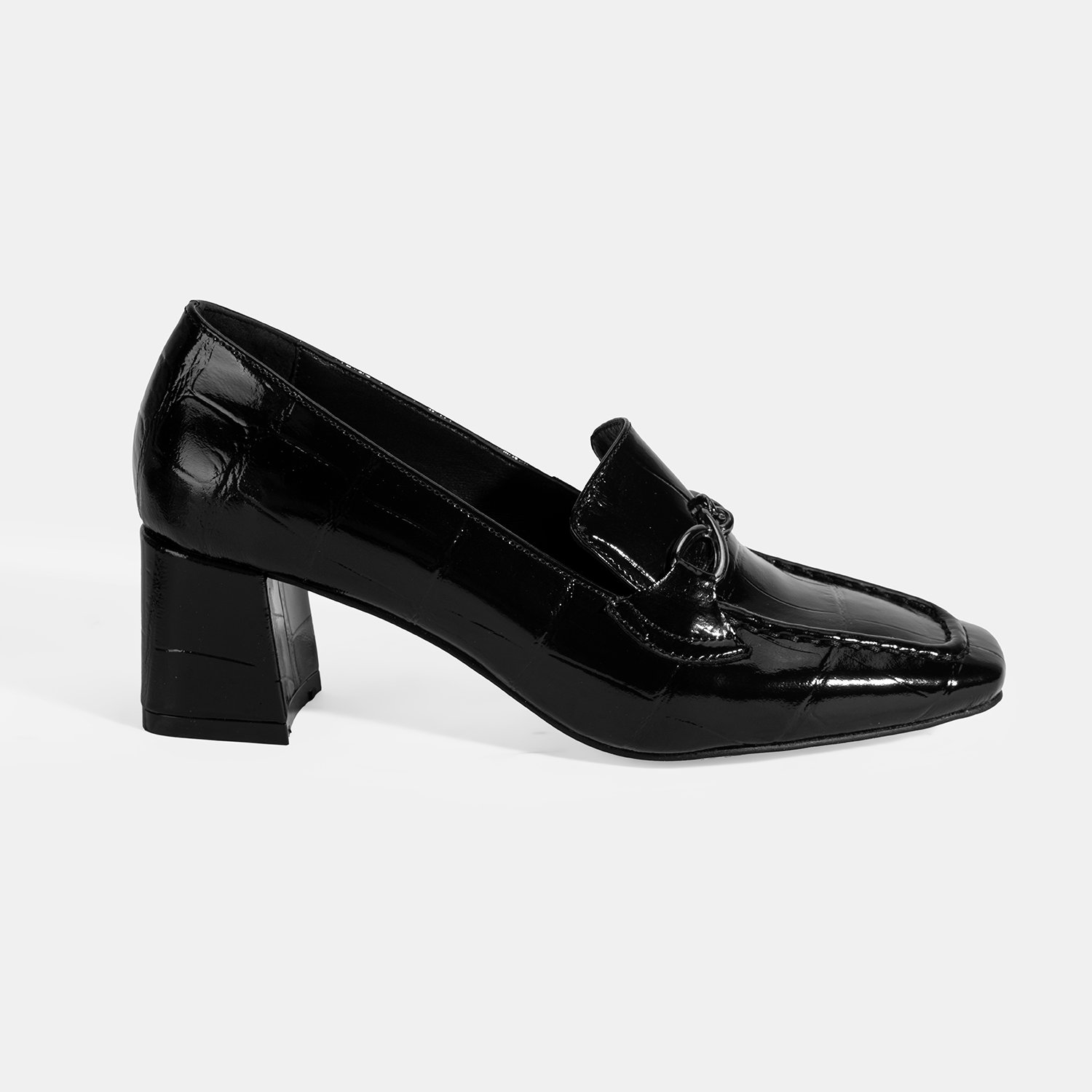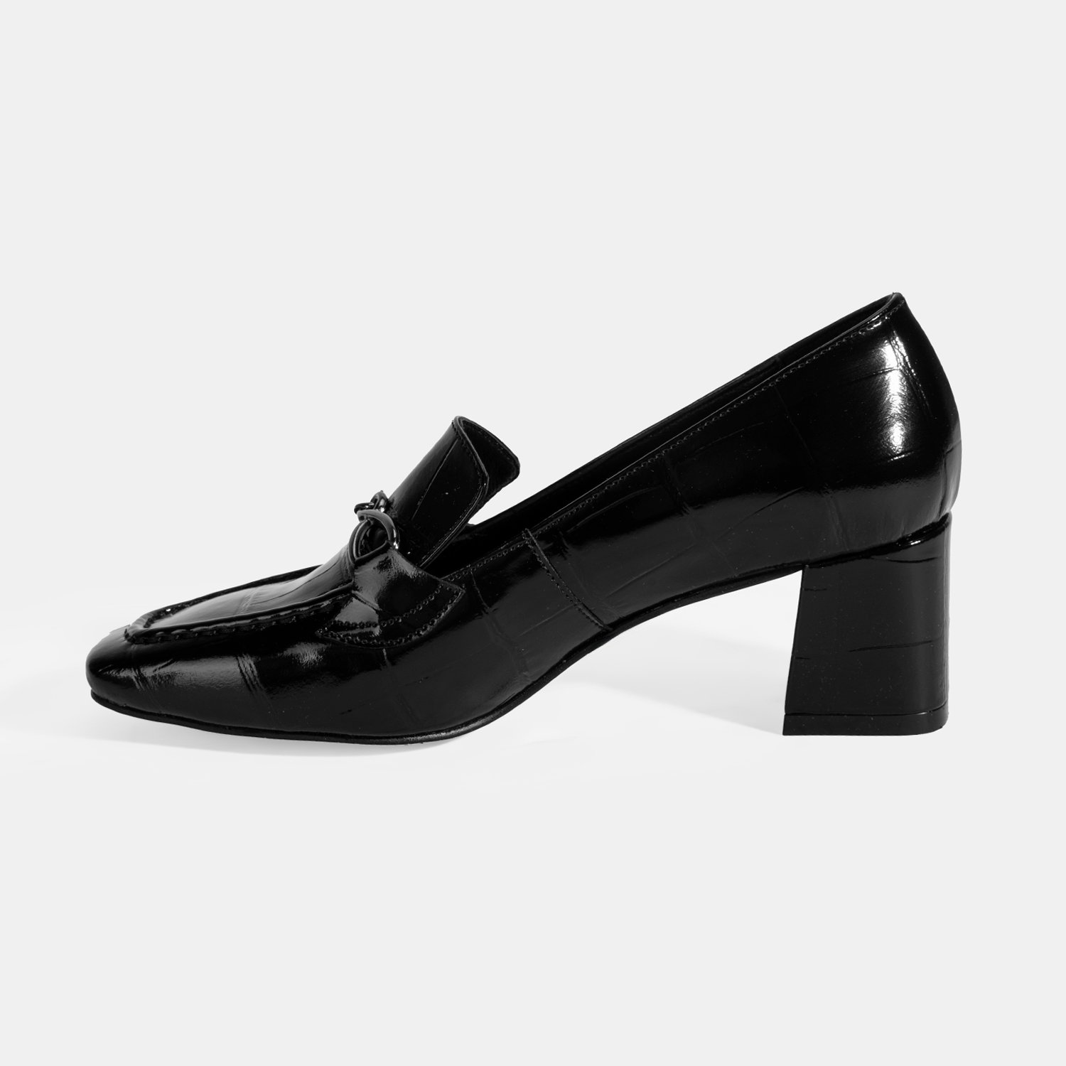 %100 kroko baskılı rugan deri, deri astarlı, deri iç tabanlı, metal toka detaylı, neolit tabanlı, topuklu kadın loafer. Topuk yüksekliği 5 cm