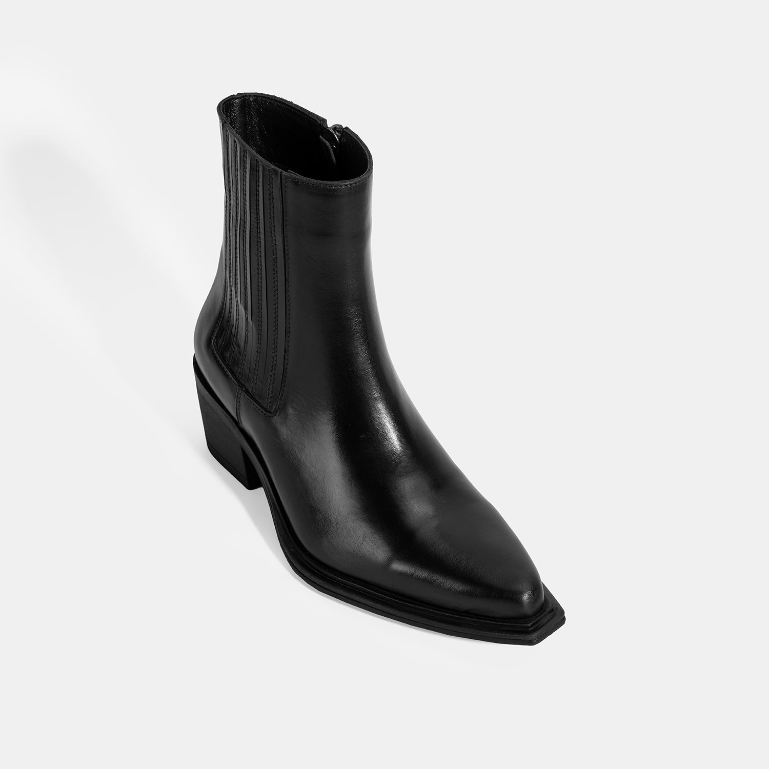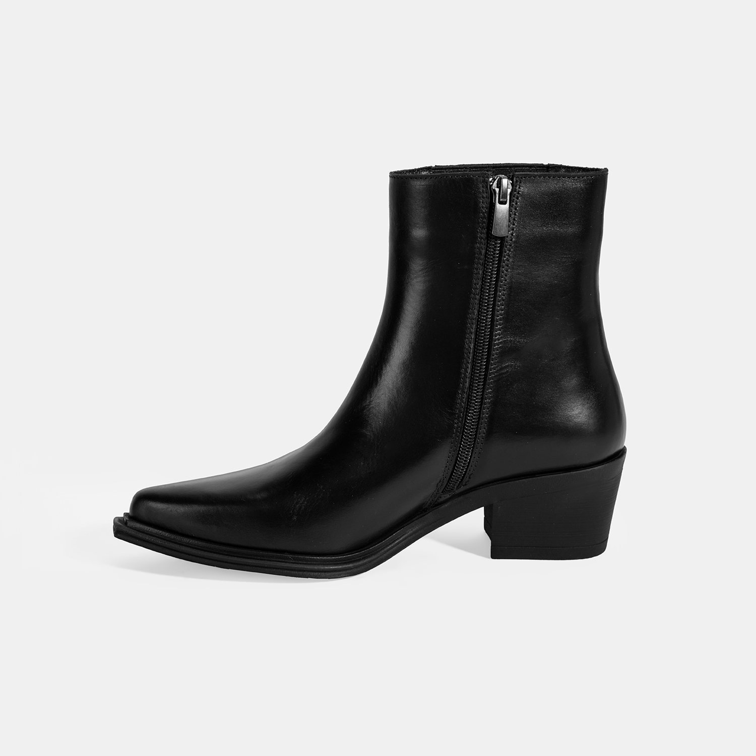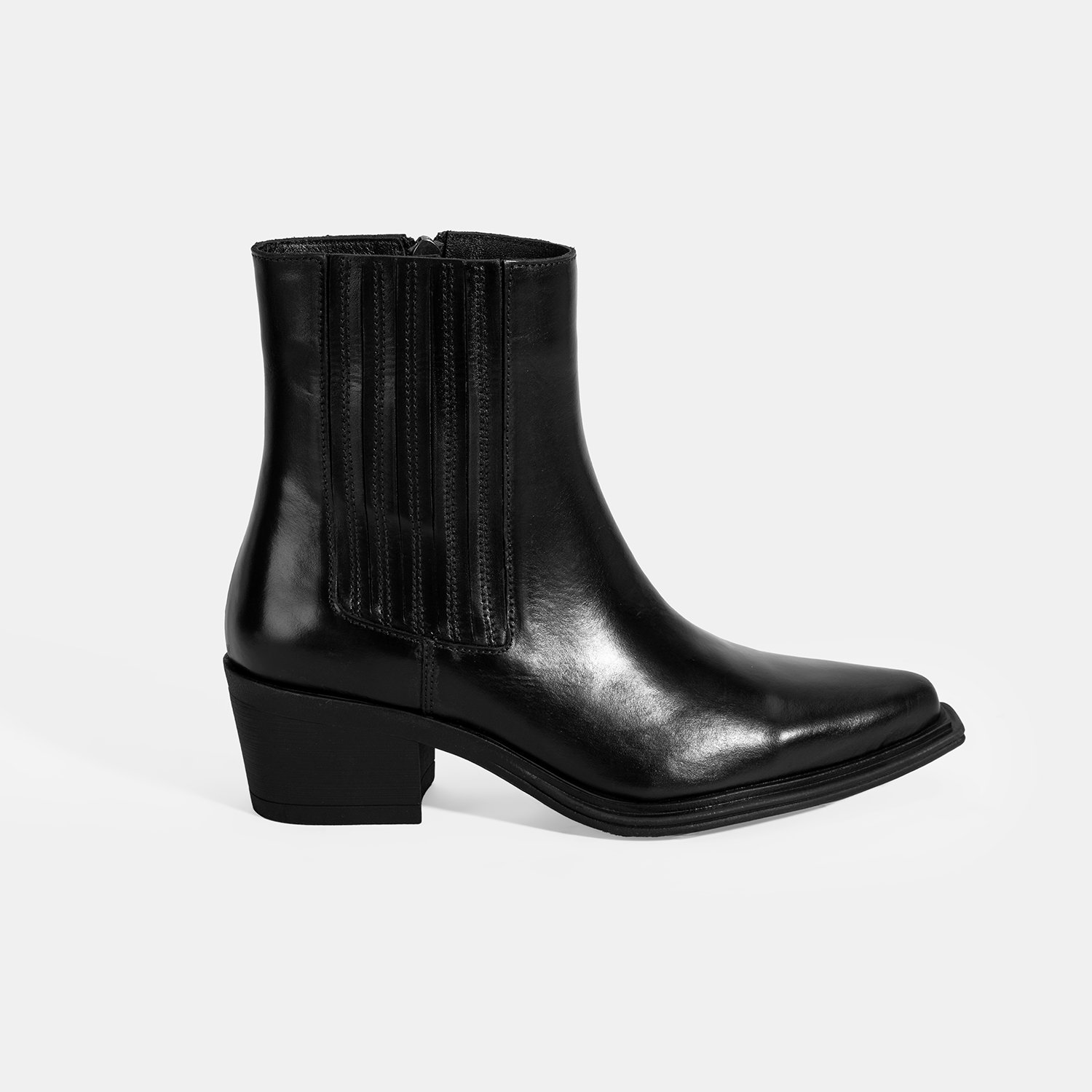 %100 deri, deri iç tabanlı, tekstil astarlı, lastik detaylı, termo tabanlı kadın bot. Topuk yüksekliği: 5,5 cm.