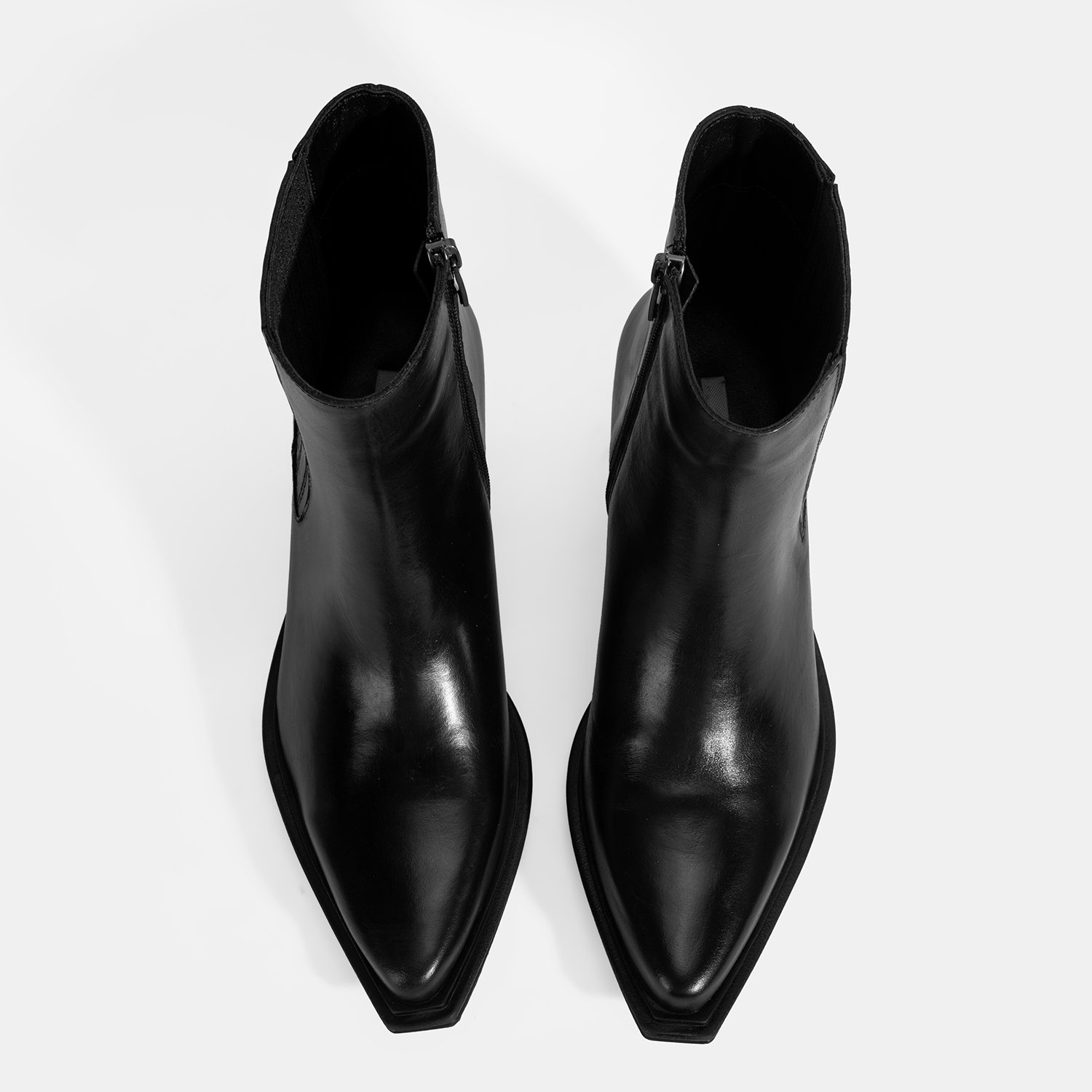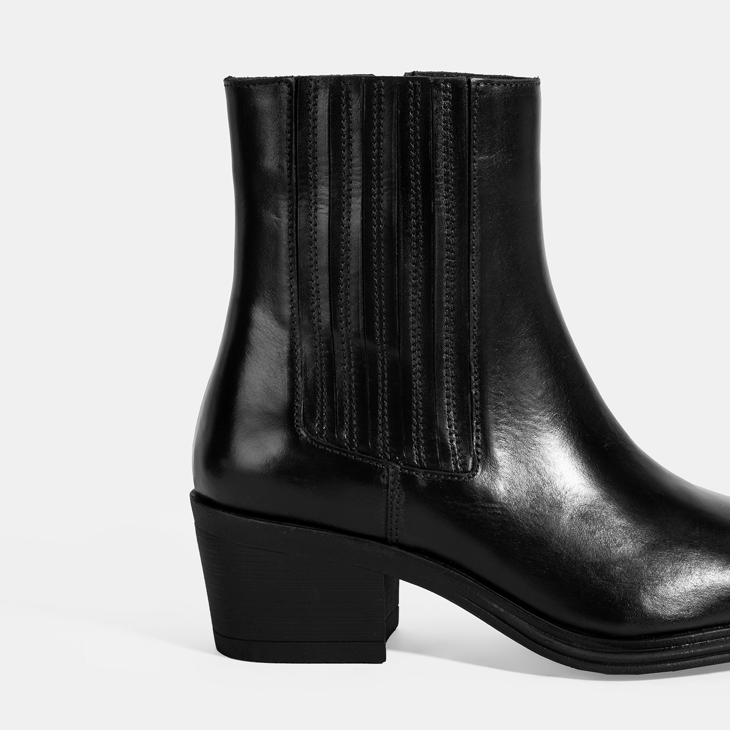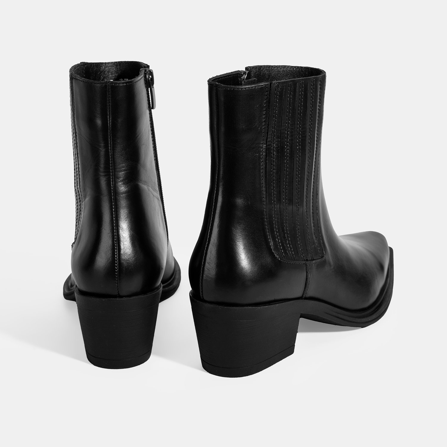 %100 deri, deri iç tabanlı, tekstil astarlı, lastik detaylı, termo tabanlı kadın bot. Topuk yüksekliği: 5,5 cm.
