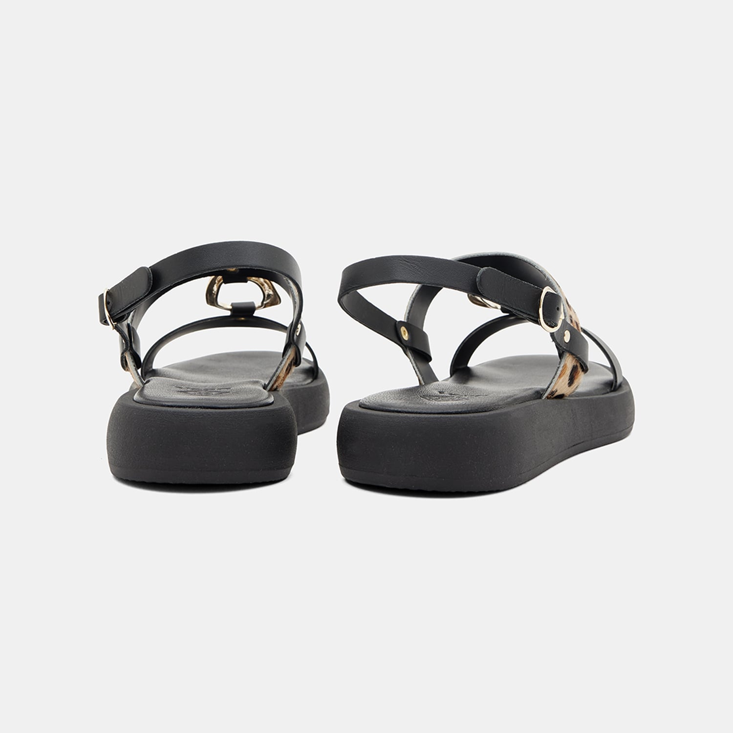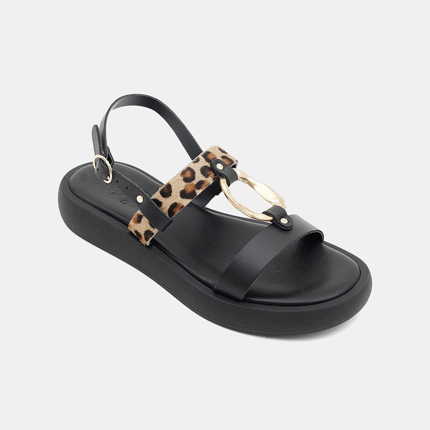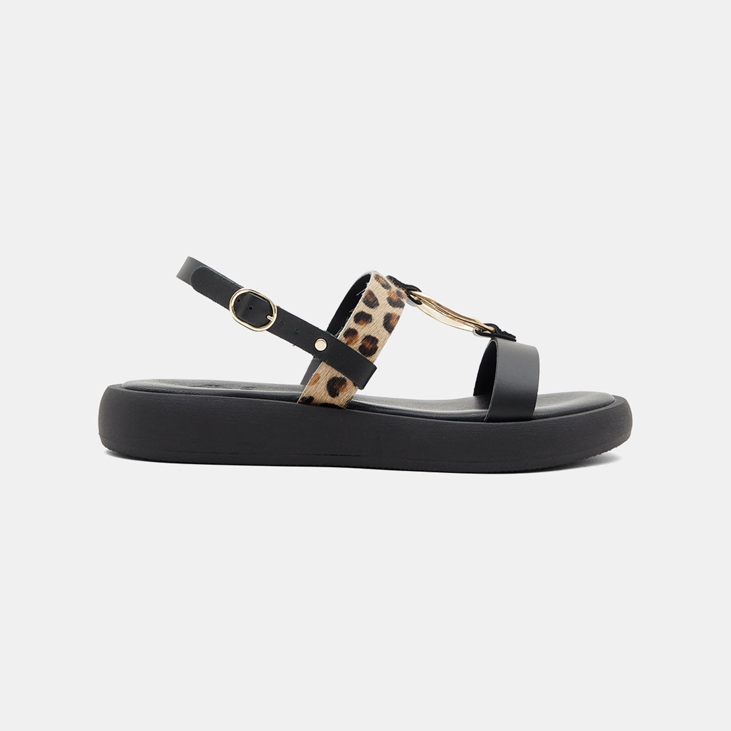 Kadın Siyah Leopar Desenli Tokalı Deri Sandalet