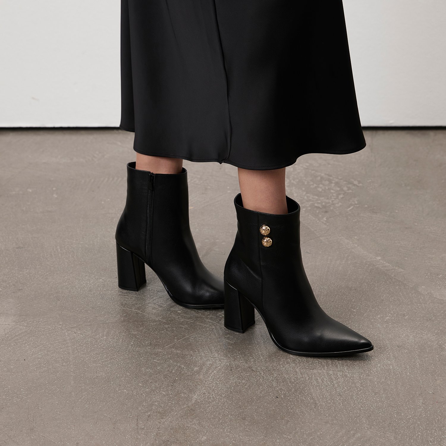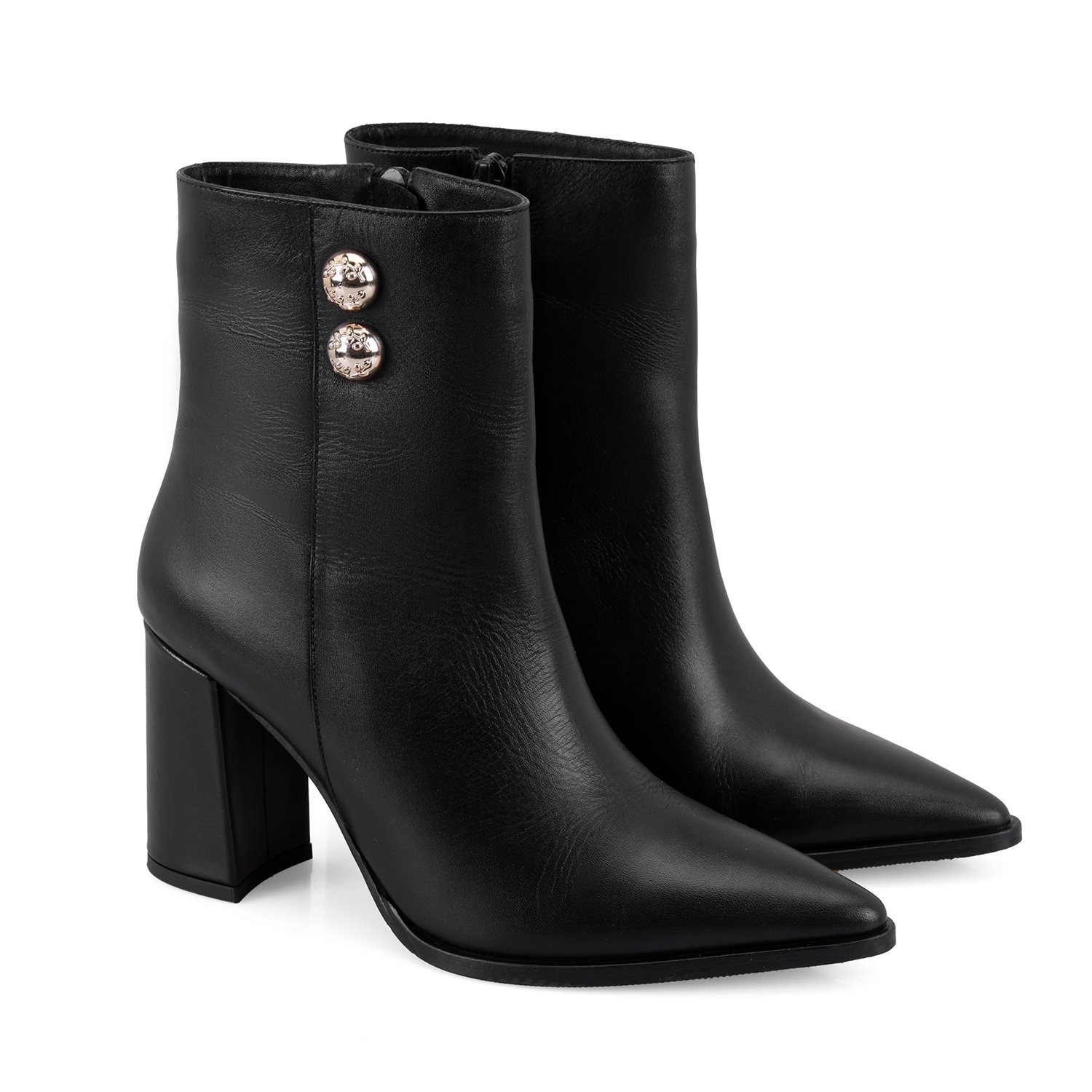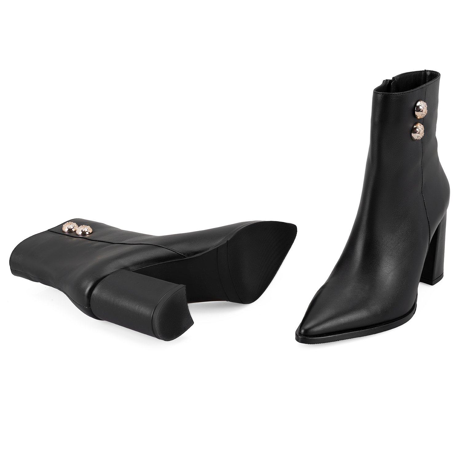 %100 deri, deri iç tabanlı, tekstil astarlı, metal düğme aksesuar detaylı, içten fermuarlı, neolit tabanlı topuklu kadın bot.