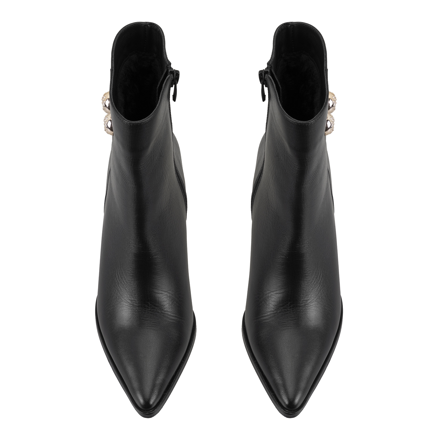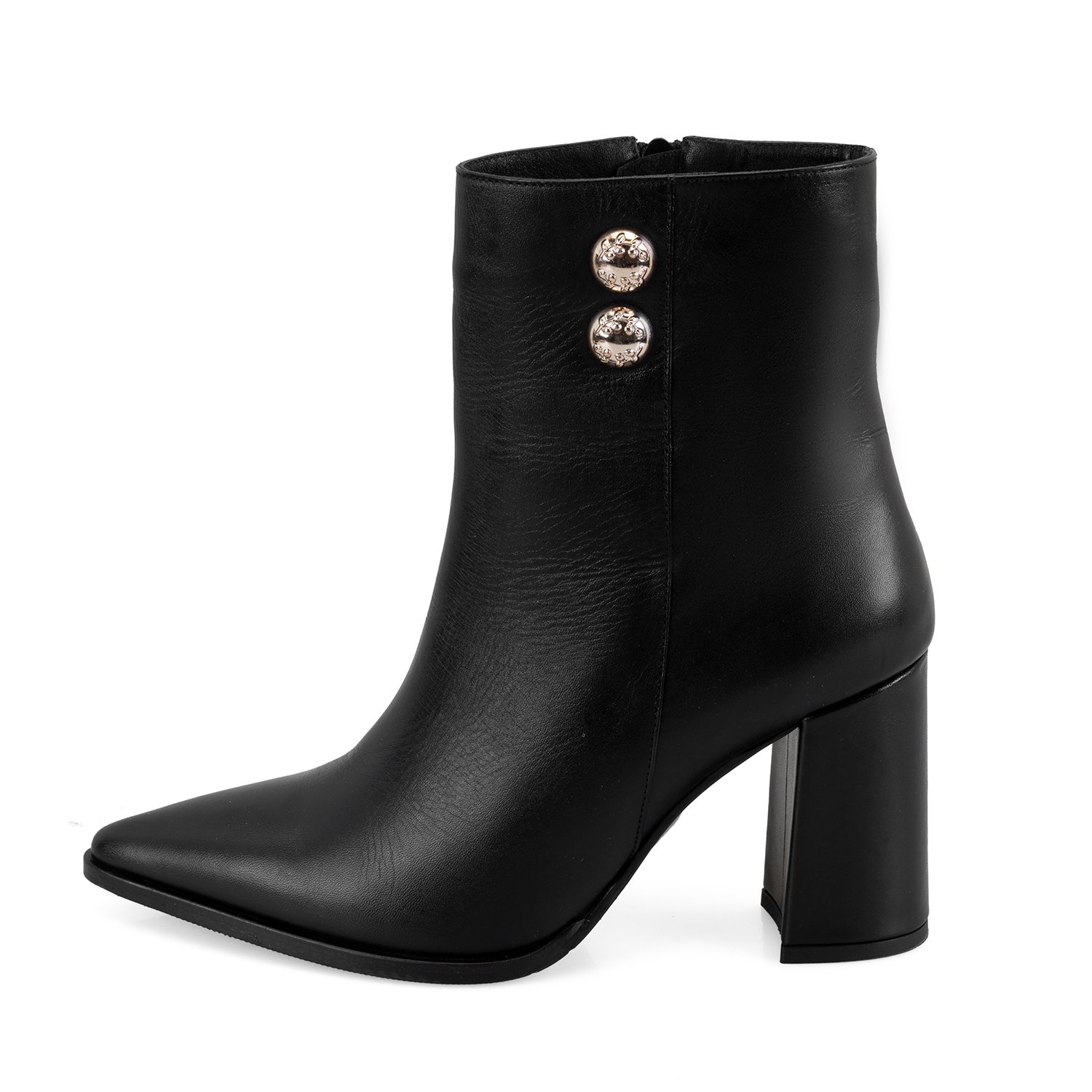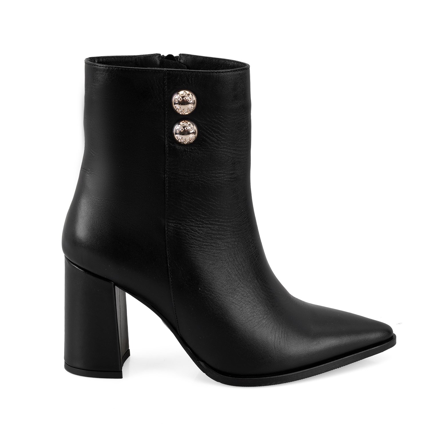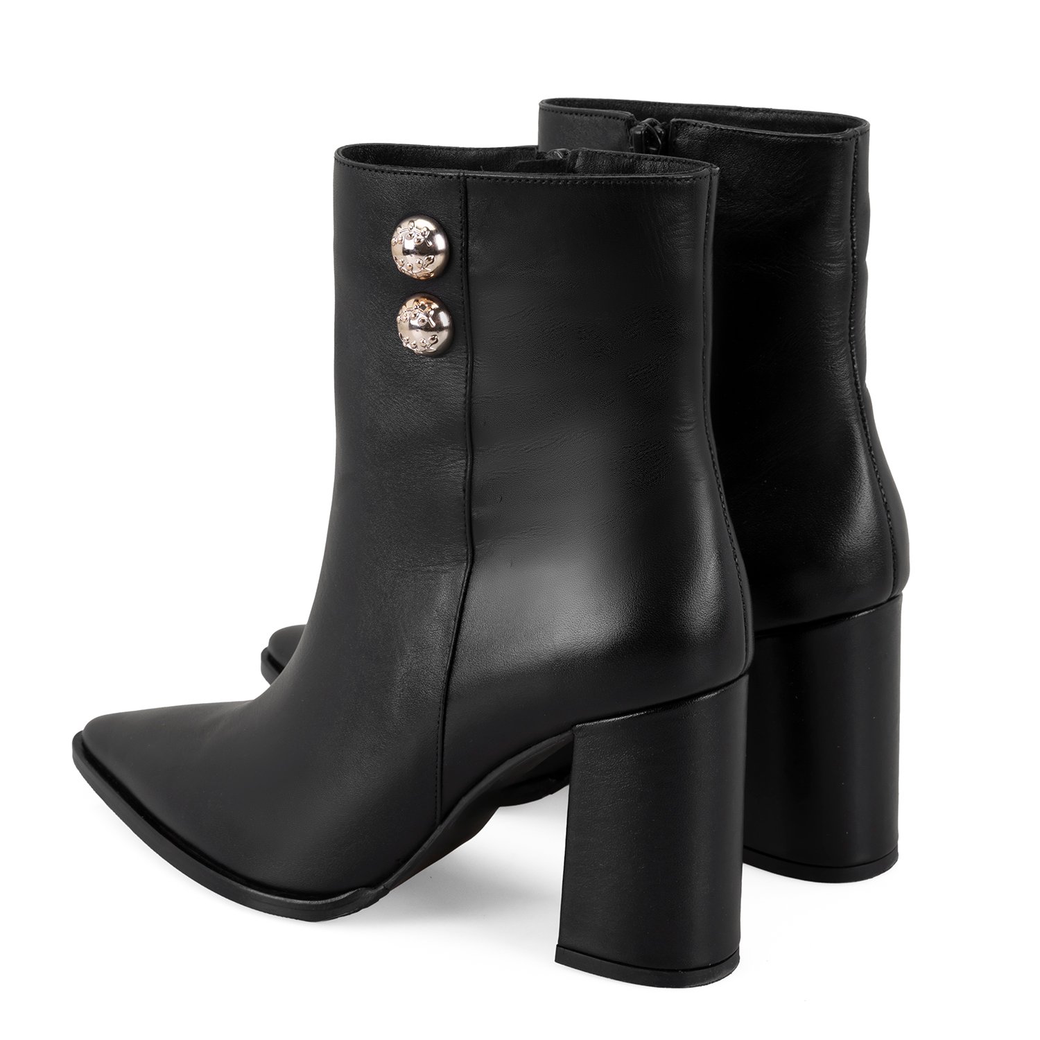 %100 deri, deri iç tabanlı, tekstil astarlı, metal düğme aksesuar detaylı, içten fermuarlı, neolit tabanlı topuklu kadın bot.
