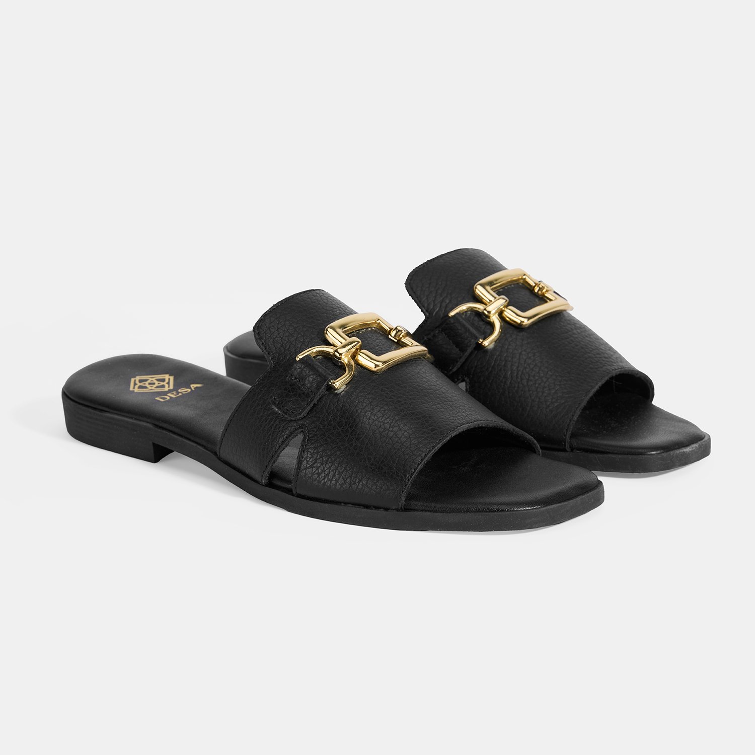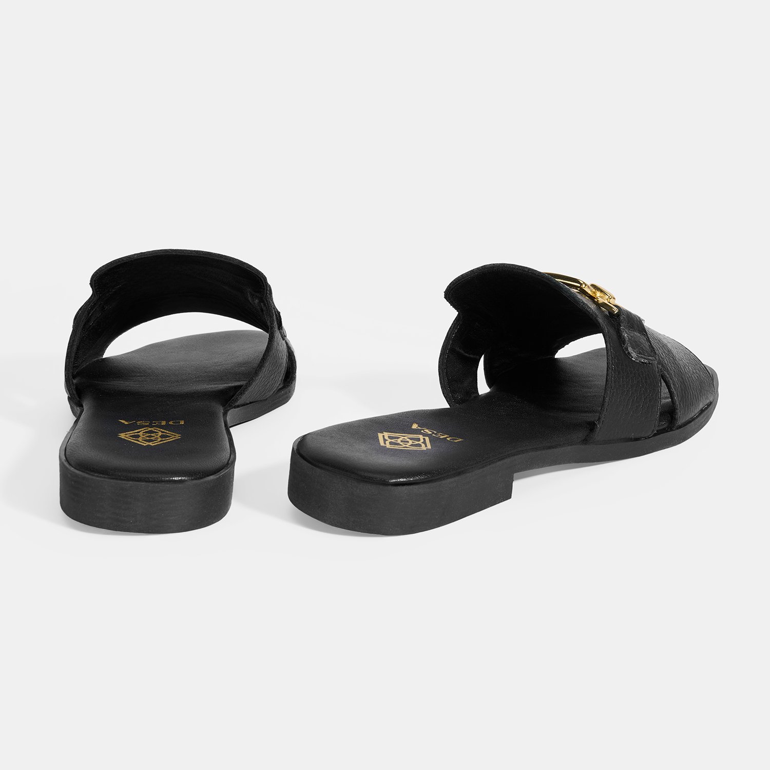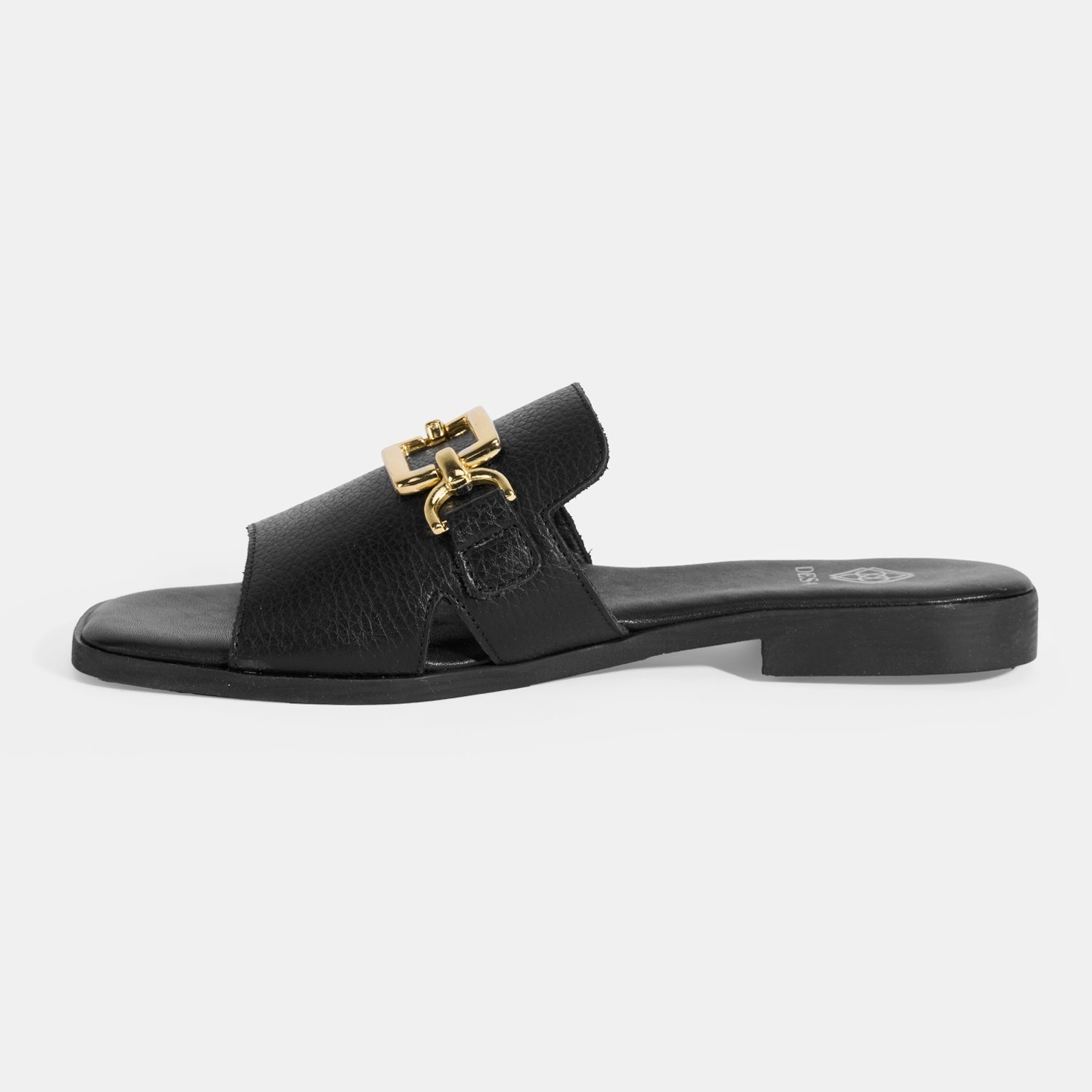 Kadın Siyah Metal Toka Aksesuarlı Deri Terlik