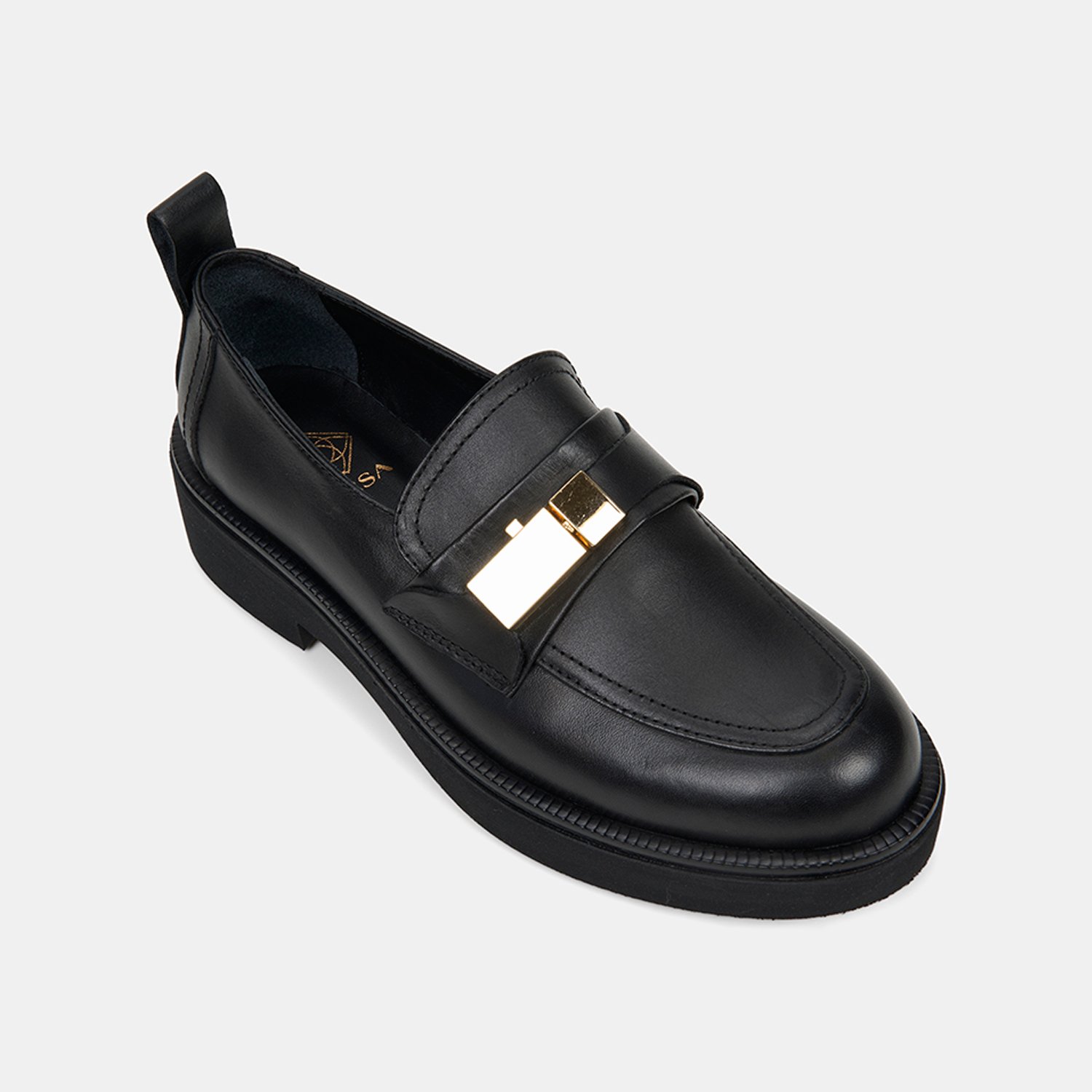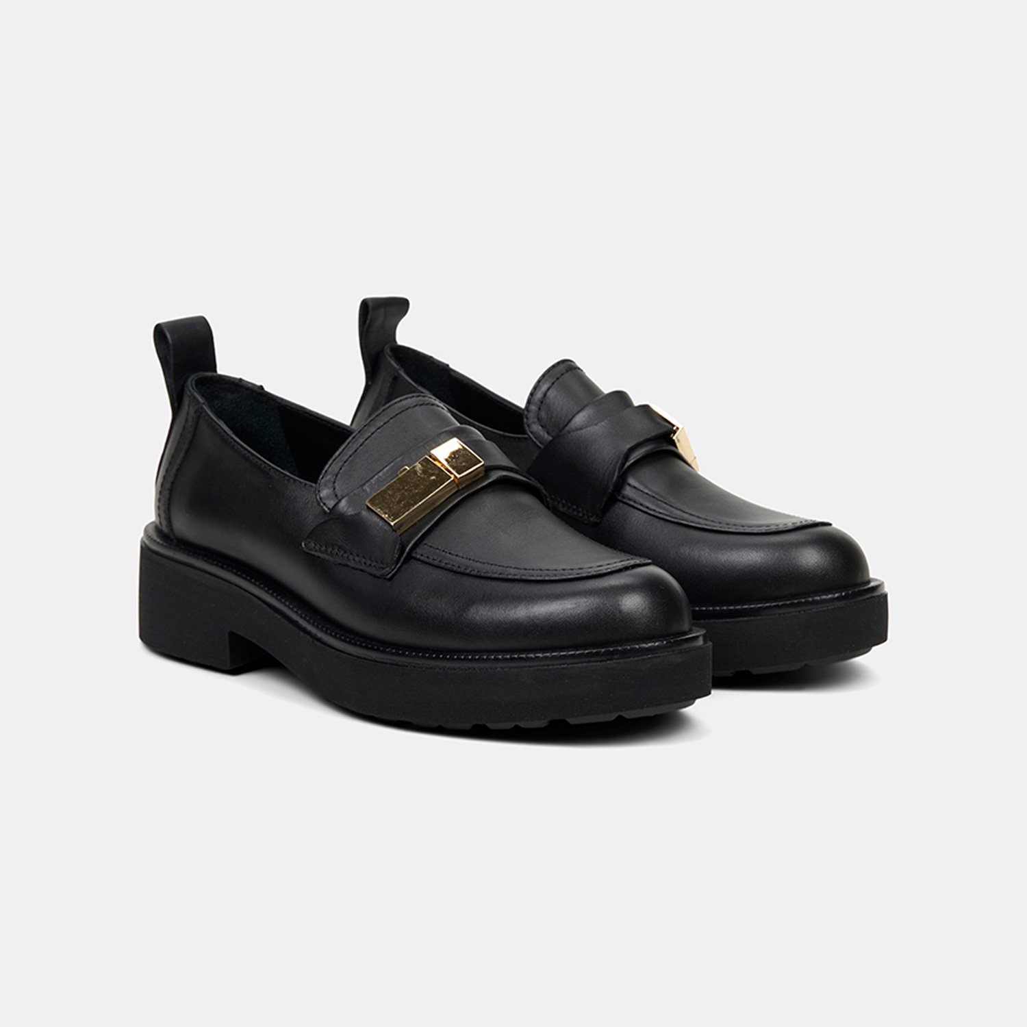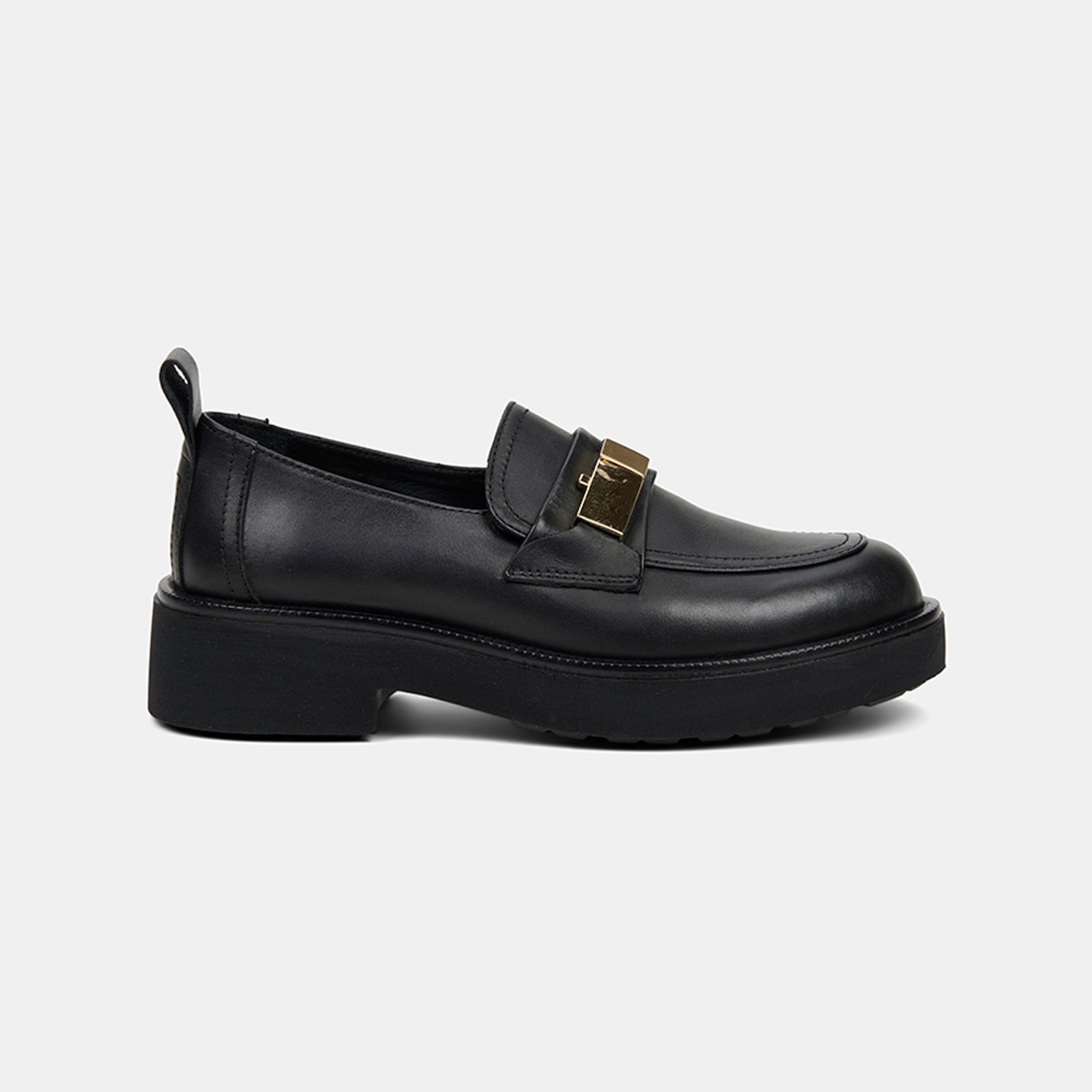 Kadın Siyah Metal Tokalı Kalın Tabanlı Deri Loafer