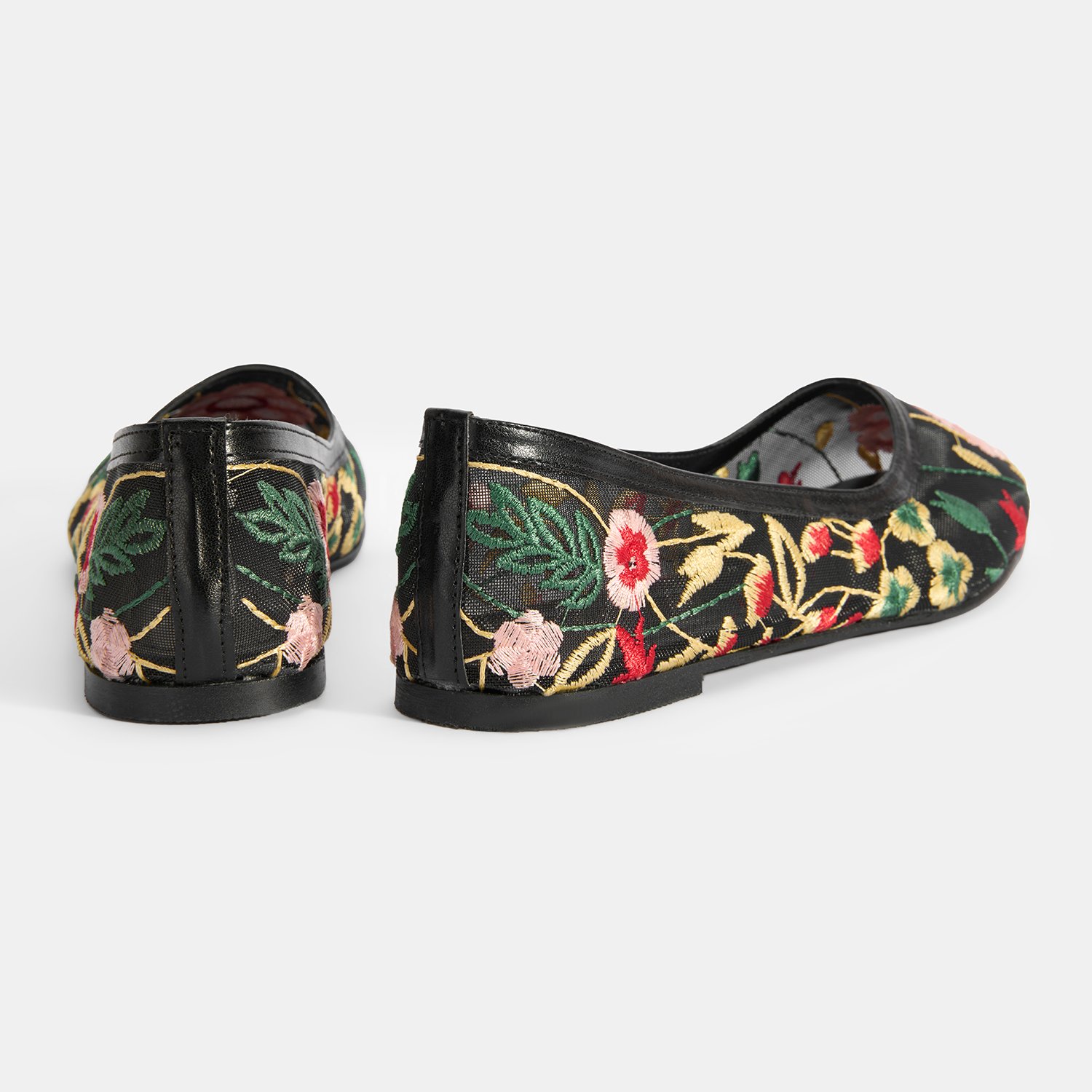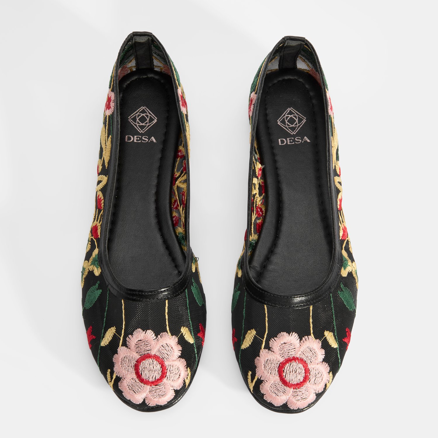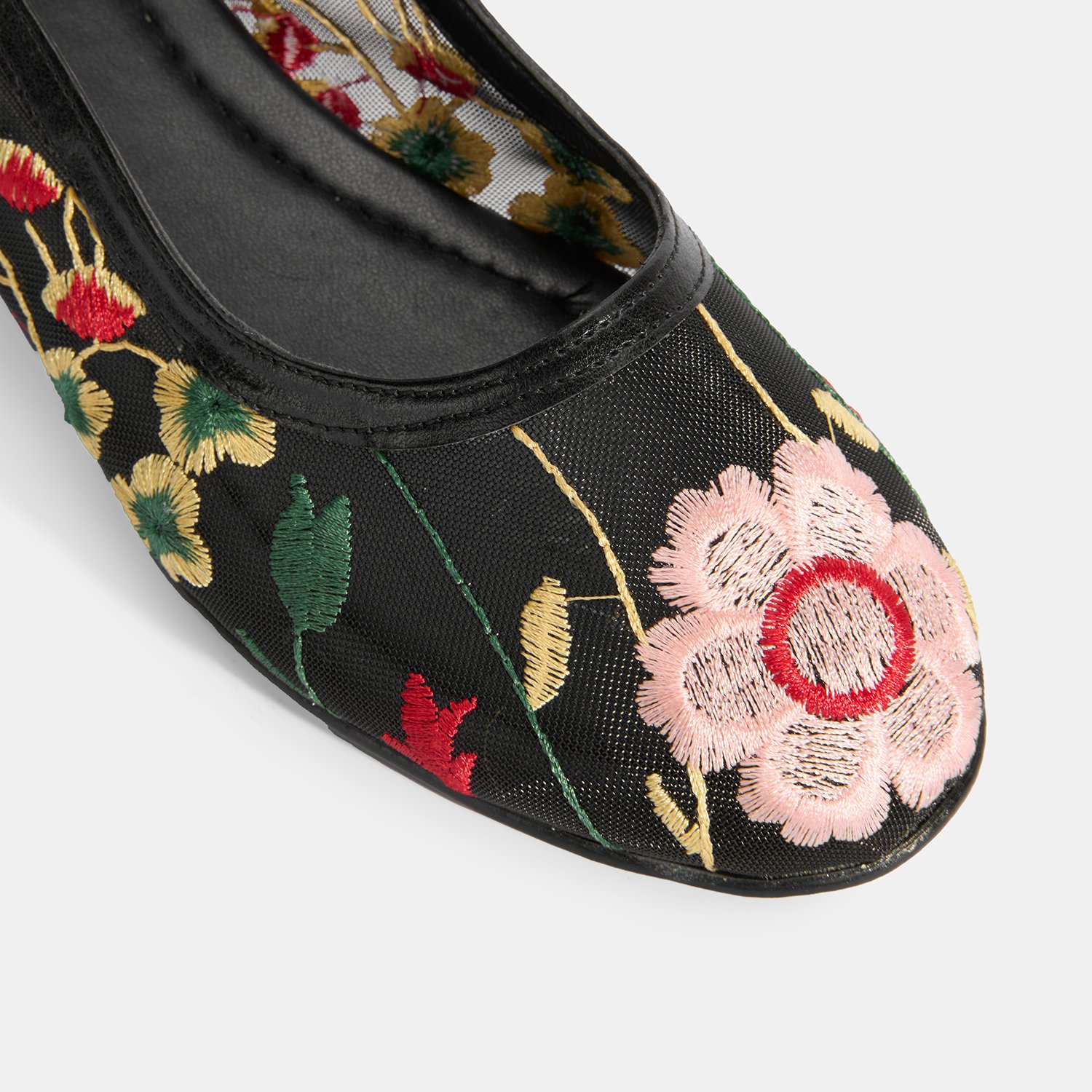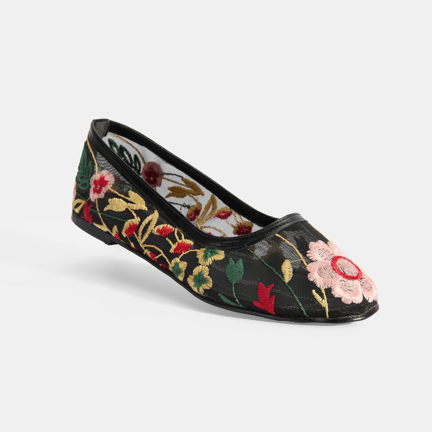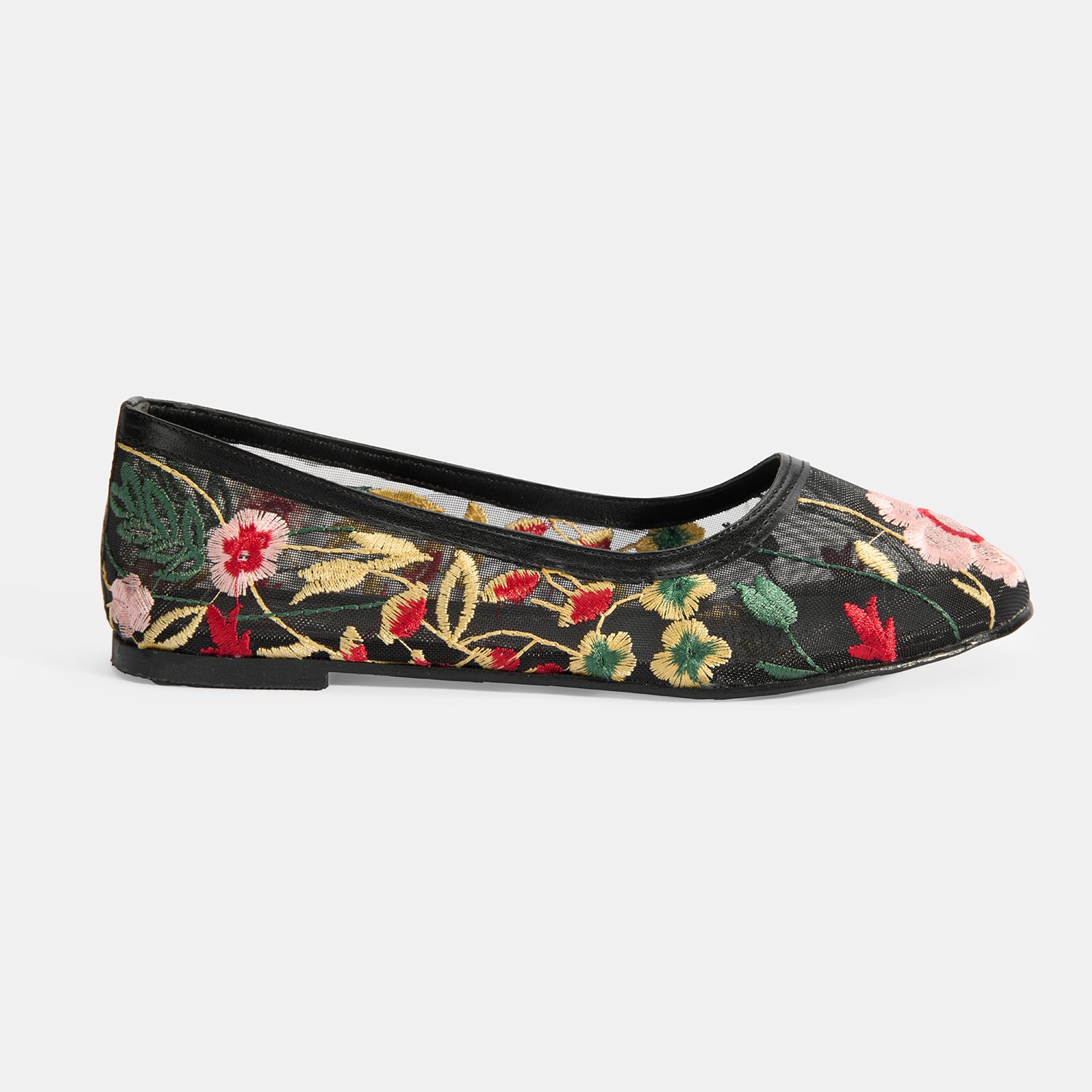 Kadın Siyah Nakış İşleme Detaylı Fileli Babet