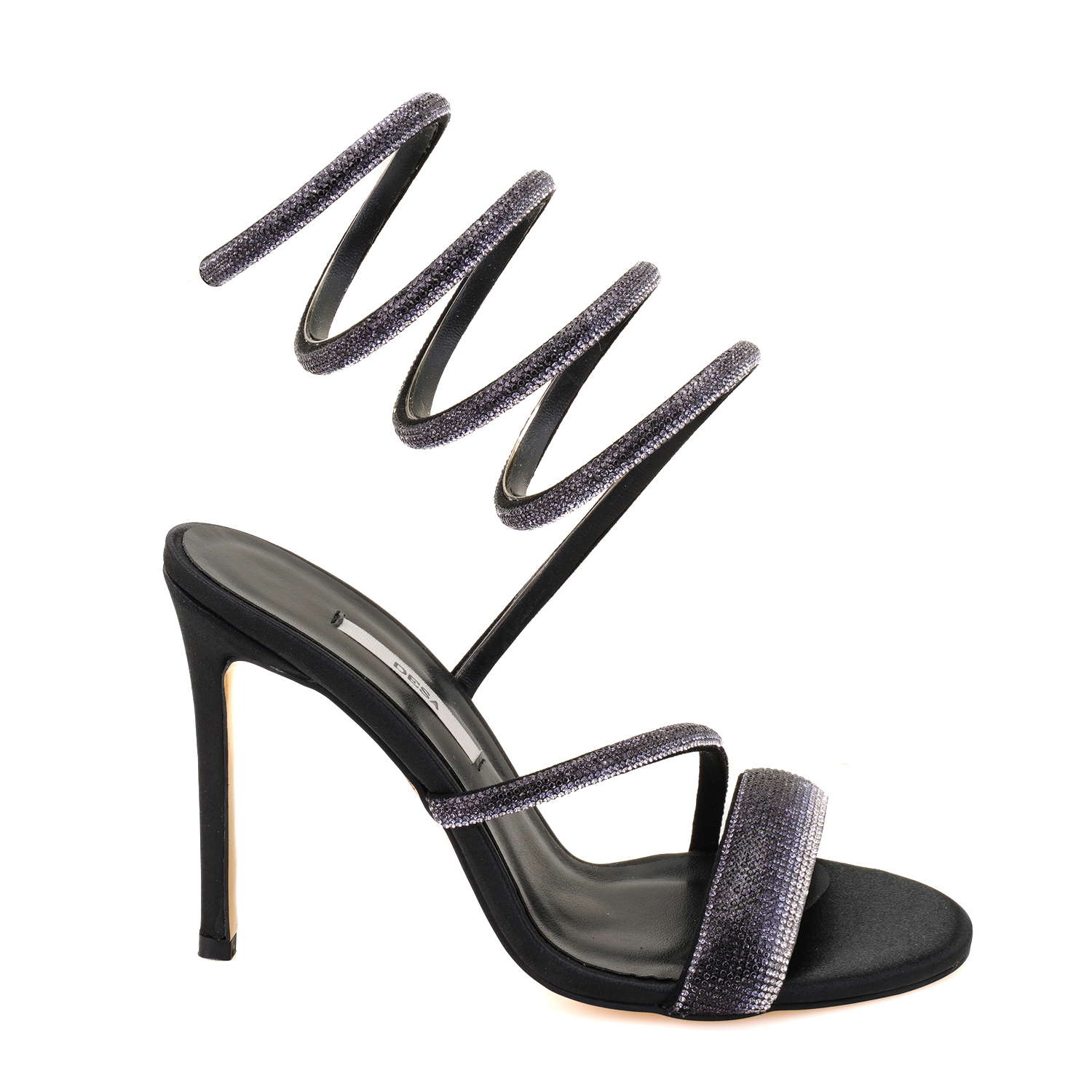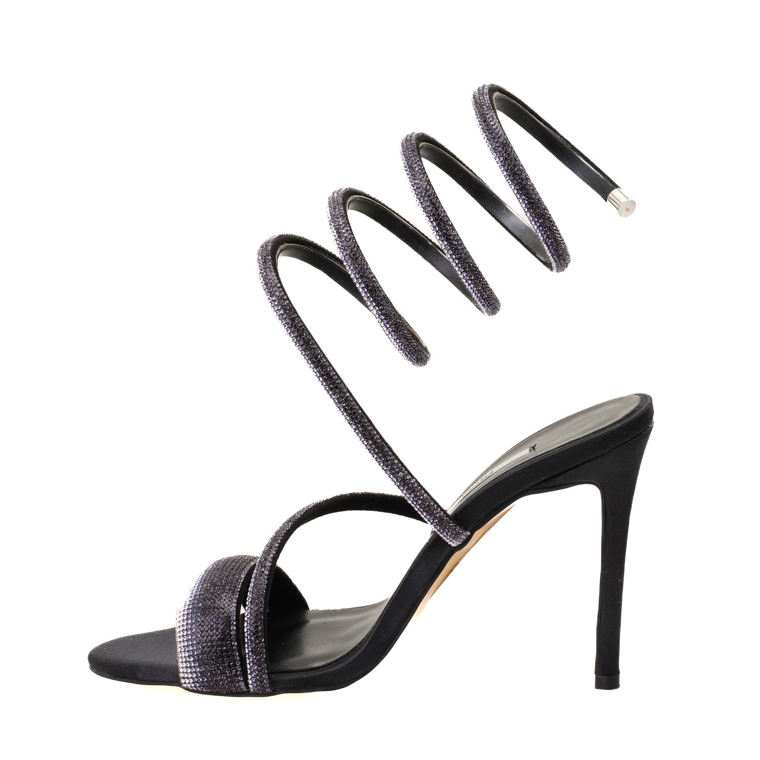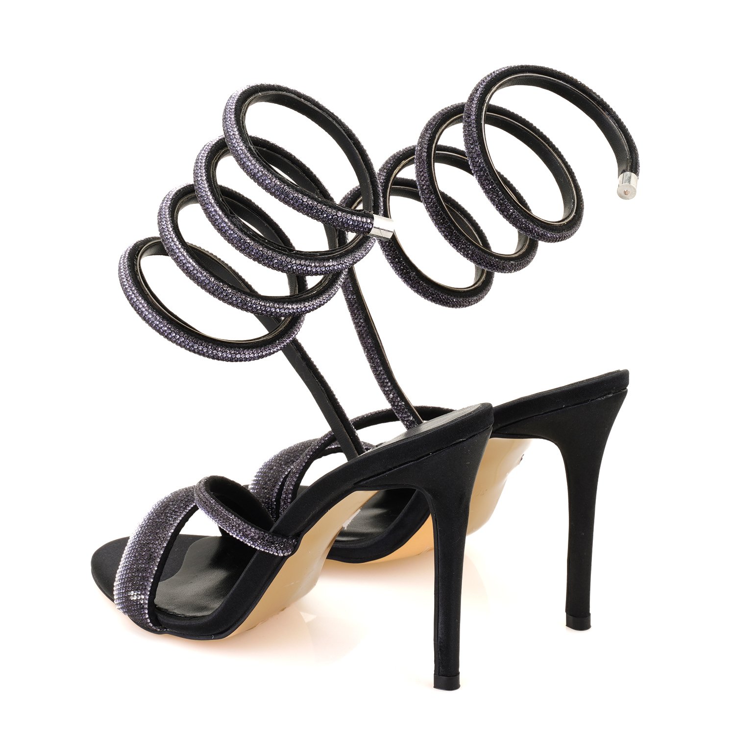 Pu iç astarlı, pu iç tabanlı, bileği saran taşlı spiral detaylı, neolit tabanlı, topuklu kadın sandalet.