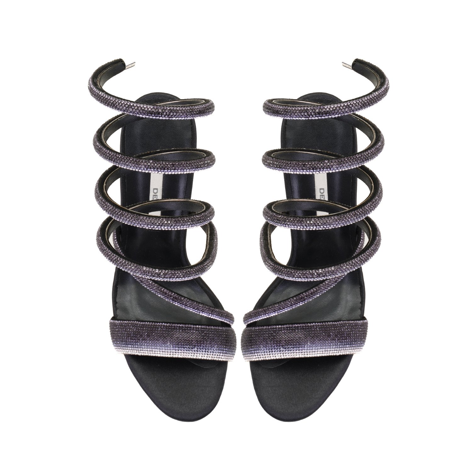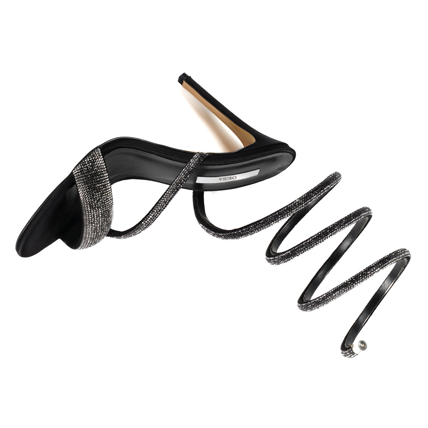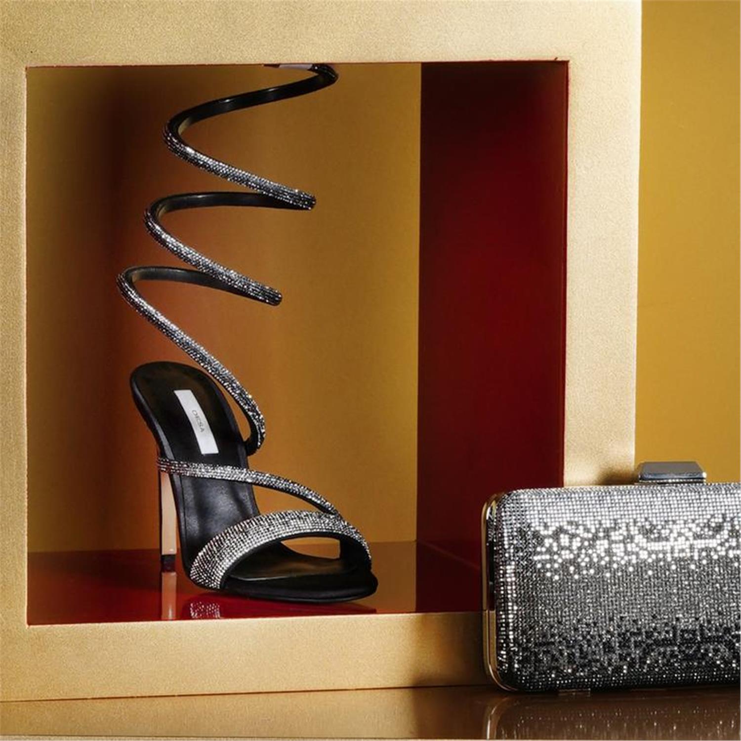 Pu iç astarlı, pu iç tabanlı, bileği saran taşlı spiral detaylı, neolit tabanlı, topuklu kadın sandalet.