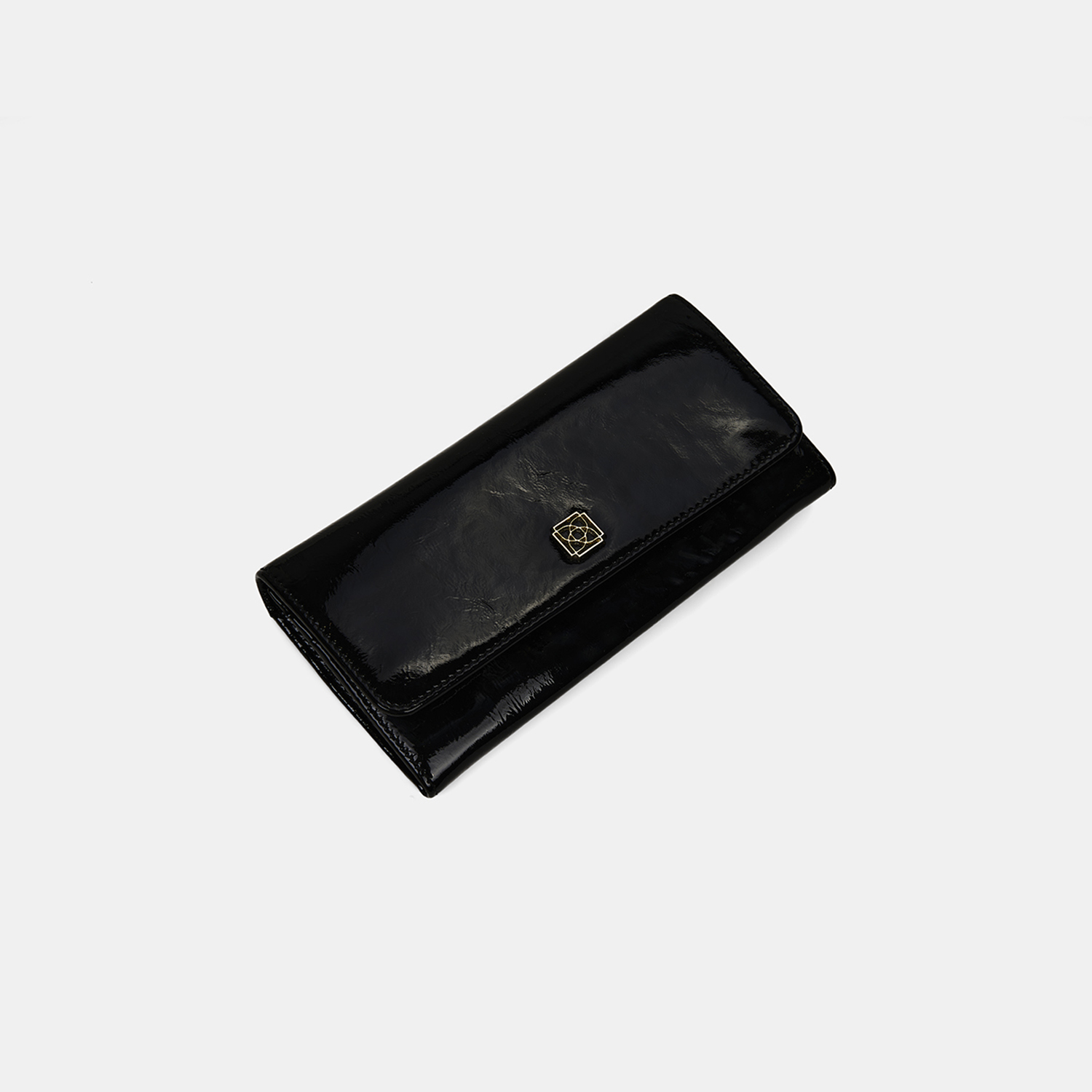 Kapaklı ve yatay formda tasarlanmış rugan deri kadın cüzdan.