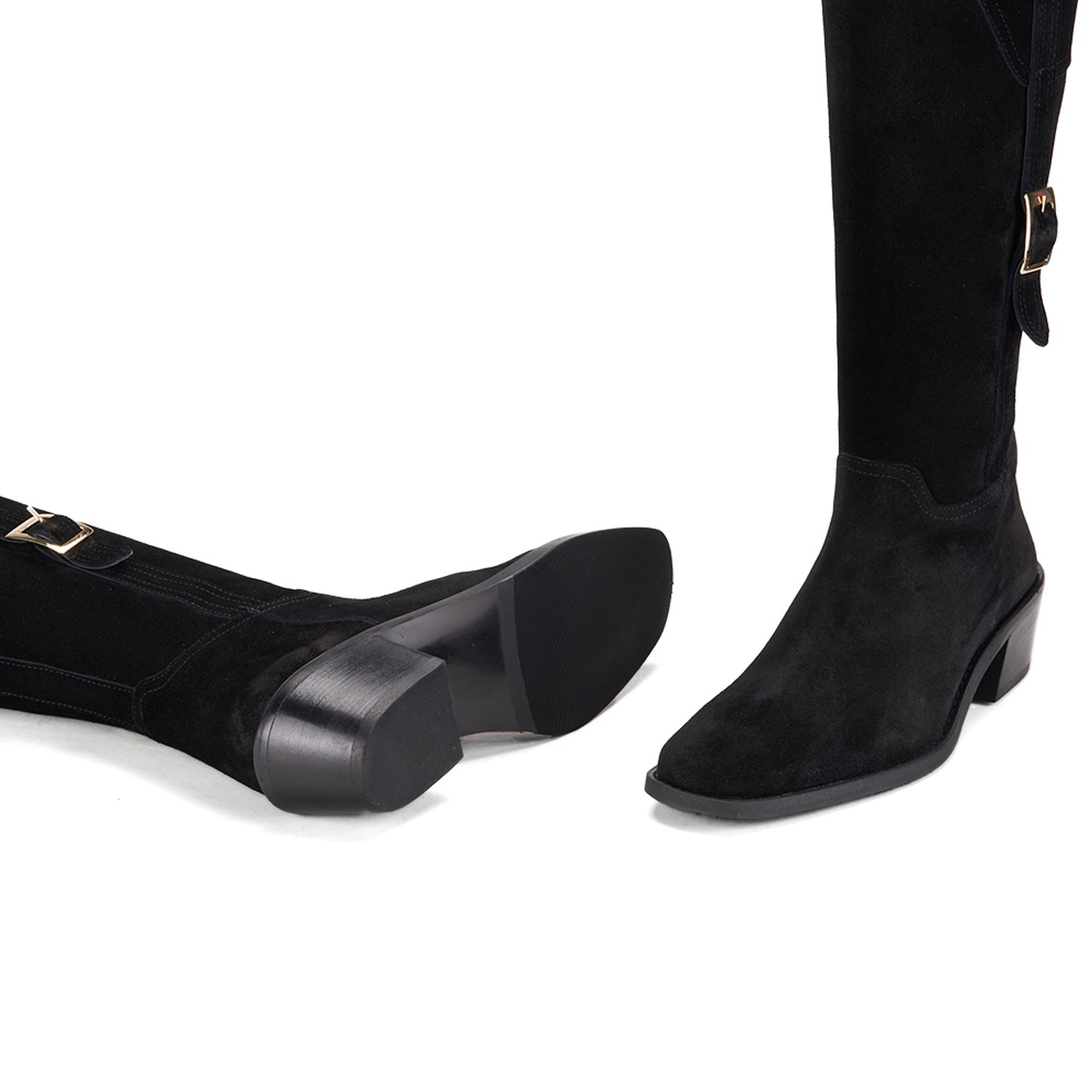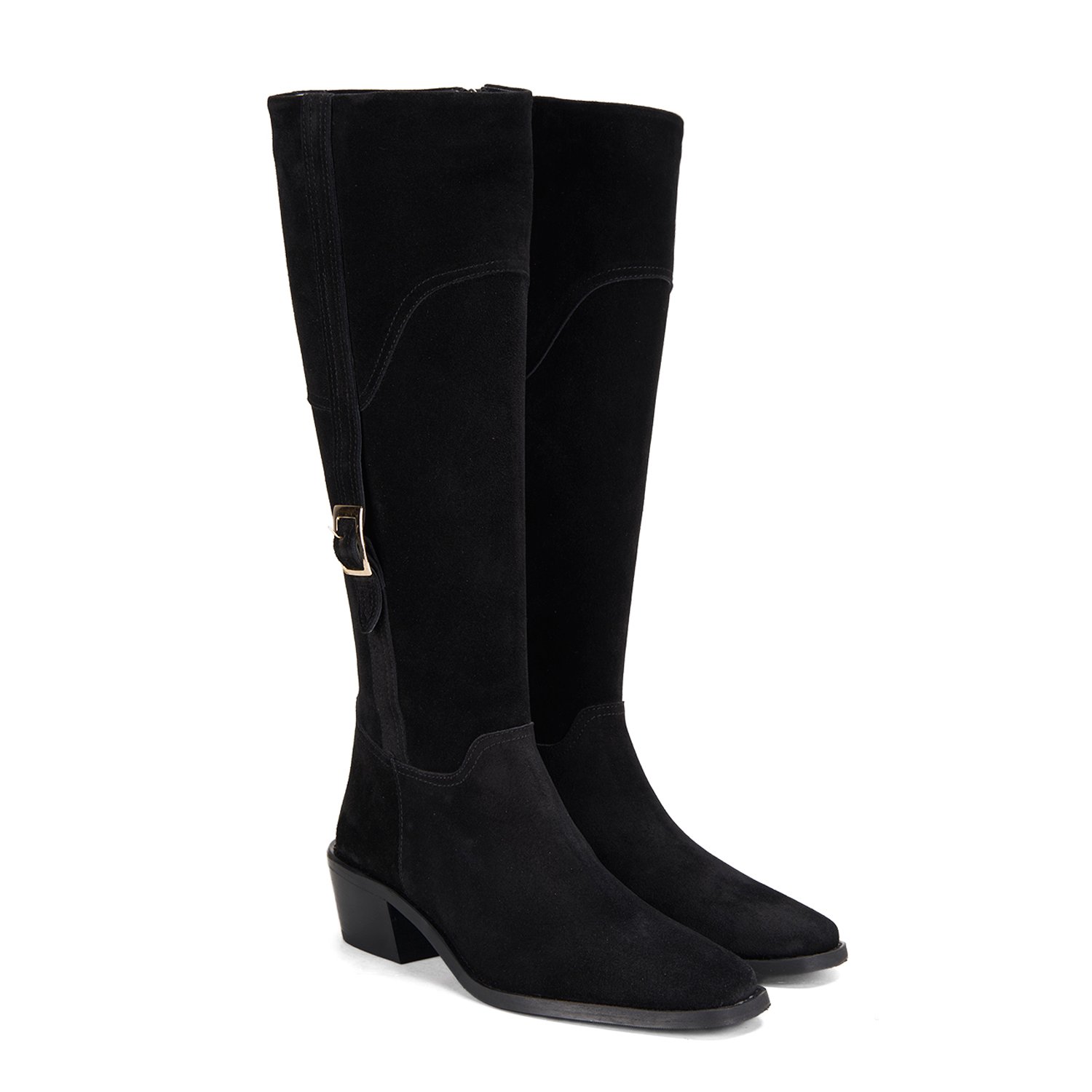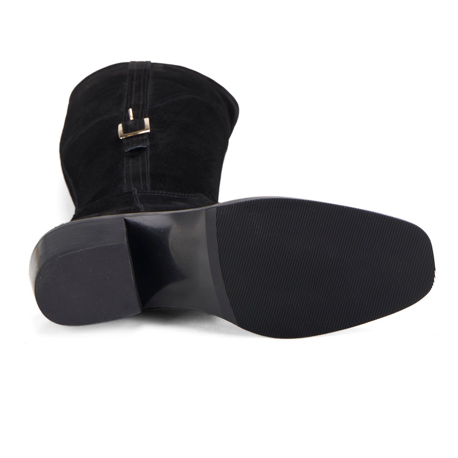 %100 süet deri, deri iç tabanlı, deri astarlı, jurdan tabanlı, metal toka akseusar detaylı, kadın çizme. Topuk yüksekliği 4.5cm, konç yüksekliği 38 cm