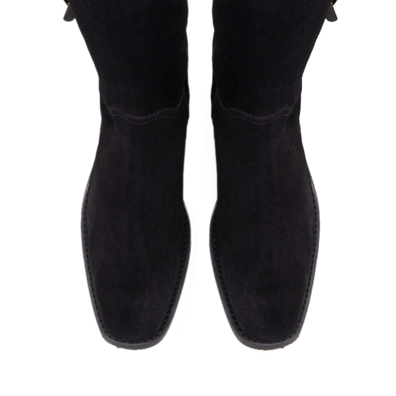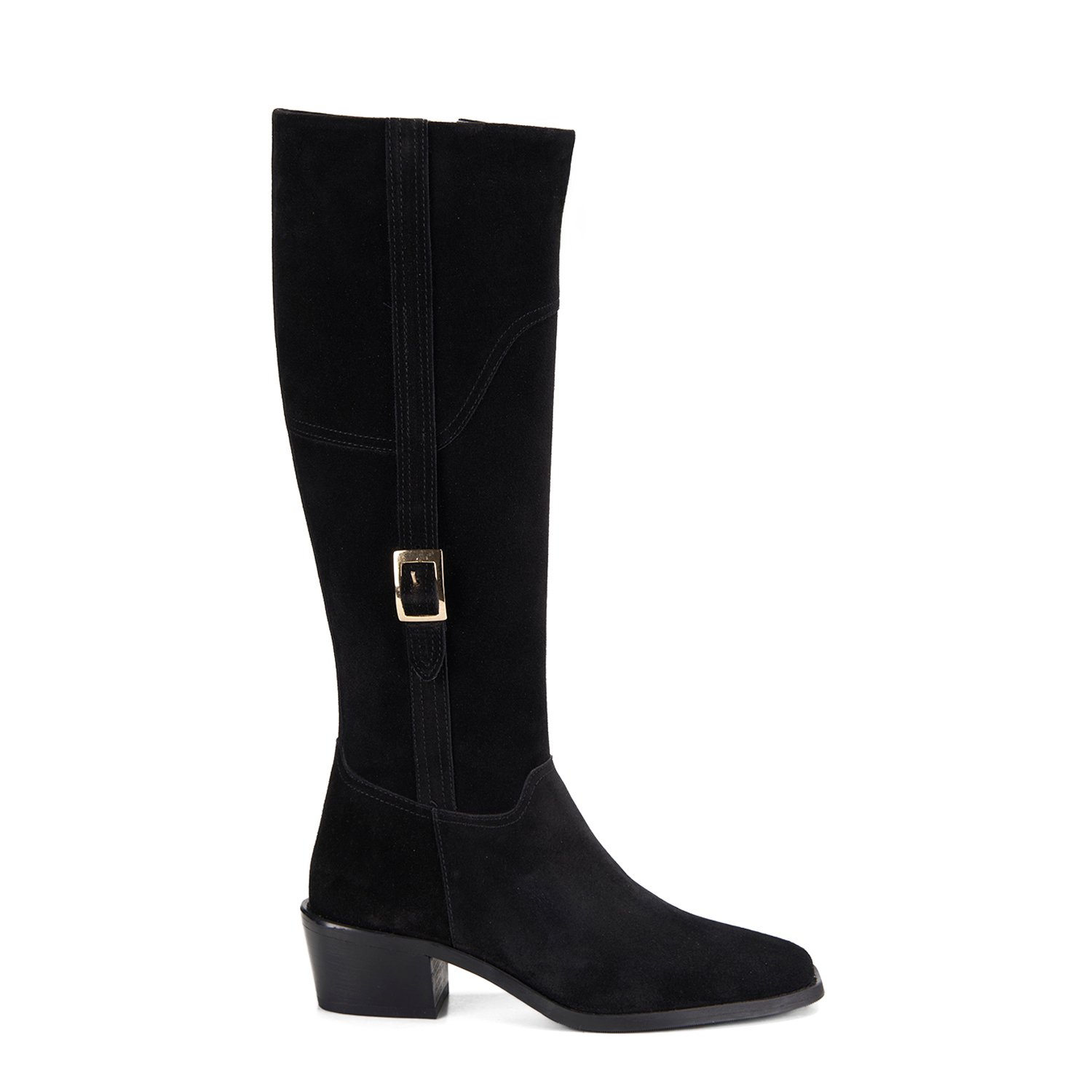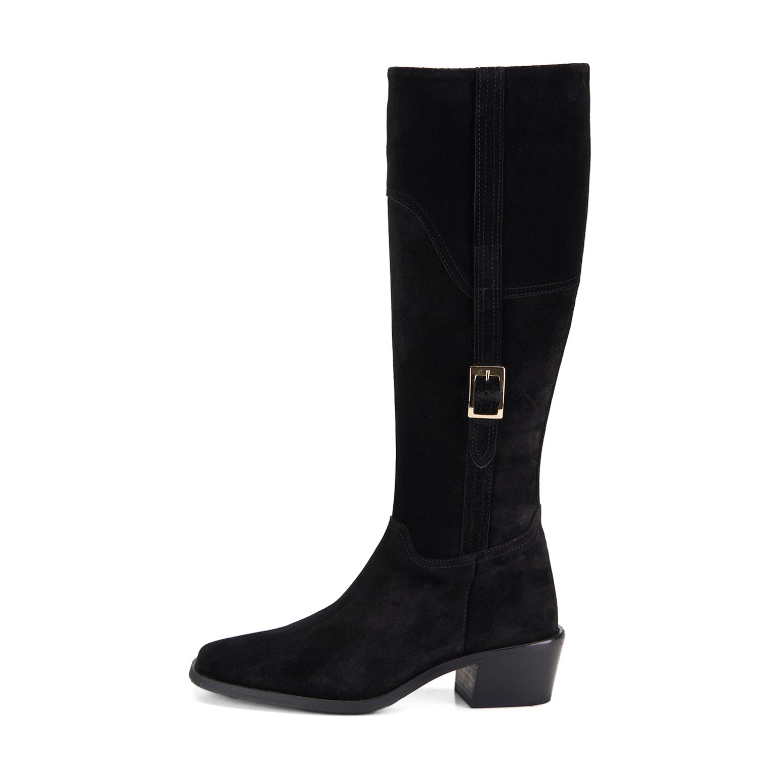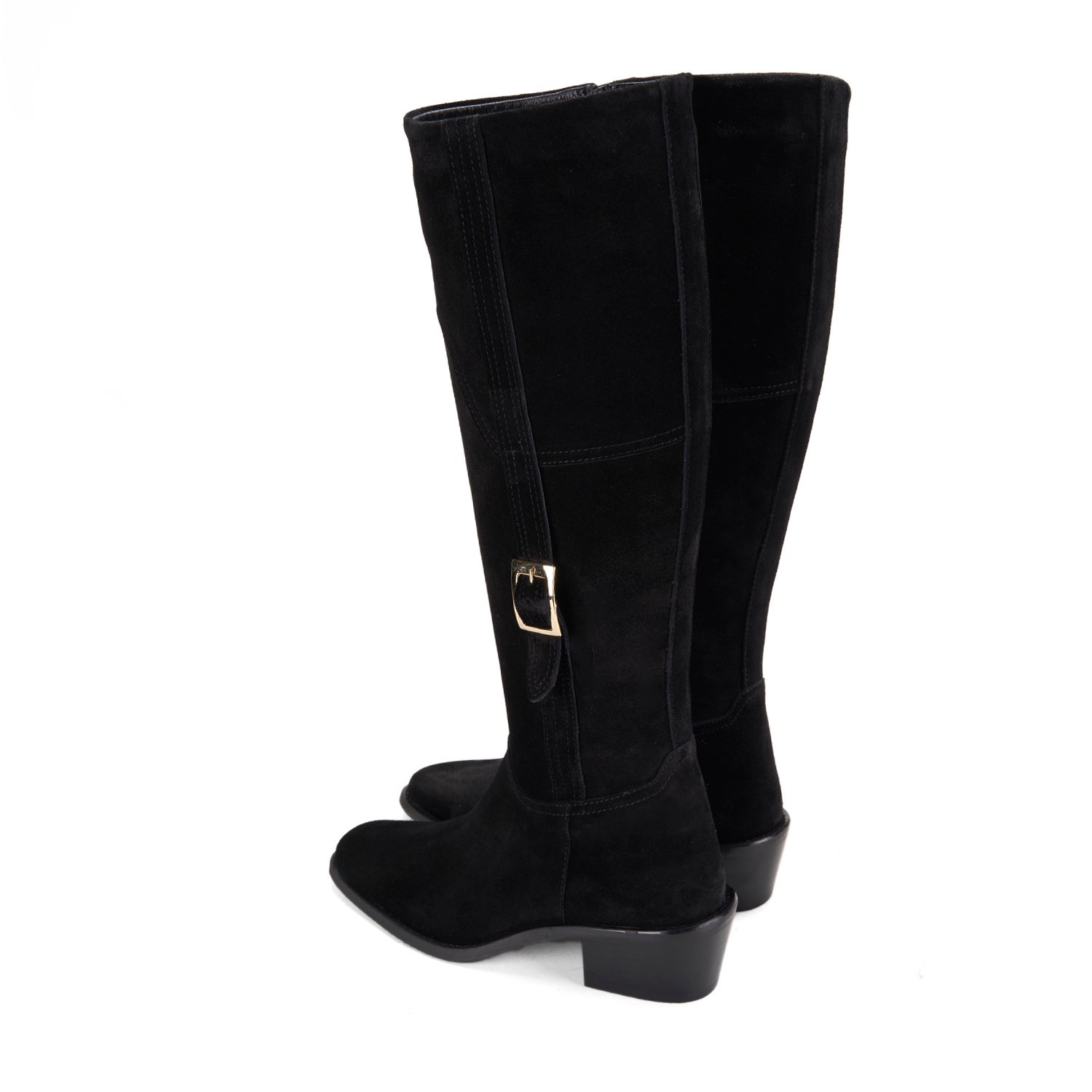 %100 süet deri, deri iç tabanlı, deri astarlı, jurdan tabanlı, metal toka akseusar detaylı, kadın çizme. Topuk yüksekliği 4.5cm, konç yüksekliği 38 cm