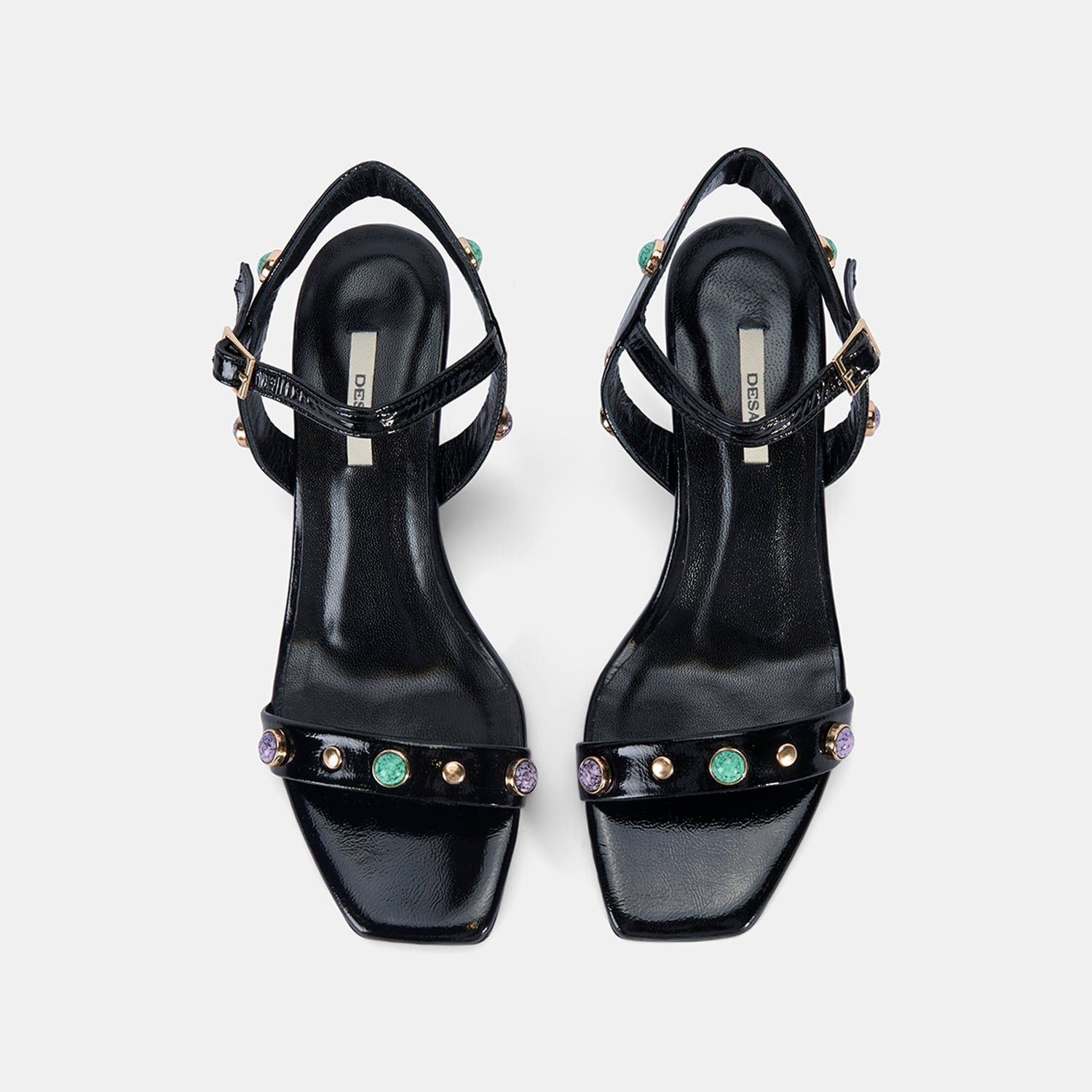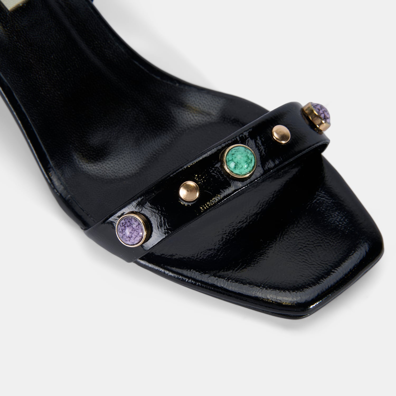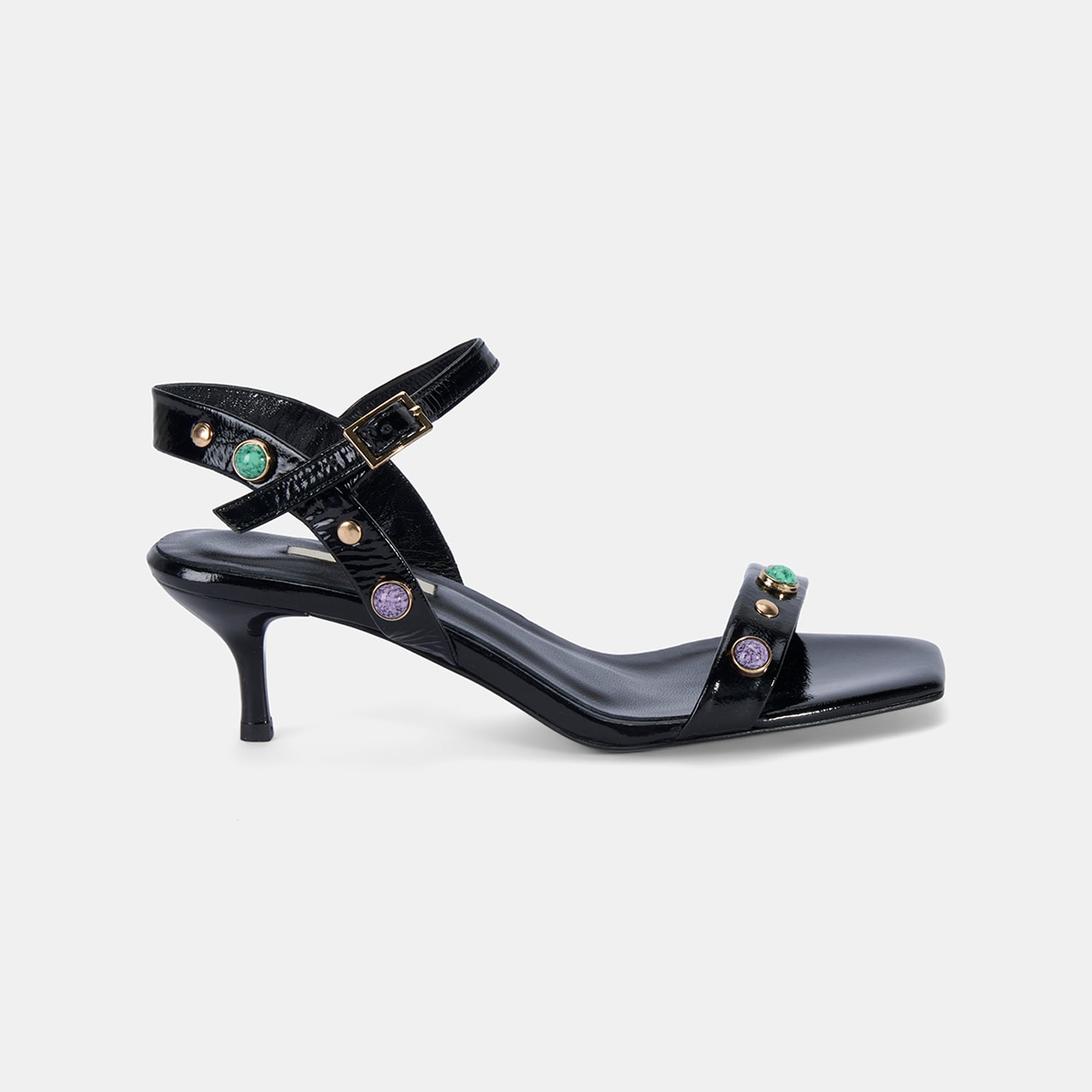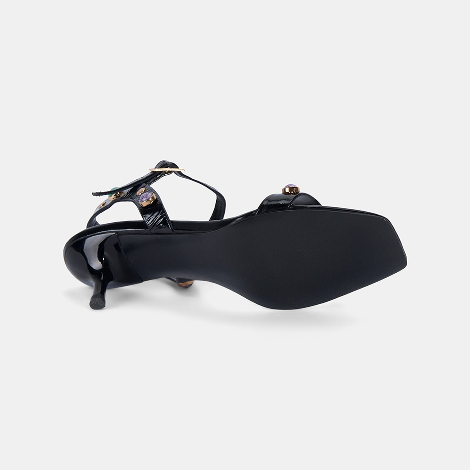 Kadın Siyah Taş Aksesuarlı İnce Topuklu Rugan Deri Sandalet