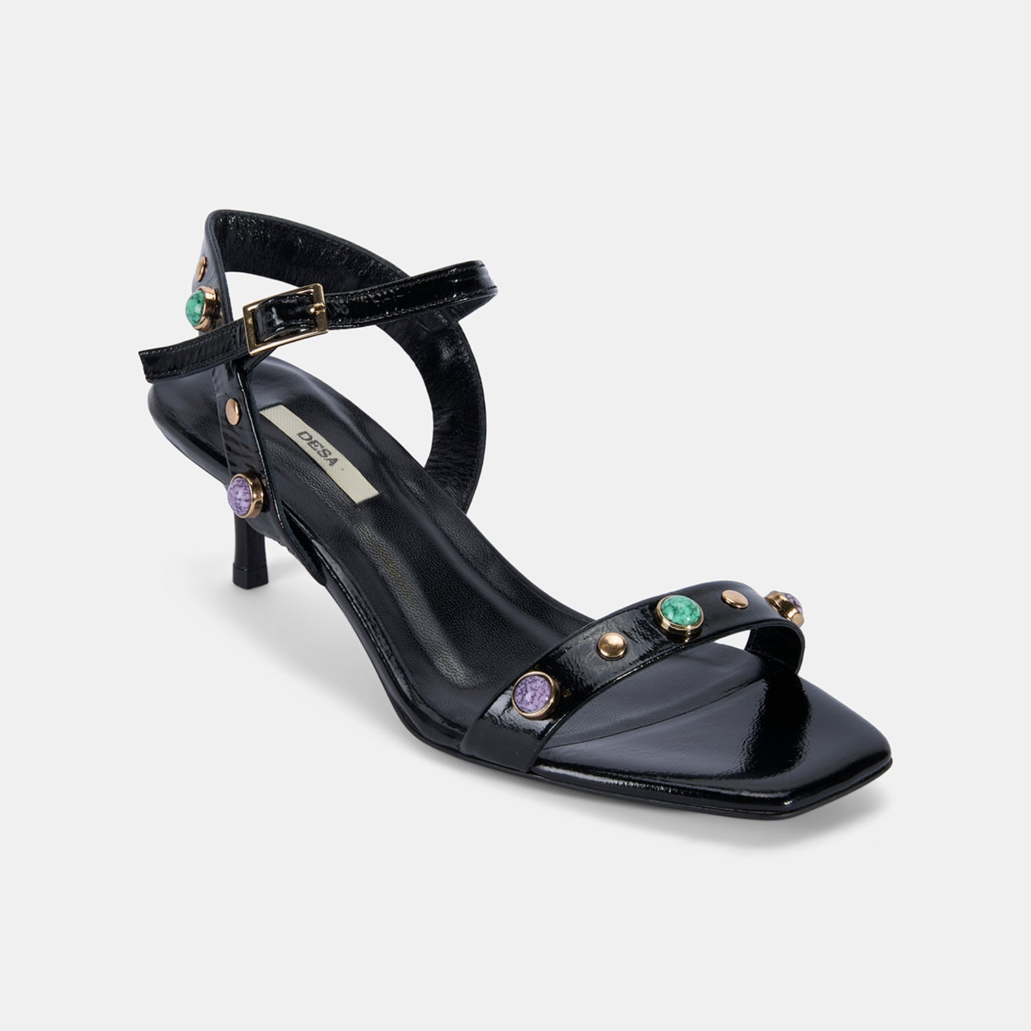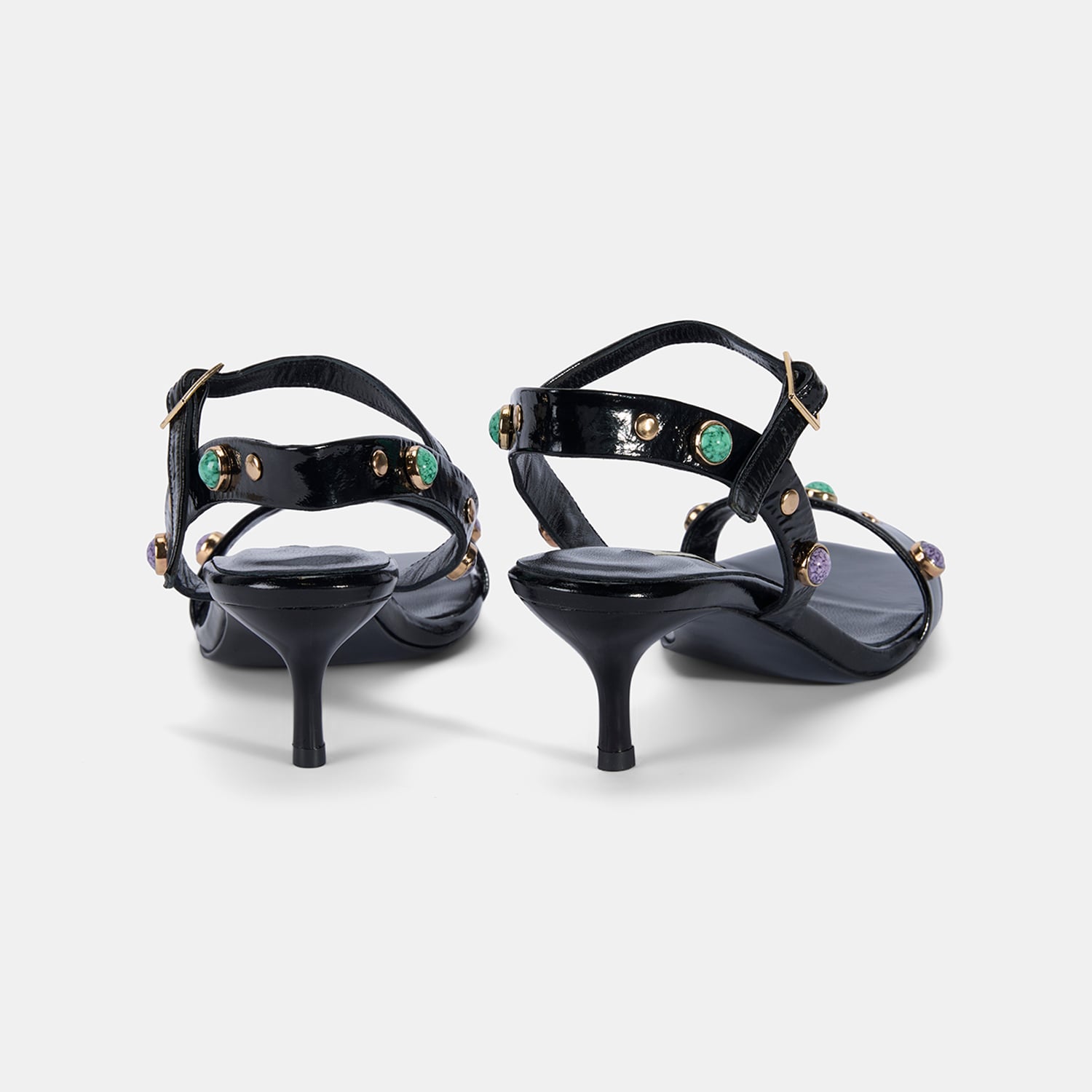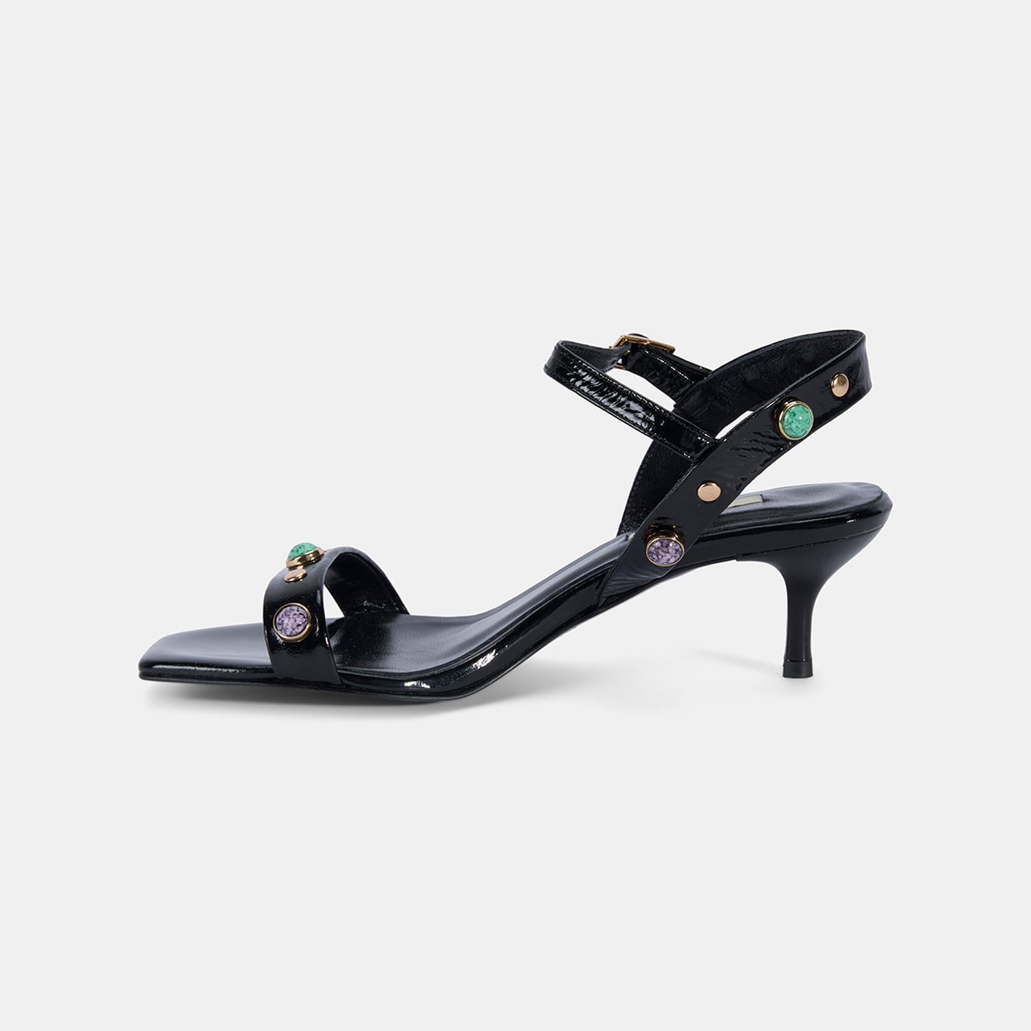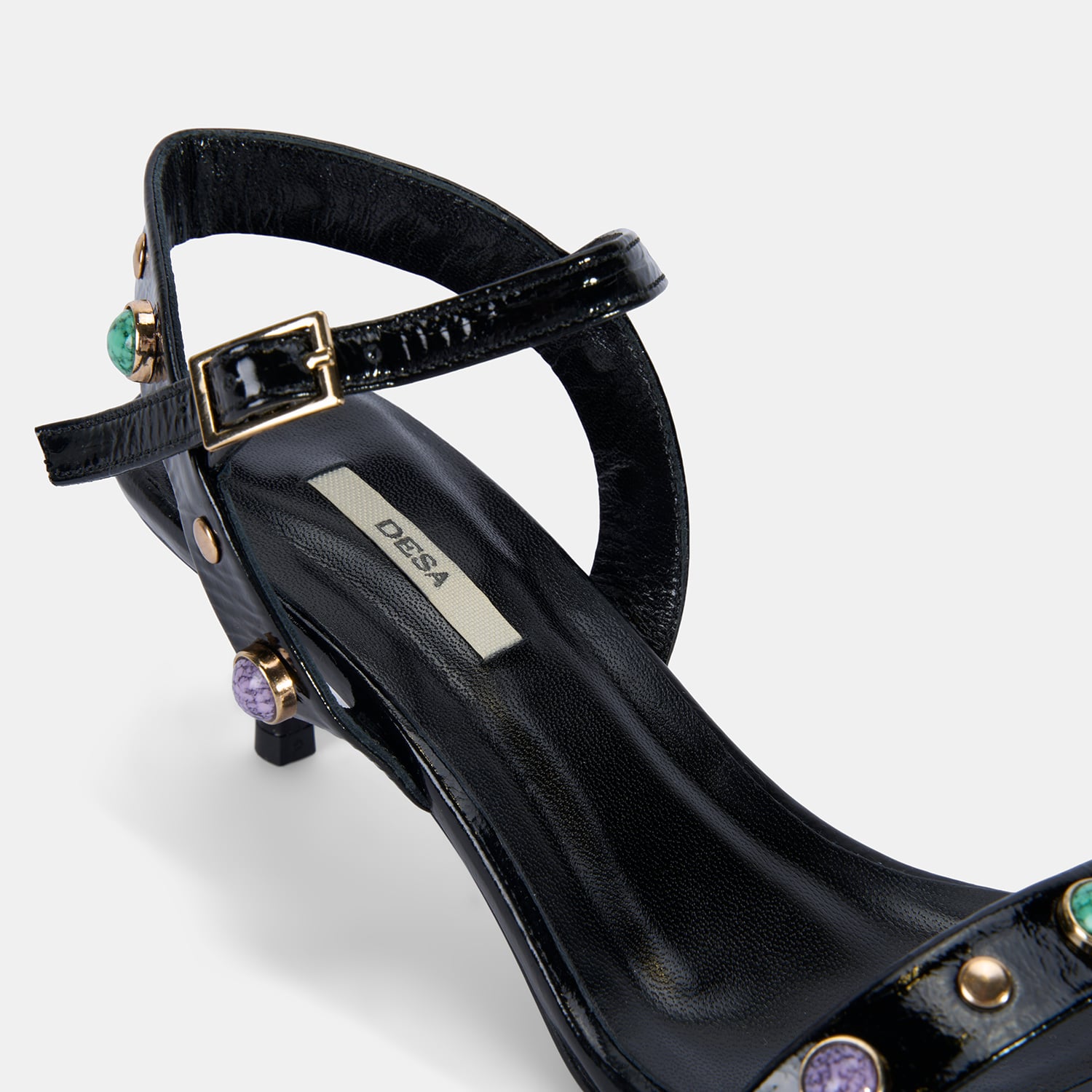 Kadın Siyah Taş Aksesuarlı İnce Topuklu Rugan Deri Sandalet