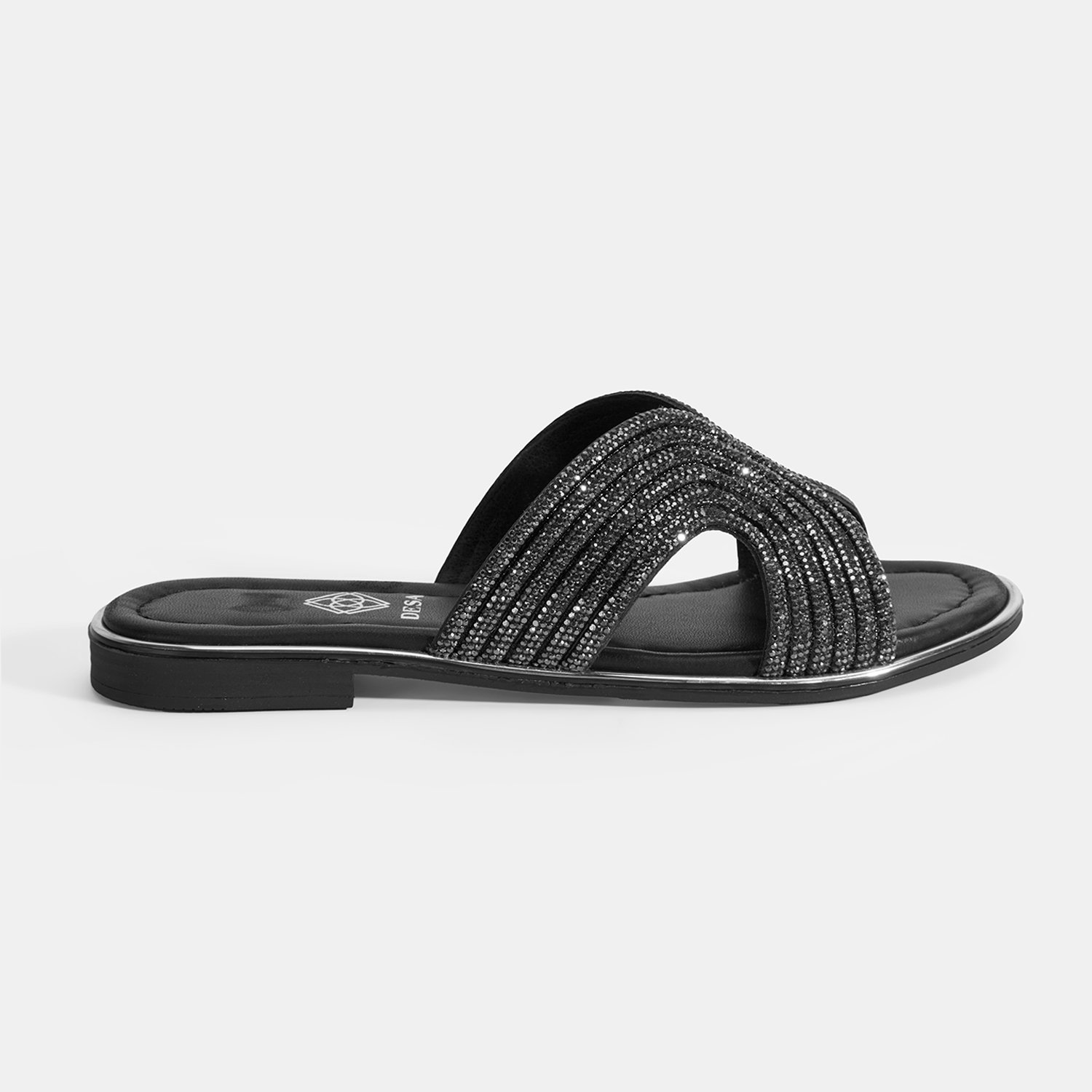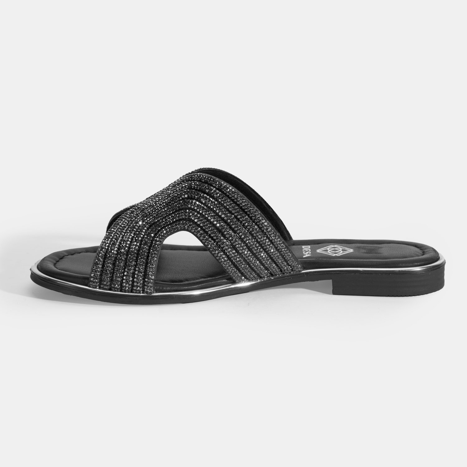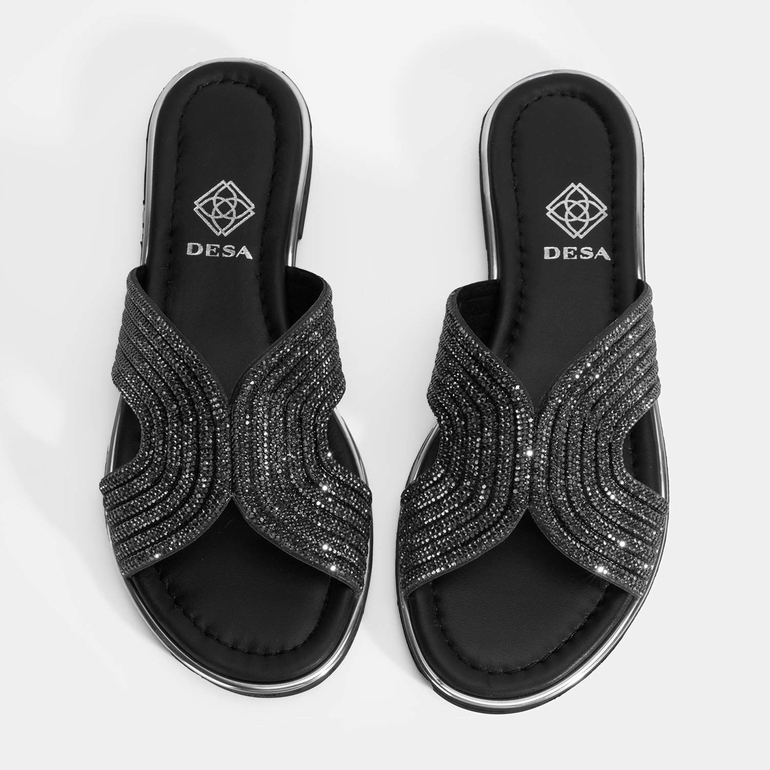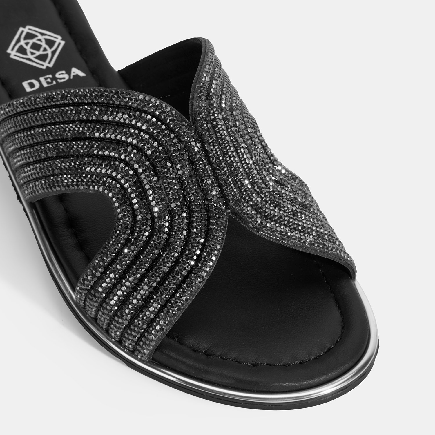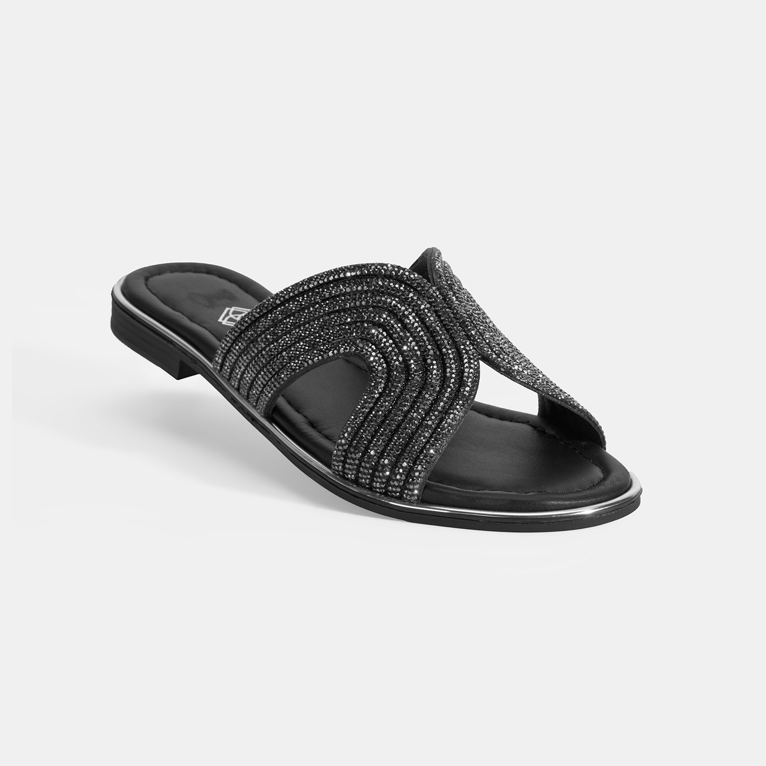 Pu materyalden üretilmiştir. Deri iç tabanlı, deri astarlı, parlak taş süslemeli, termo tabanlı, kadın terlik.