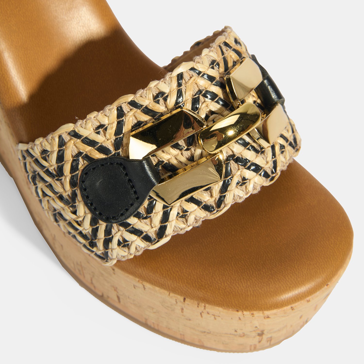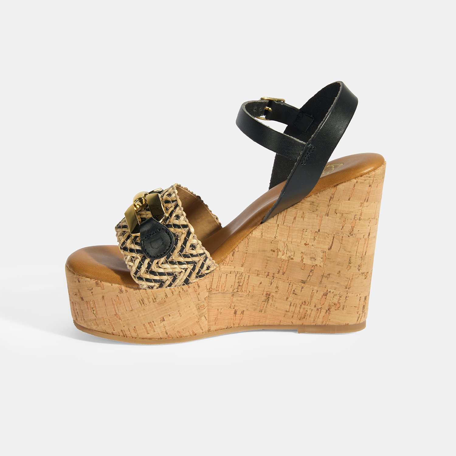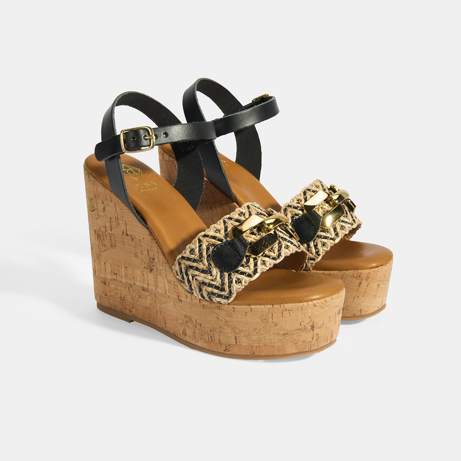 %60 deri, %40 rafya malzemeden üretilmiştir, deri astarlı, pu iç tabanlı, mantar sargılı pu tabanlı, ayarlanabilir metal tokalı, metal aksesuar toka detaylı, kadın topuklu sandalet.