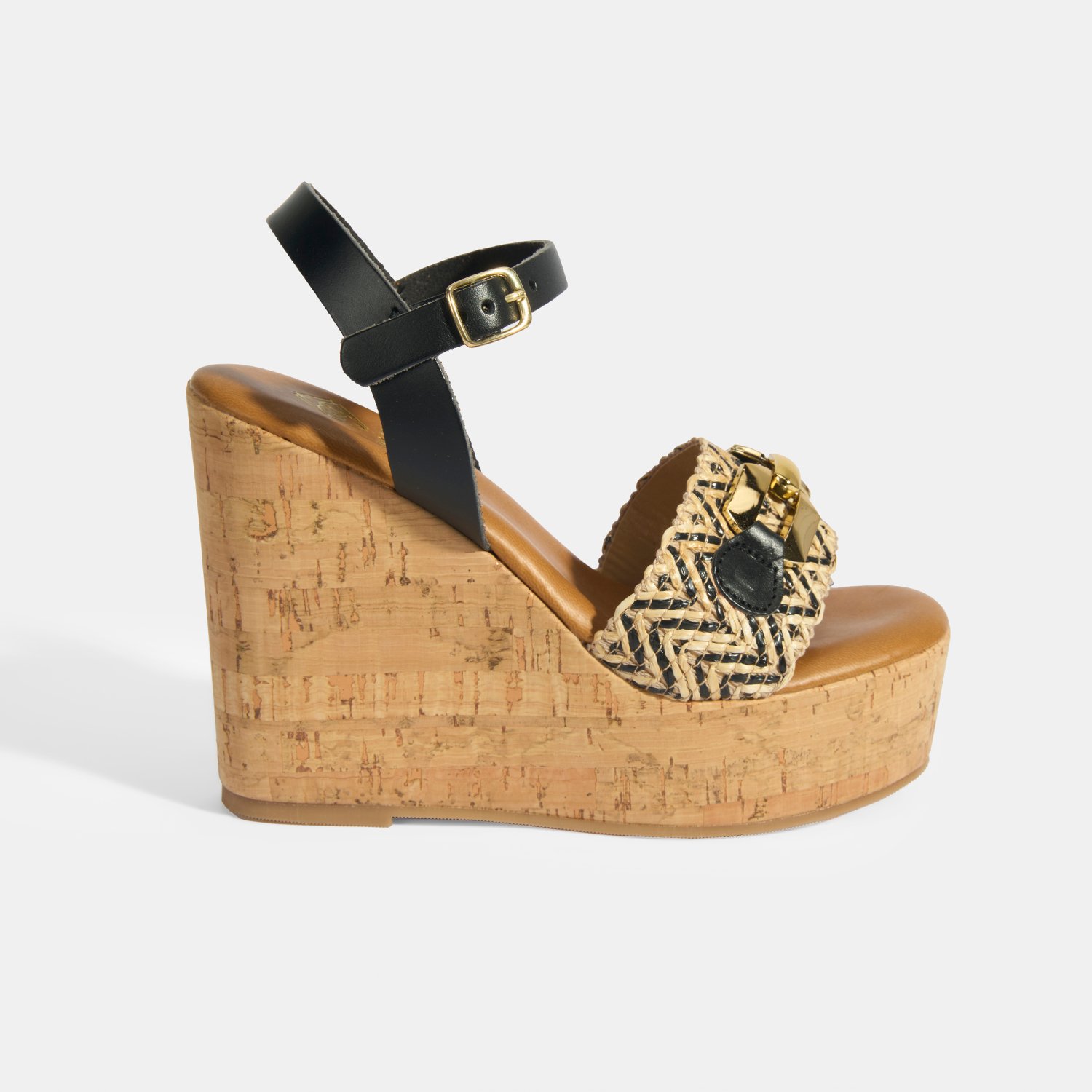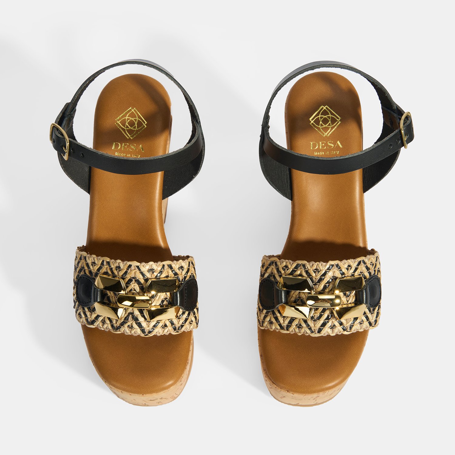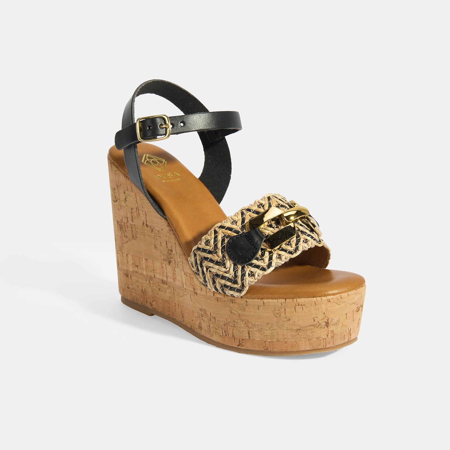 %60 deri, %40 rafya malzemeden üretilmiştir, deri astarlı, pu iç tabanlı, mantar sargılı pu tabanlı, ayarlanabilir metal tokalı, metal aksesuar toka detaylı, kadın topuklu sandalet.