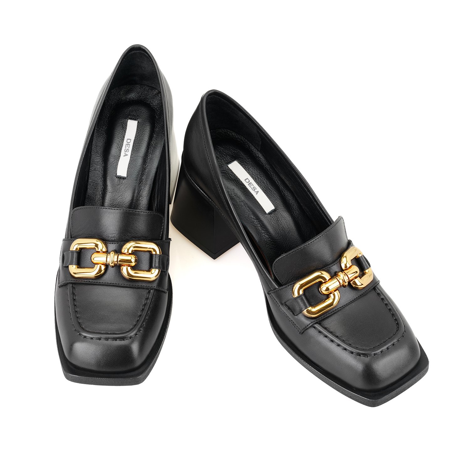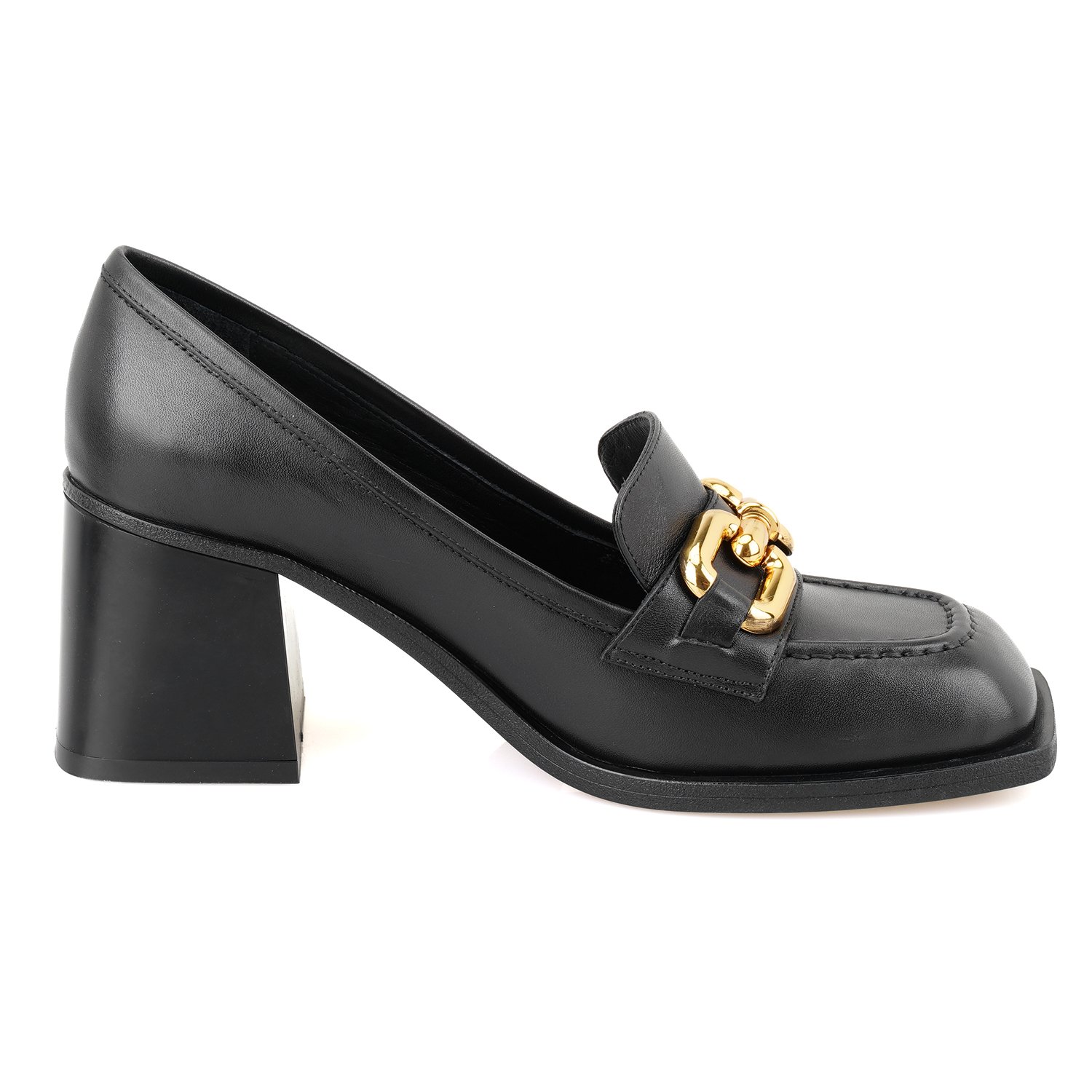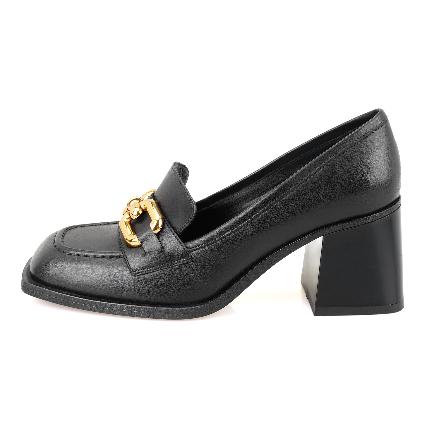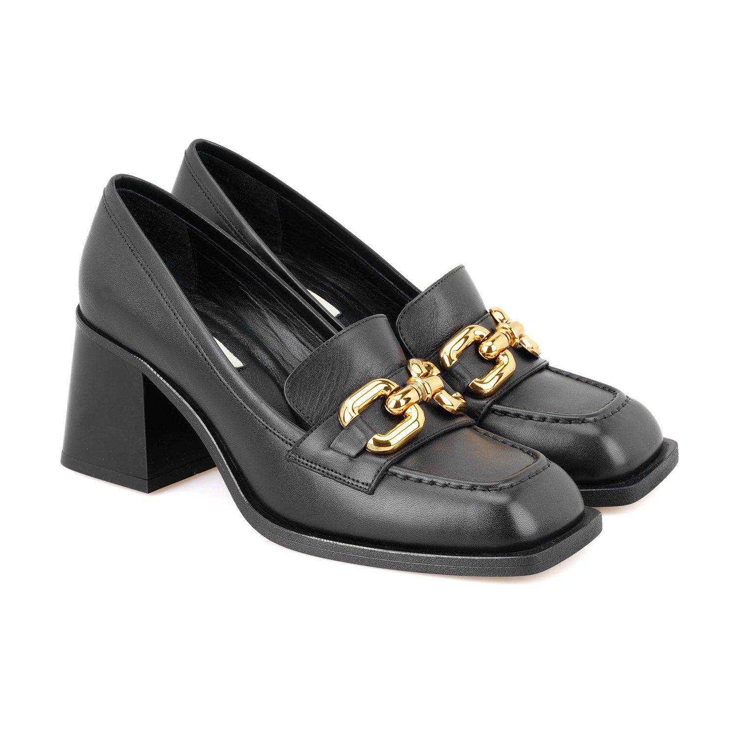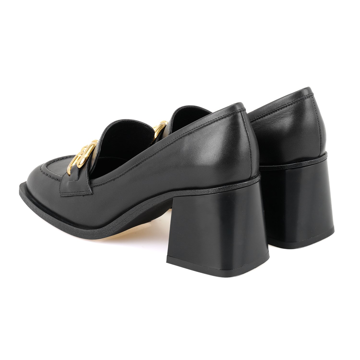 Kadın Siyah Toka Aksesuarlı Topuklu Deri Loafer