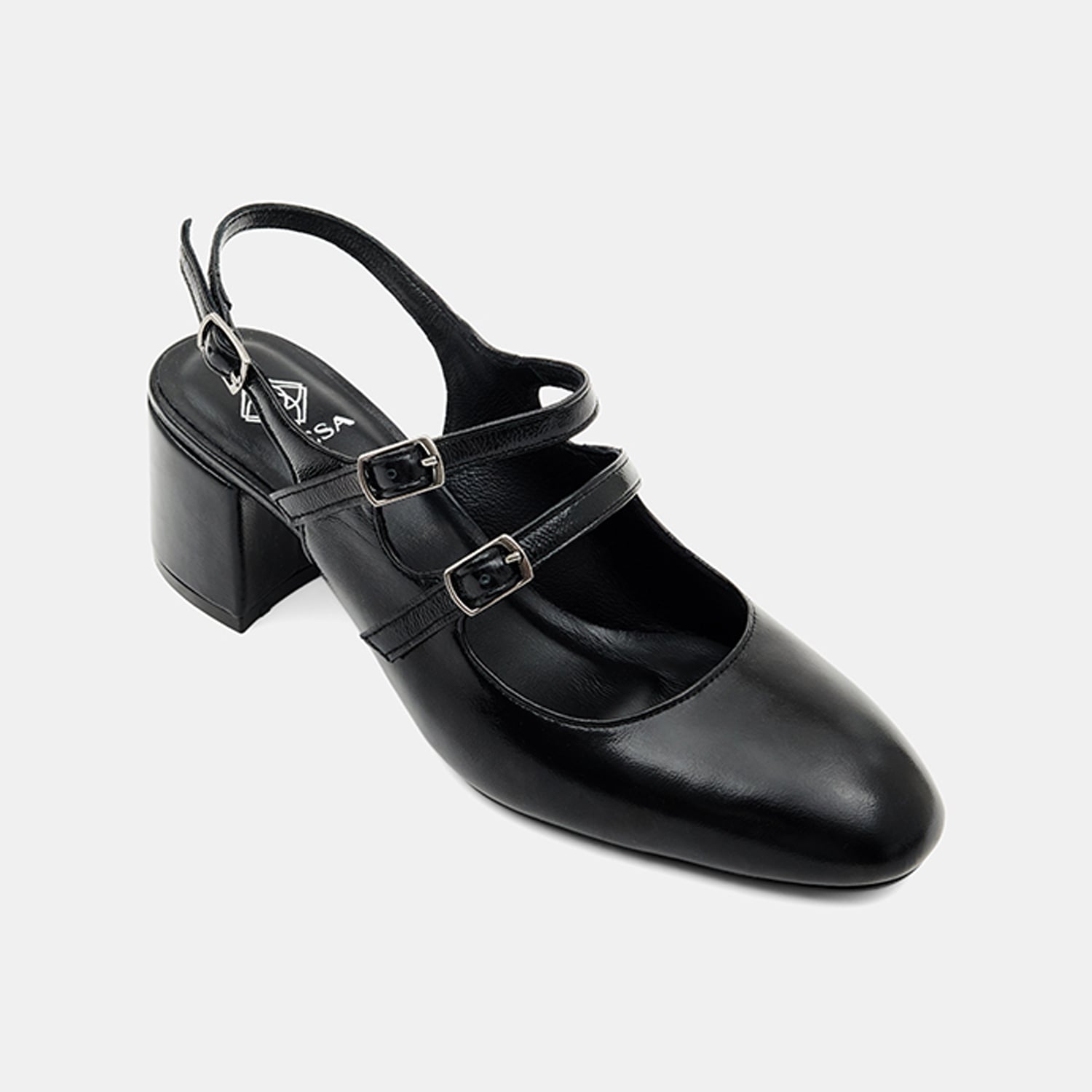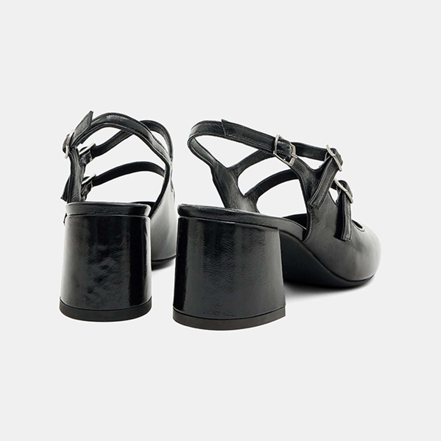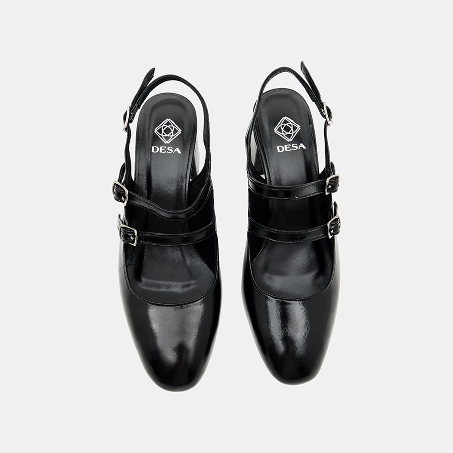 Kadın Siyah Tokalı Kalın Topuklu Klasik Rugan Deri Ayakkabı