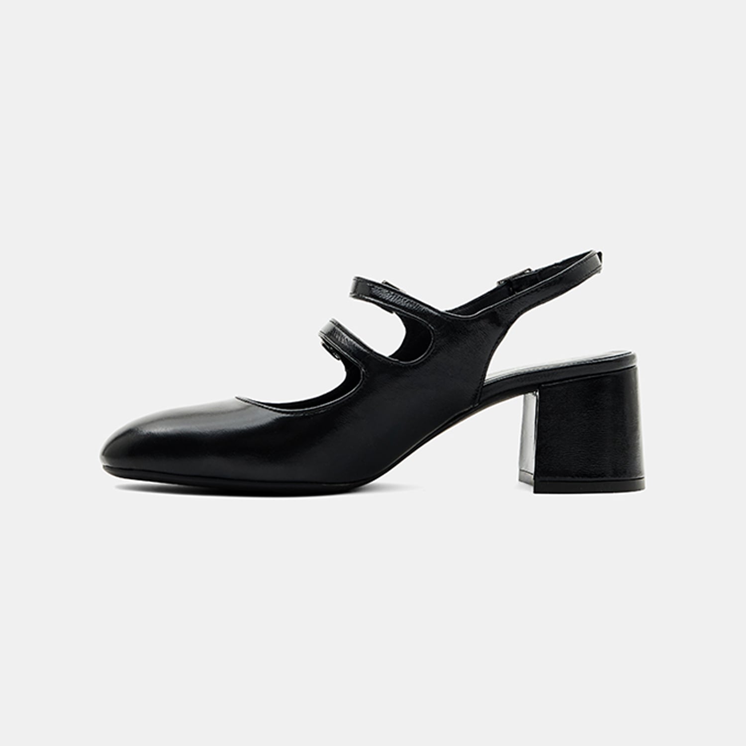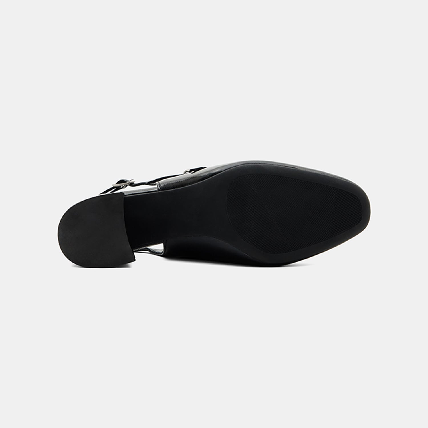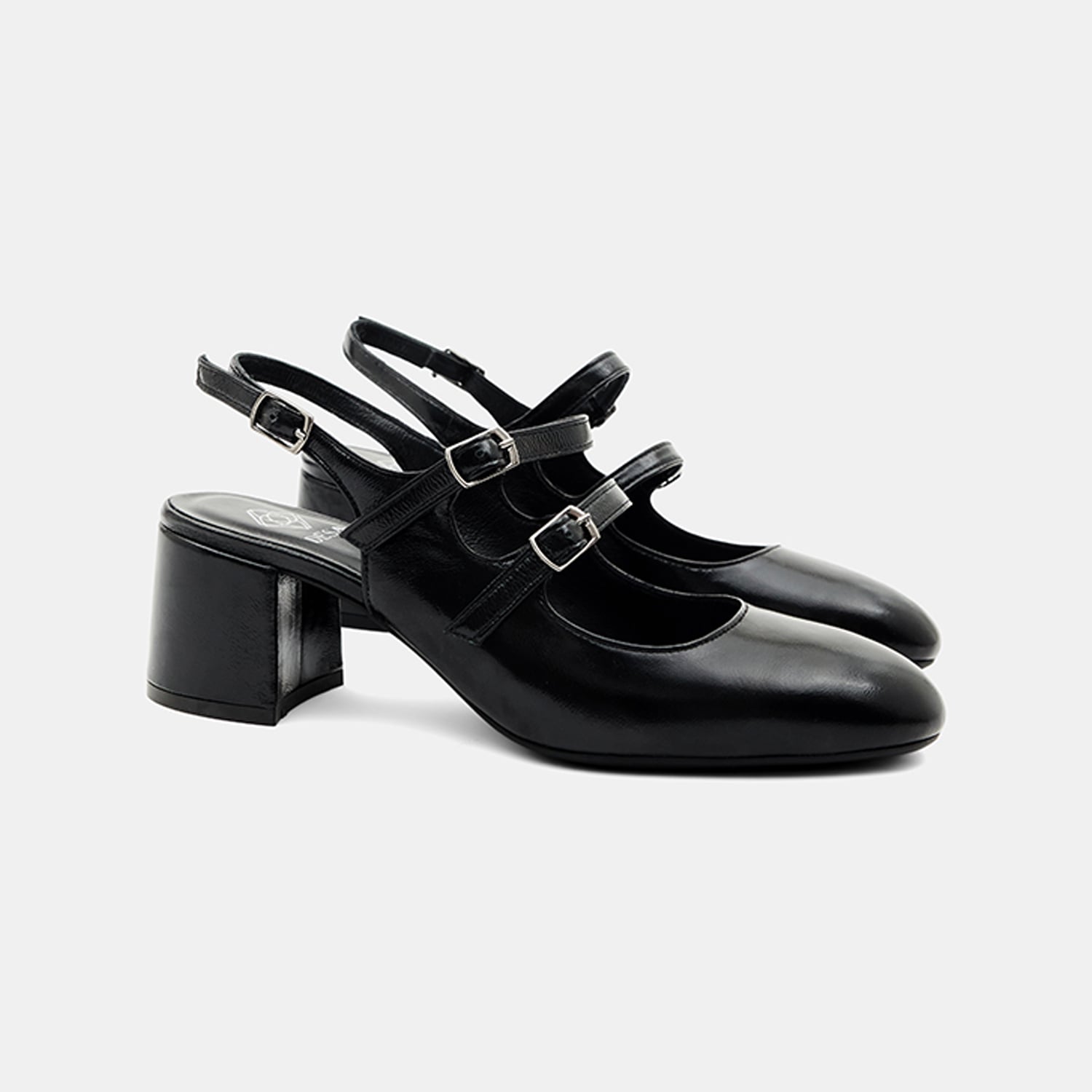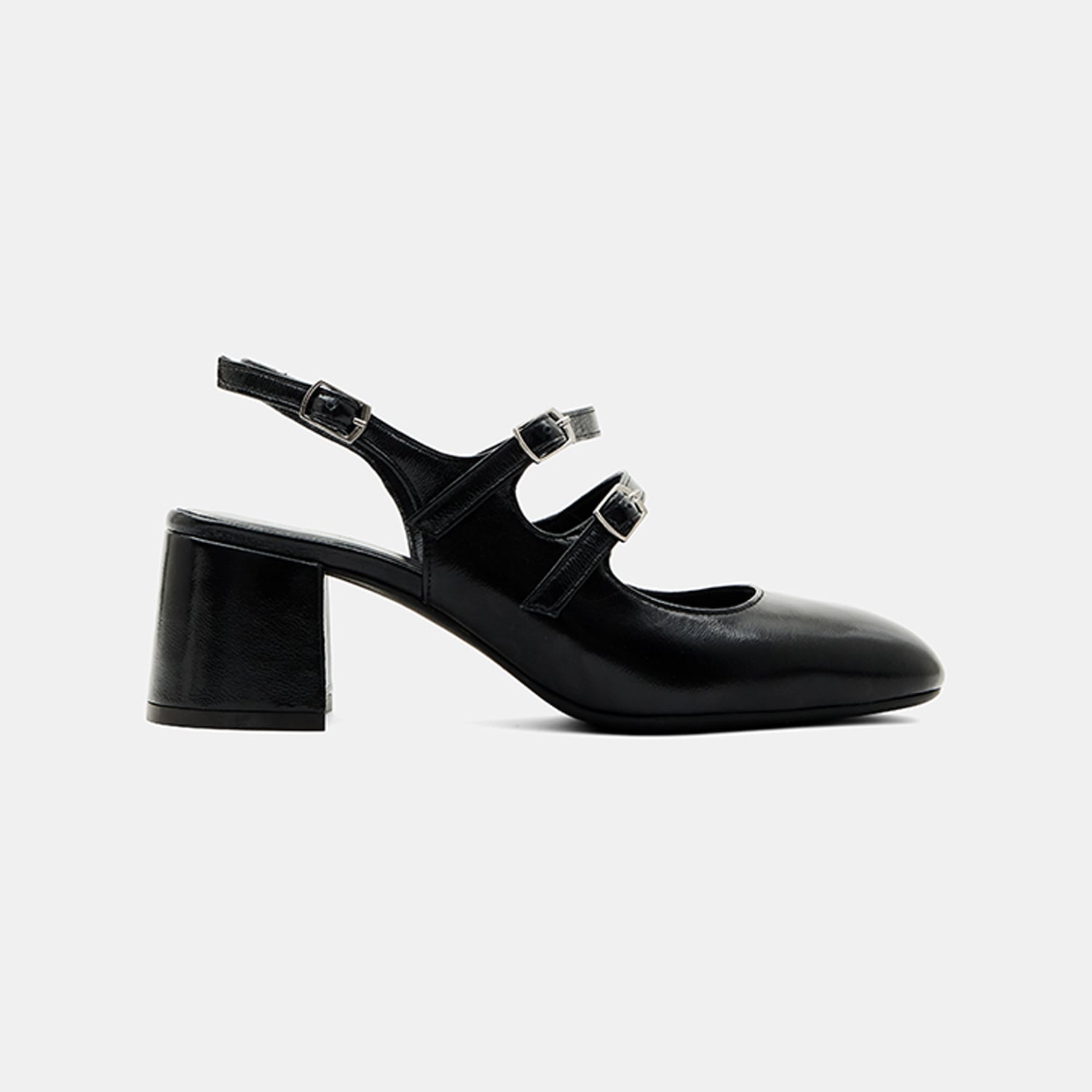 Kadın Siyah Tokalı Kalın Topuklu Klasik Rugan Deri Ayakkabı