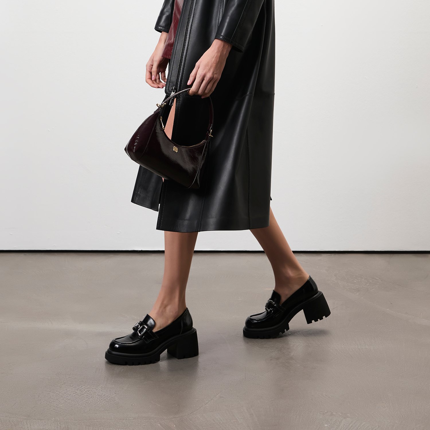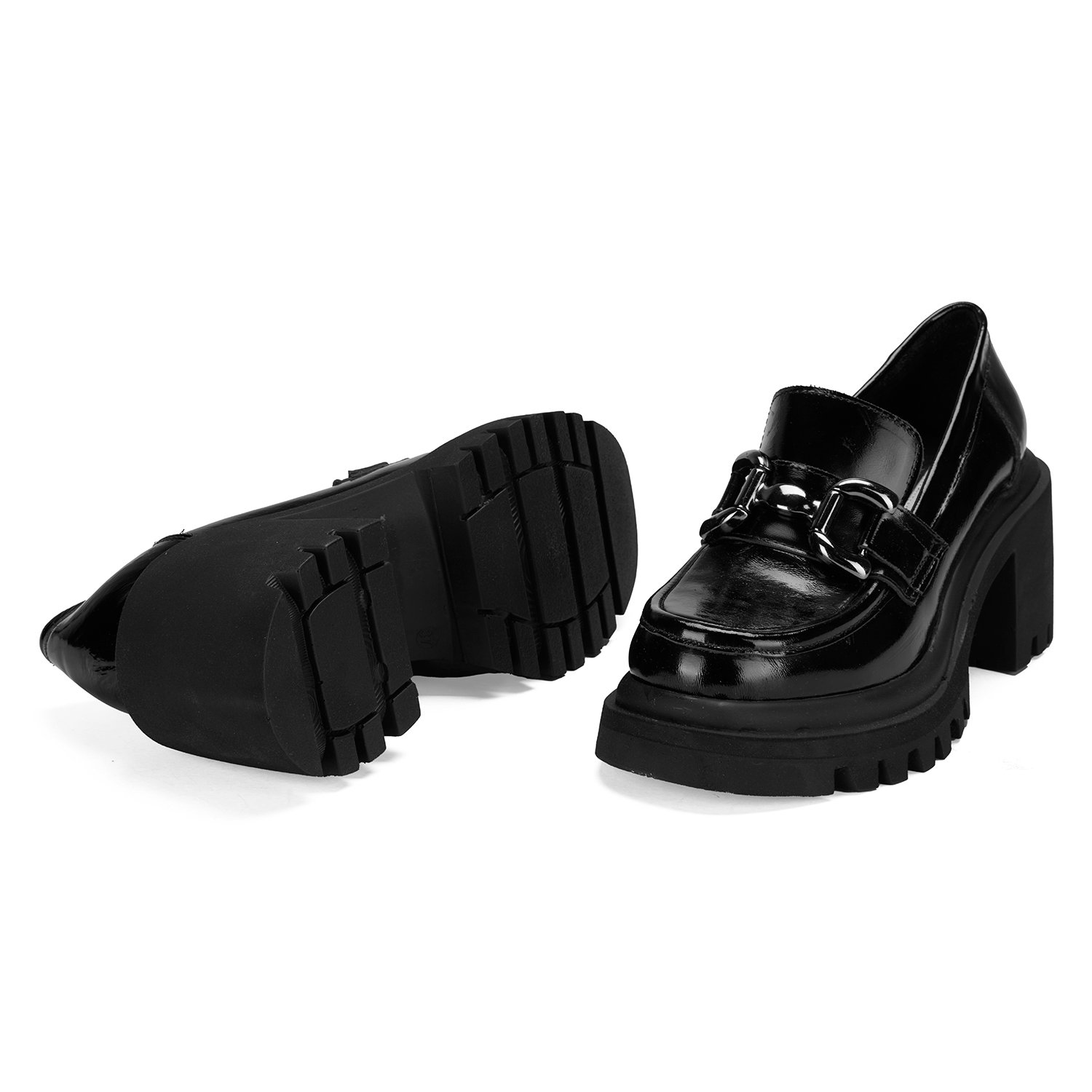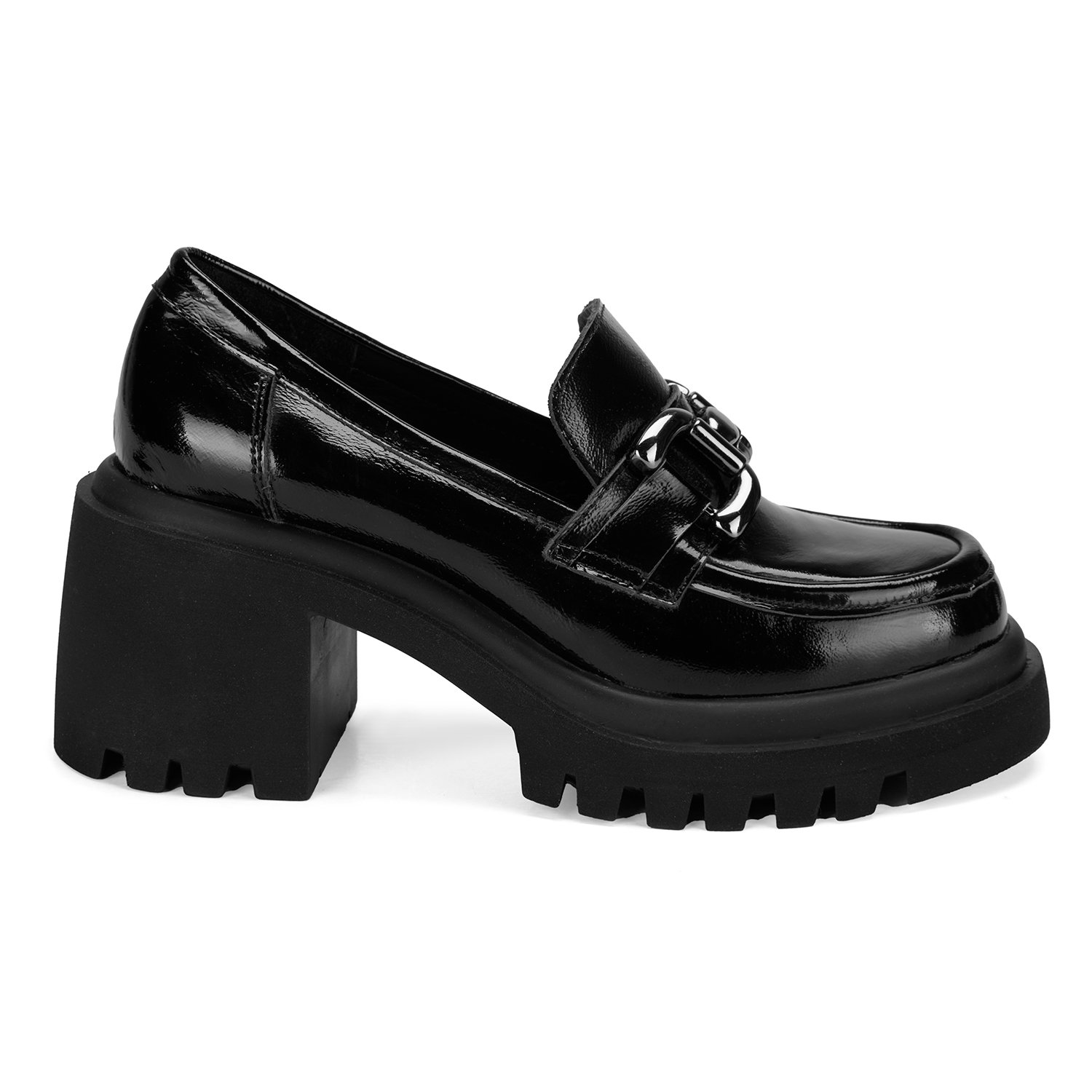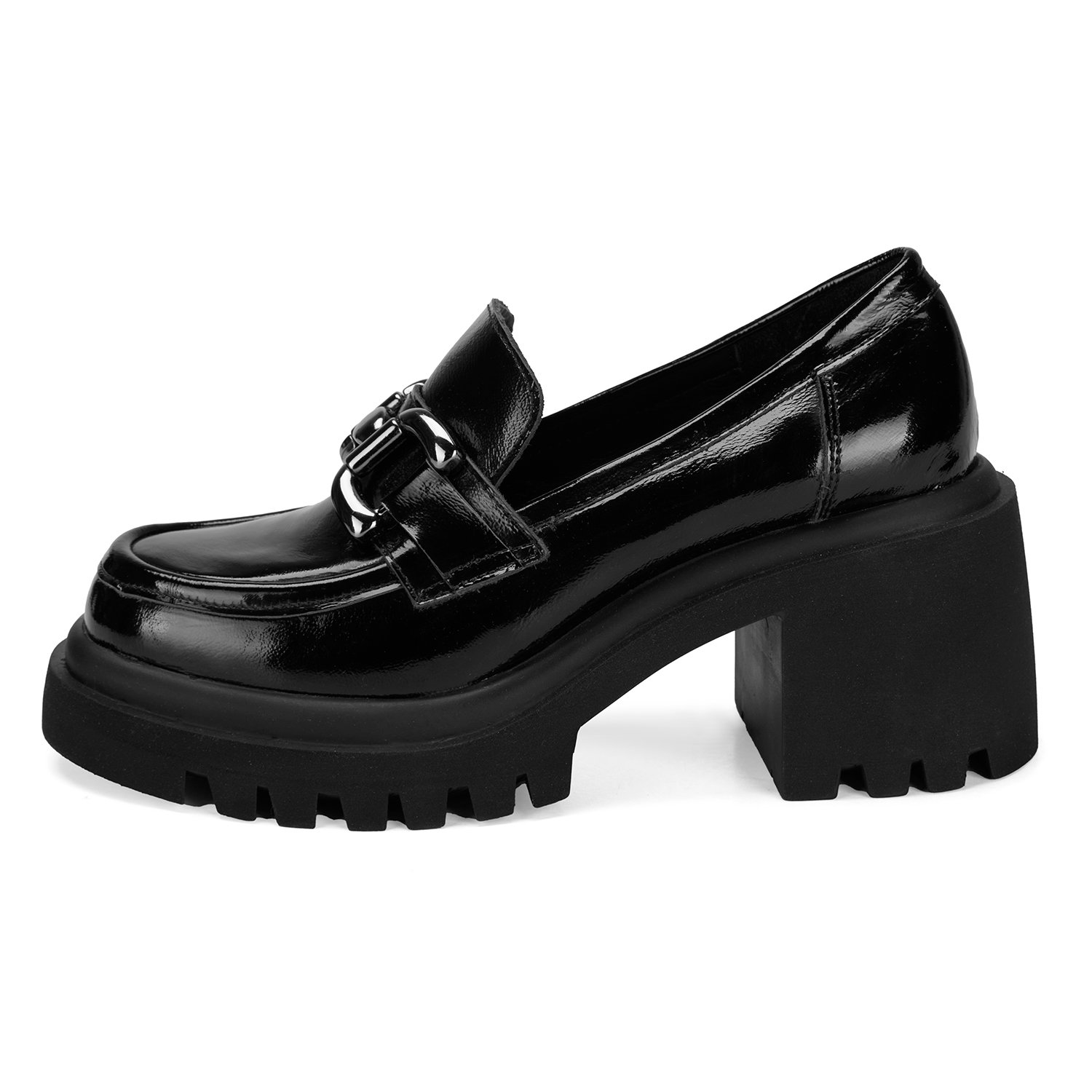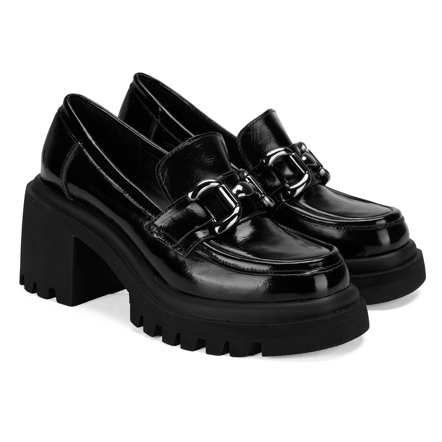%100 rugan deri, deri iç tabanlı, deri astarlı, metal aksesuar detaylı, pu tabanlı, kadın topuklu loafer.
