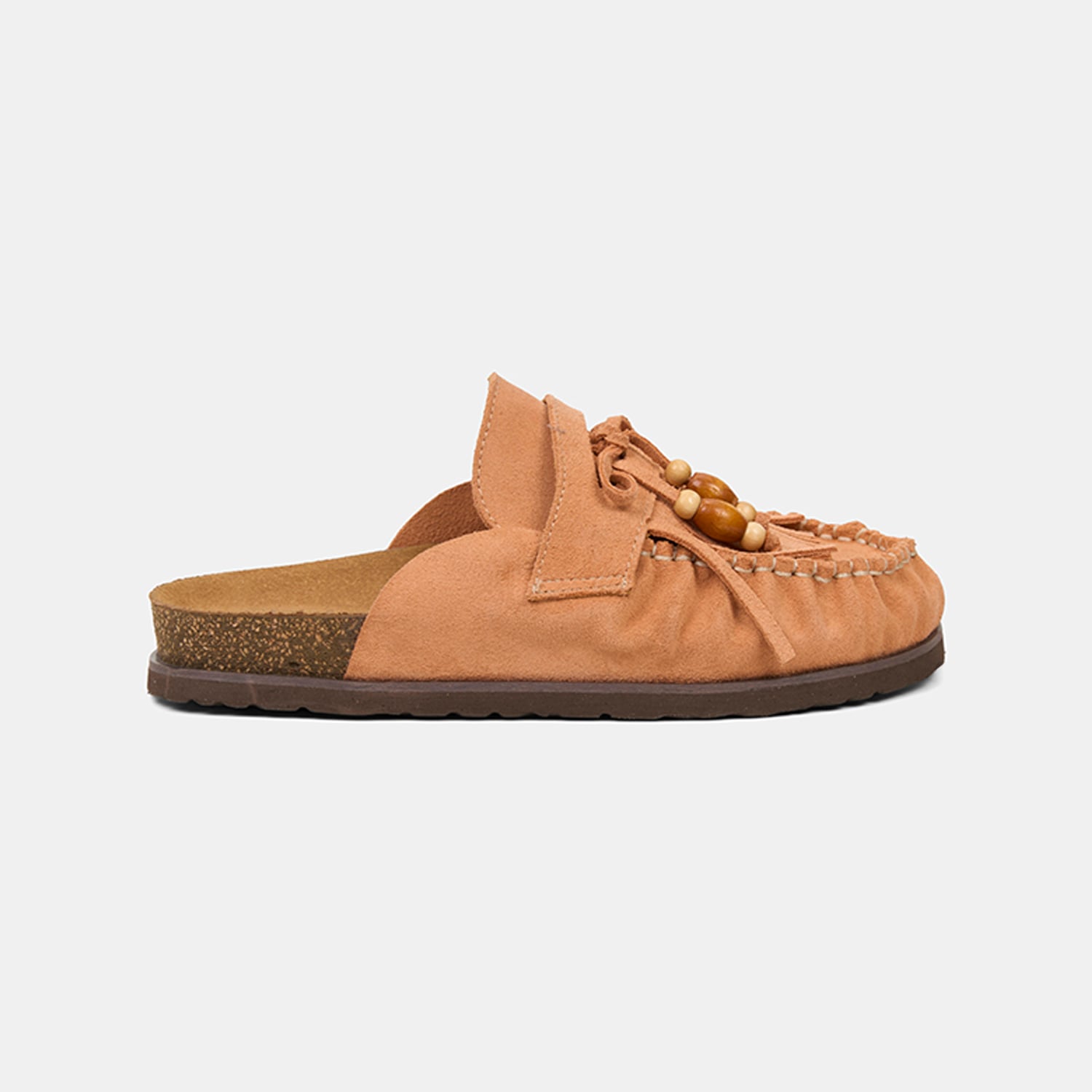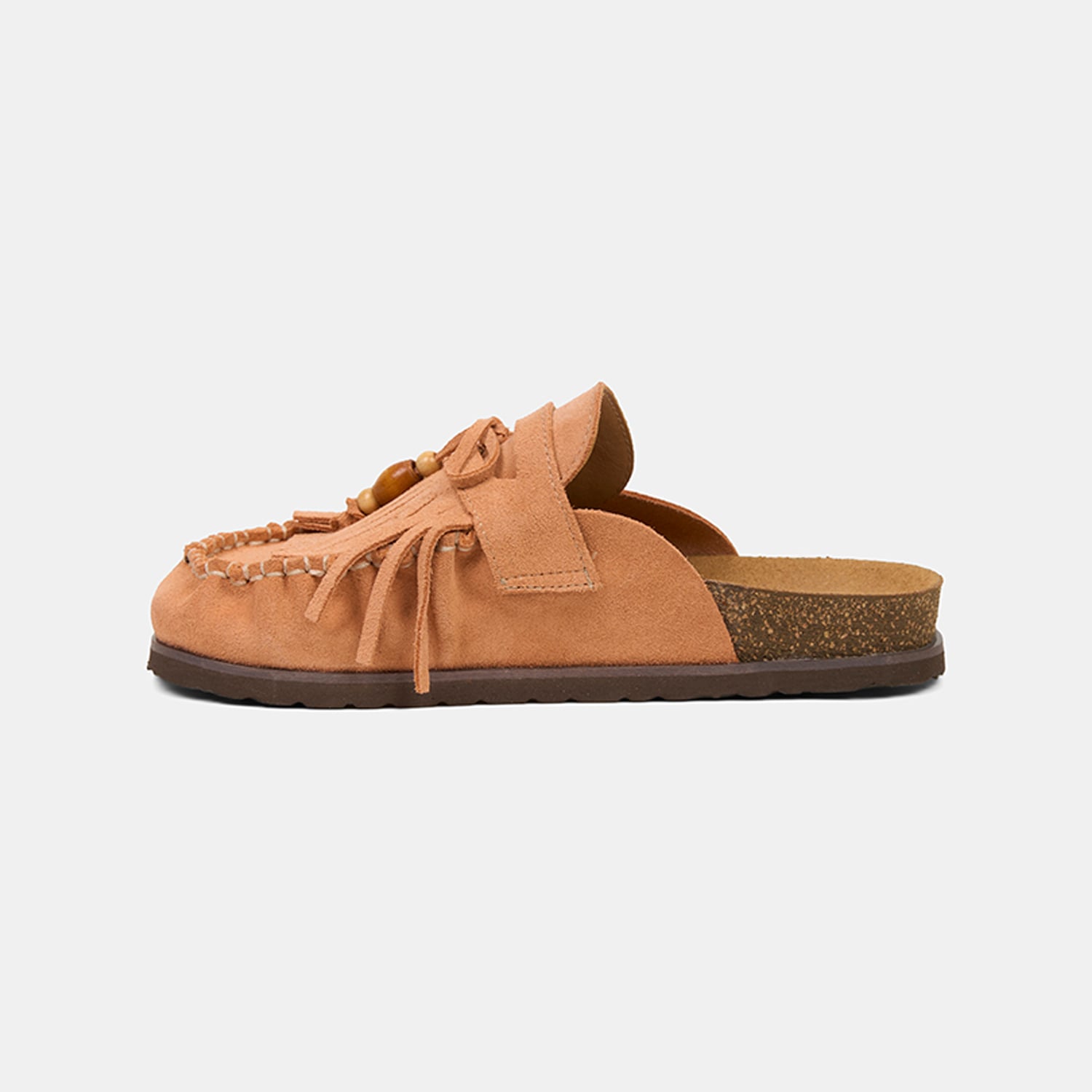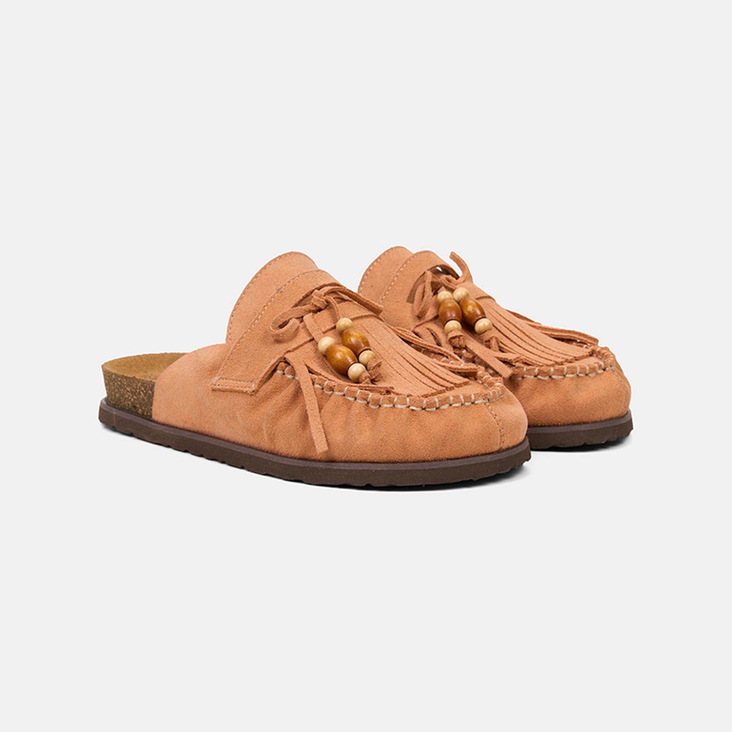 Kadın sabo terlik, süet deri yüzeyi ve püskül-boncuk detaylarıyla günlük stile özgün ve dikkat çekici bir karakter kazandıran rahat bir modeldir.