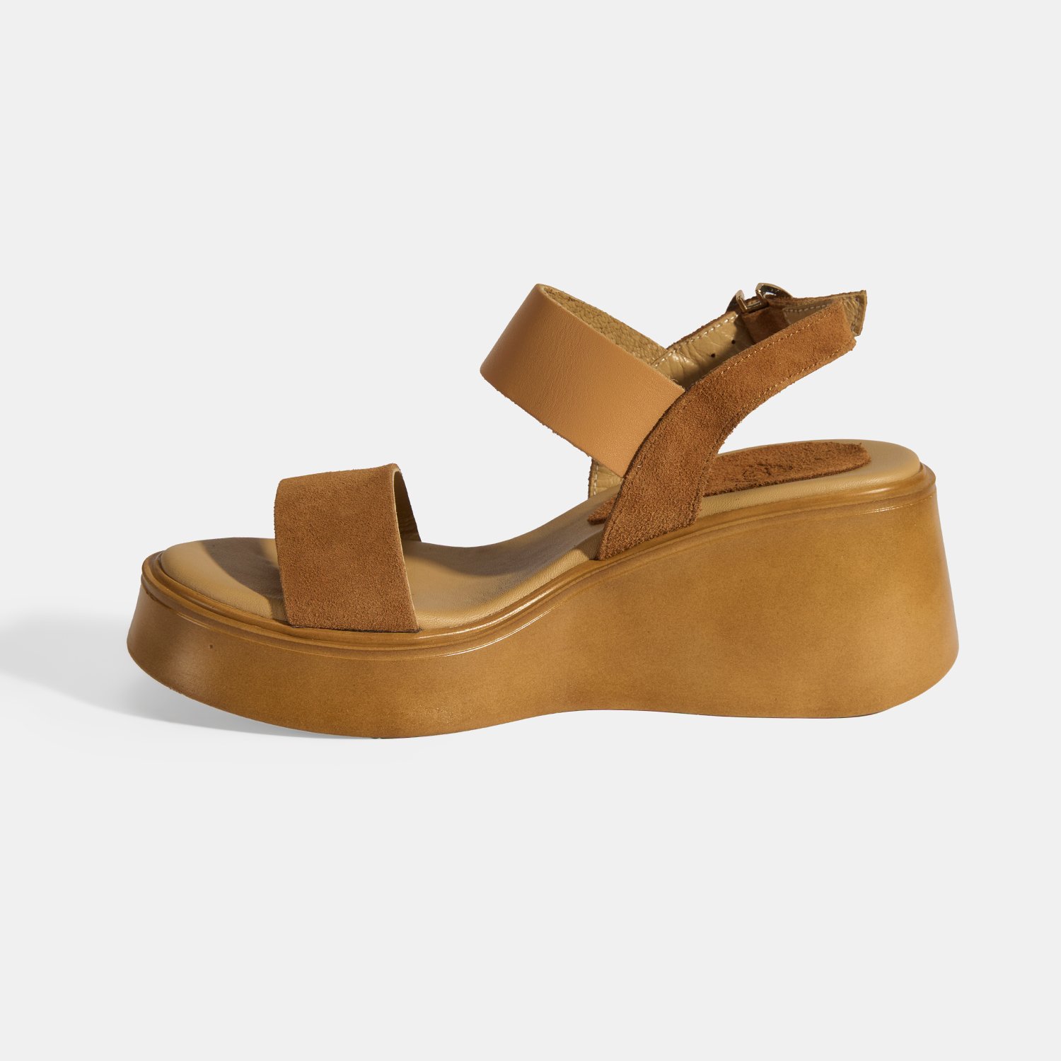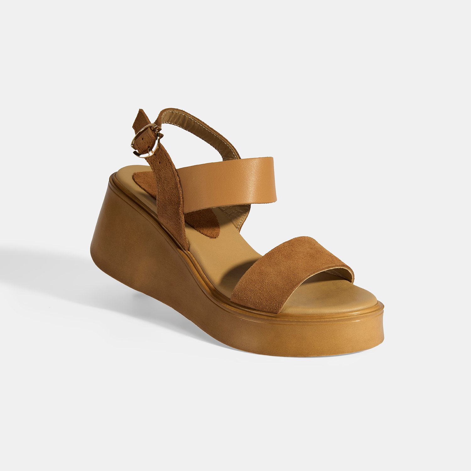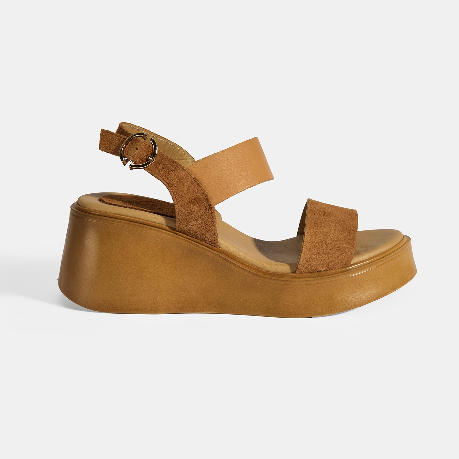 Kadın Taba Ayarlanabilir Tokalı Deri Detaylı Dolgu Topuklu Süet Sandalet