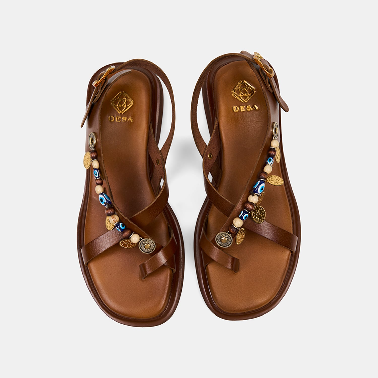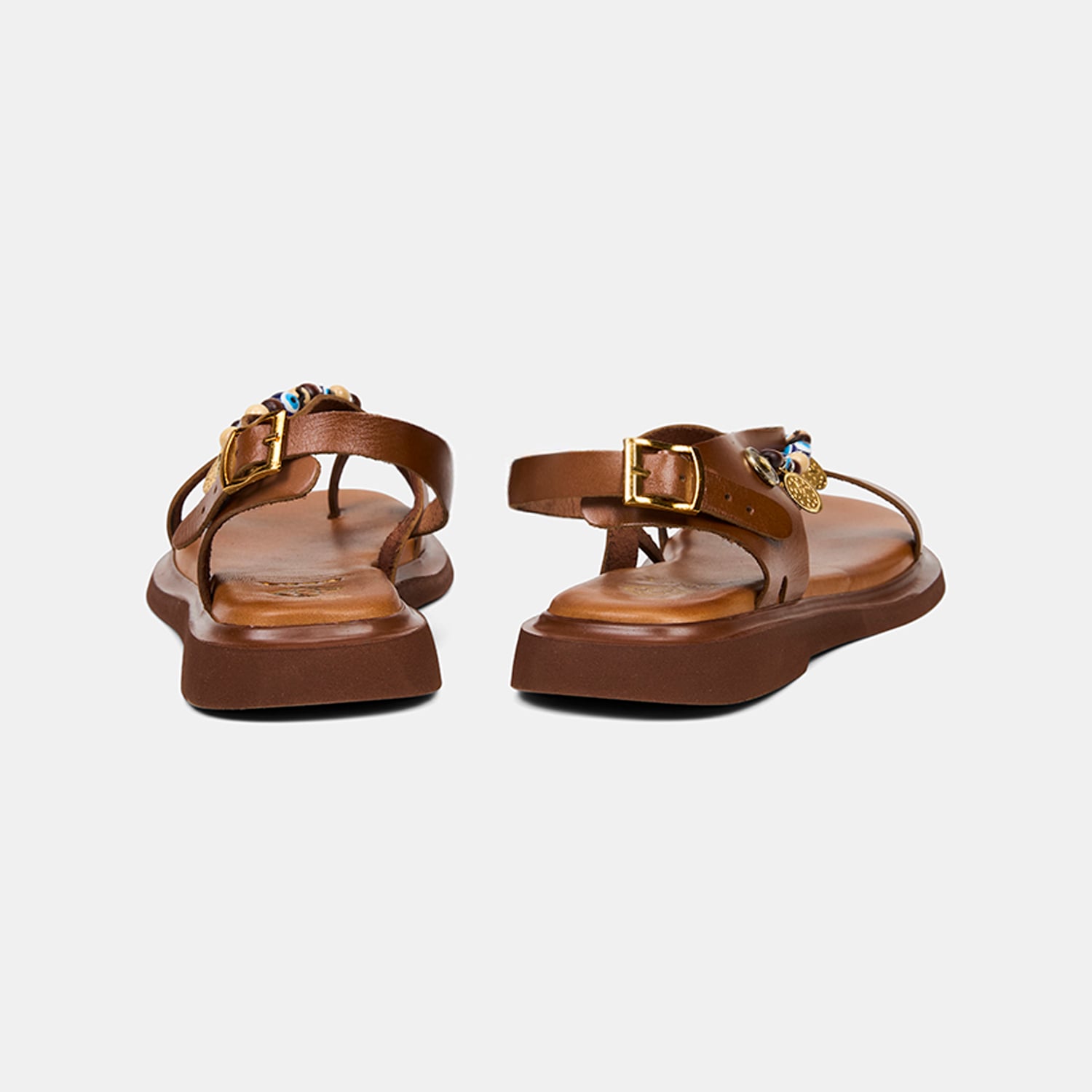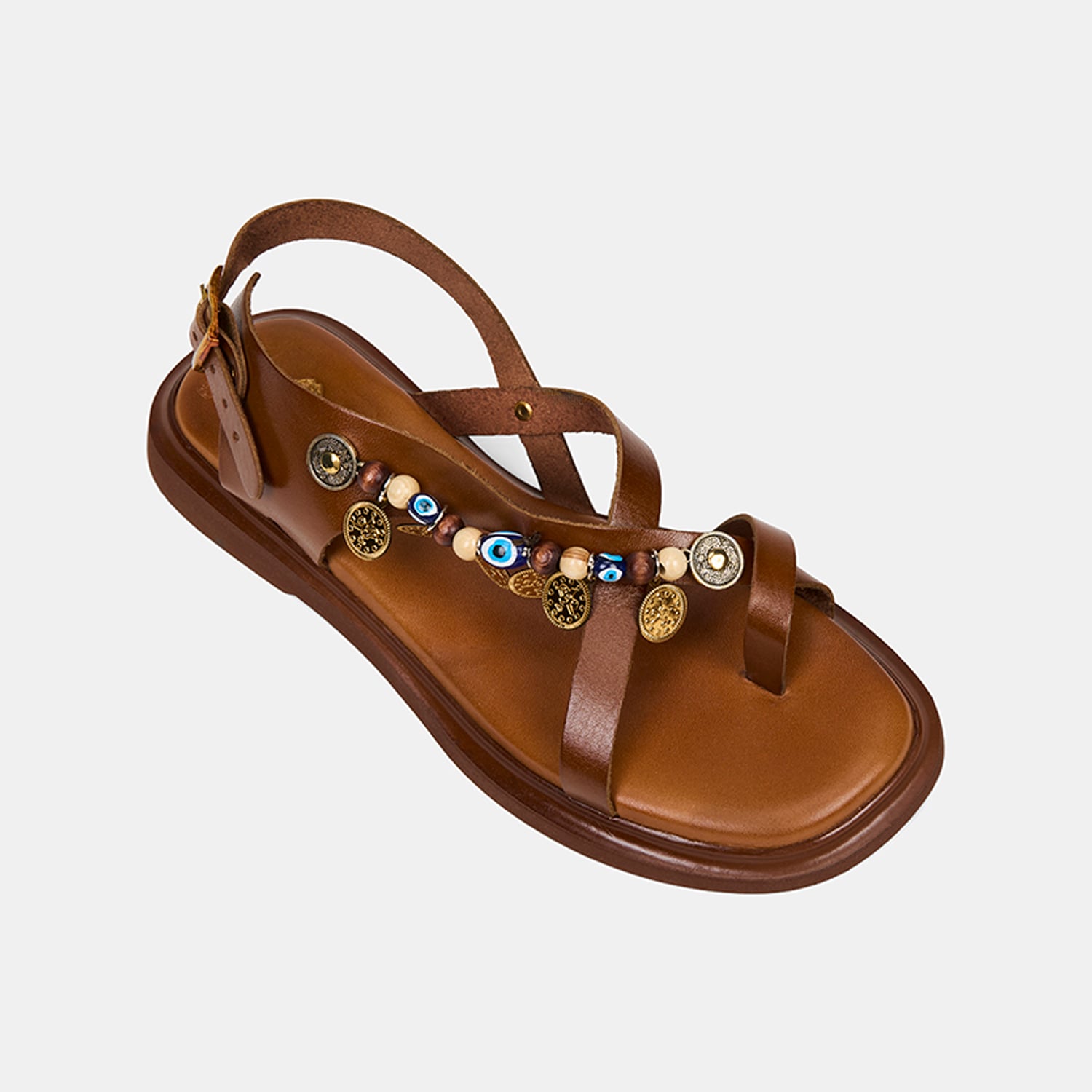 Kadın Taba Boncuk Aksesuarlı Parmak Arası Deri Sandalet