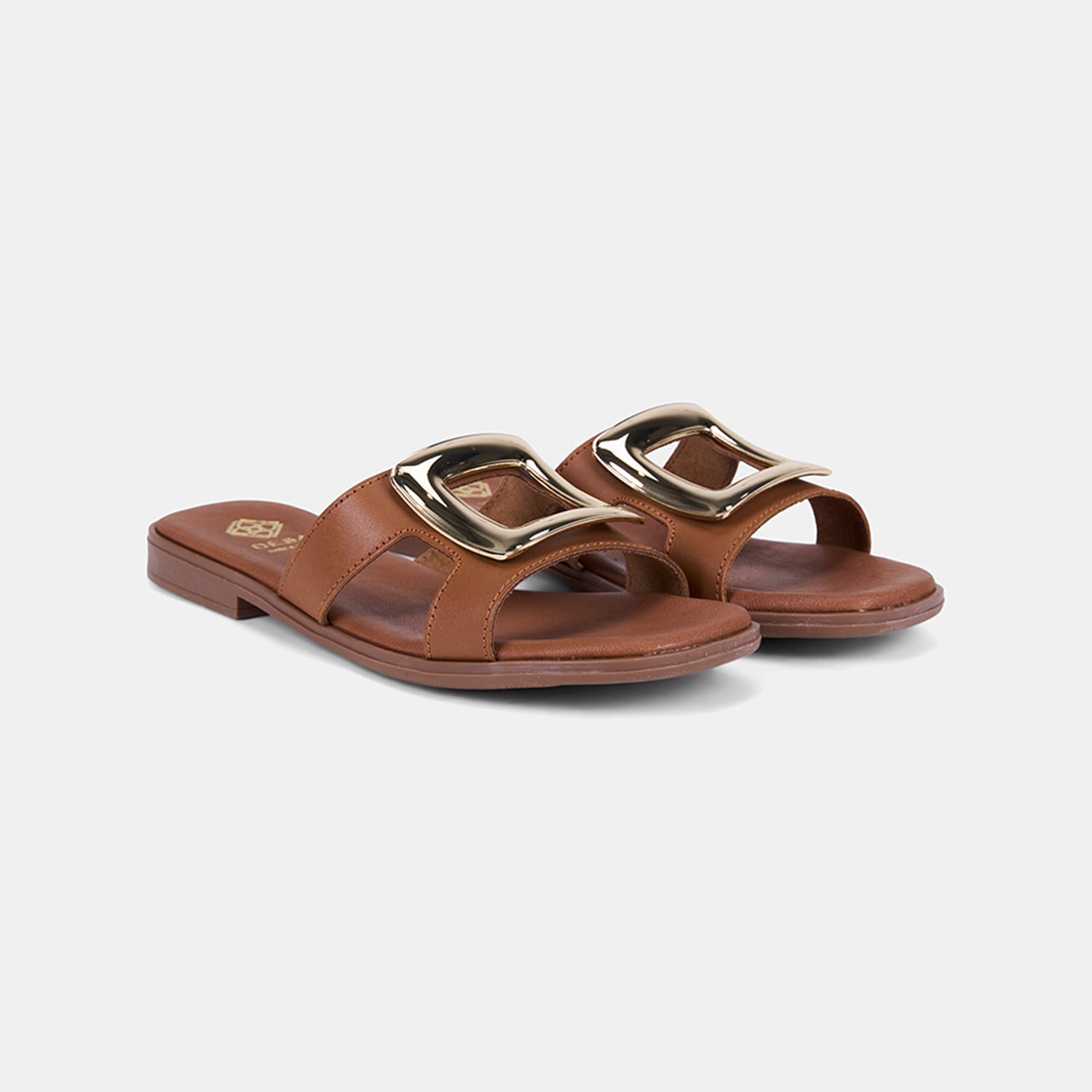 Kadın deri terlik, sade formunu öne çıkaran gold metal aksesuar detayıyla günlük şıklığa zarif bir dokunuş katar.