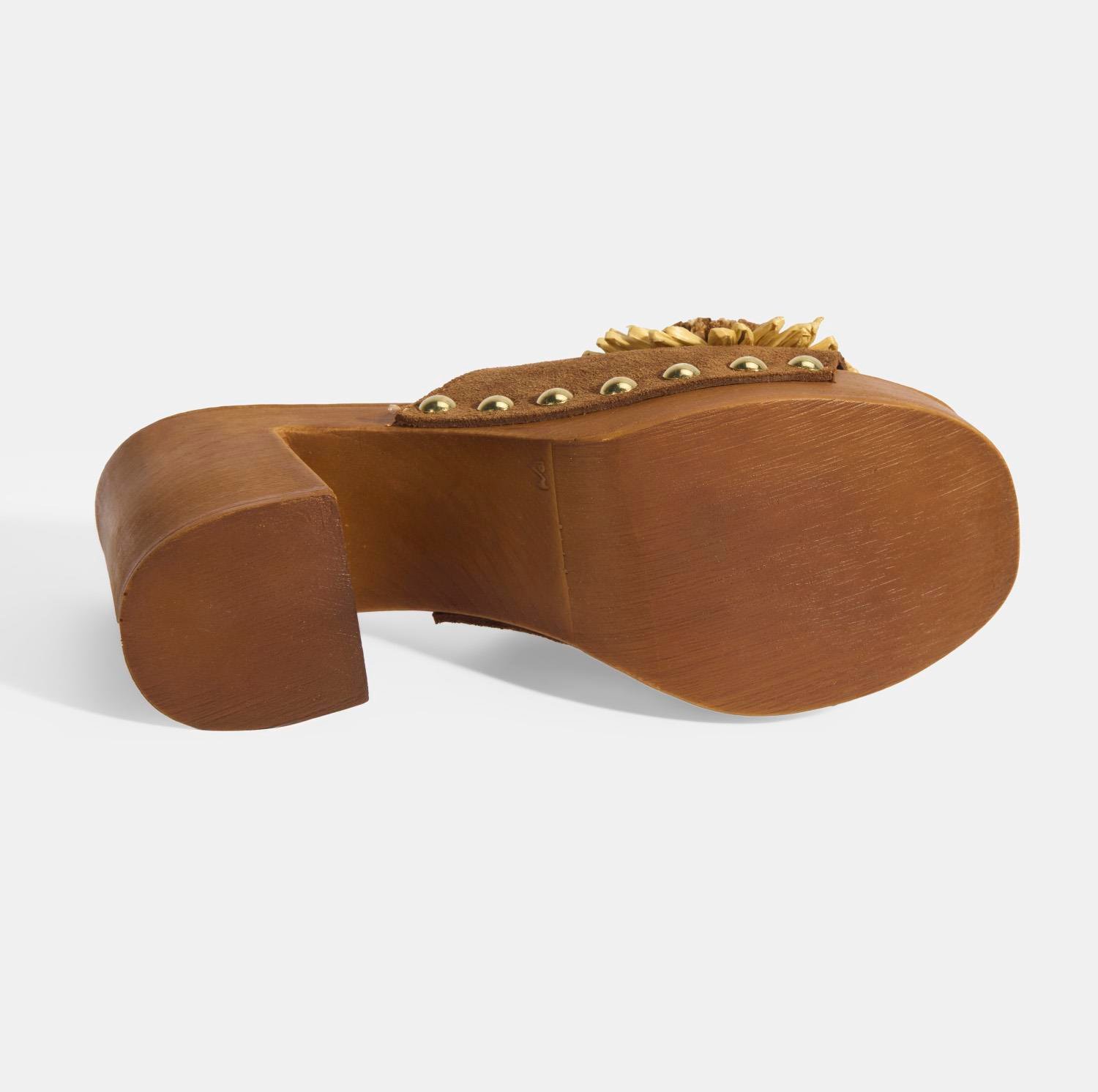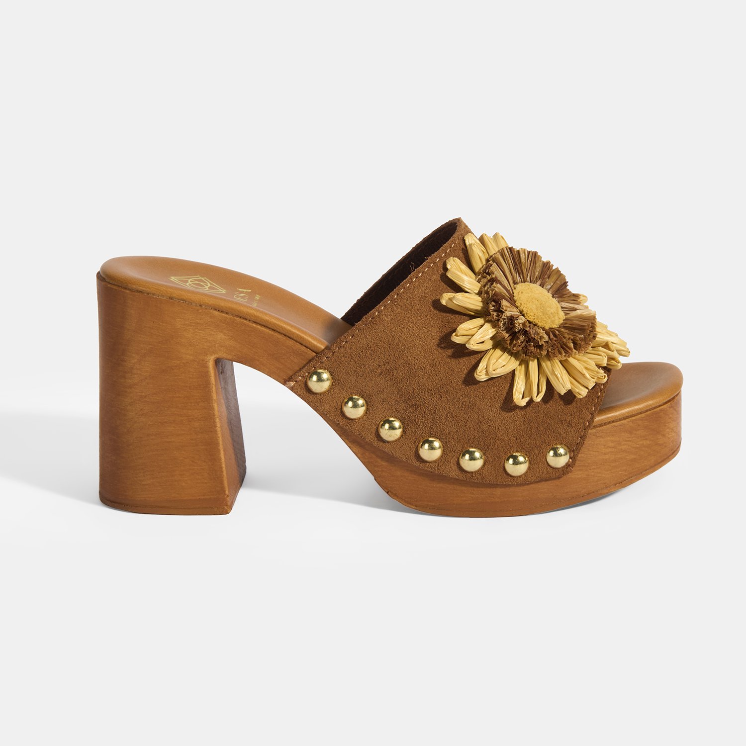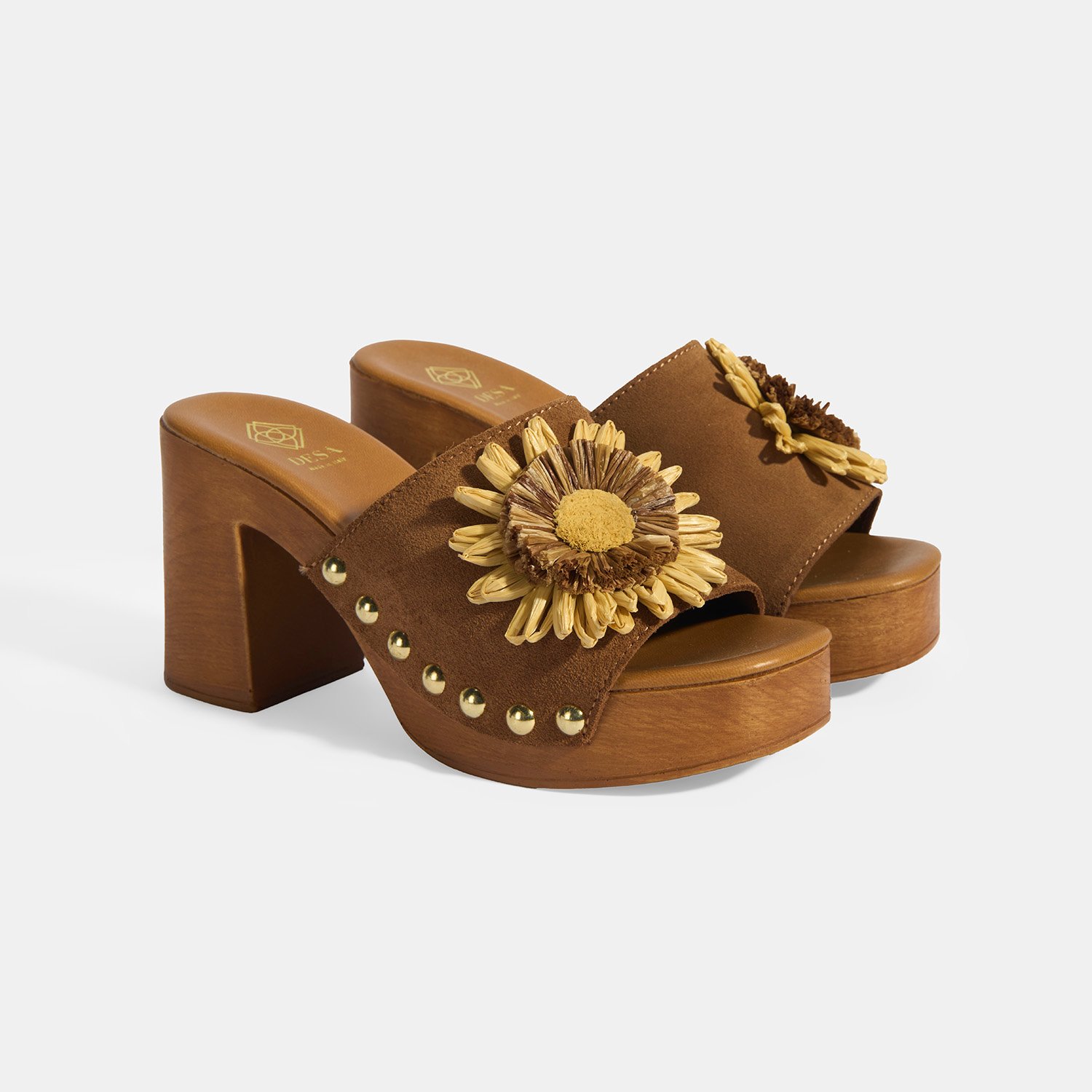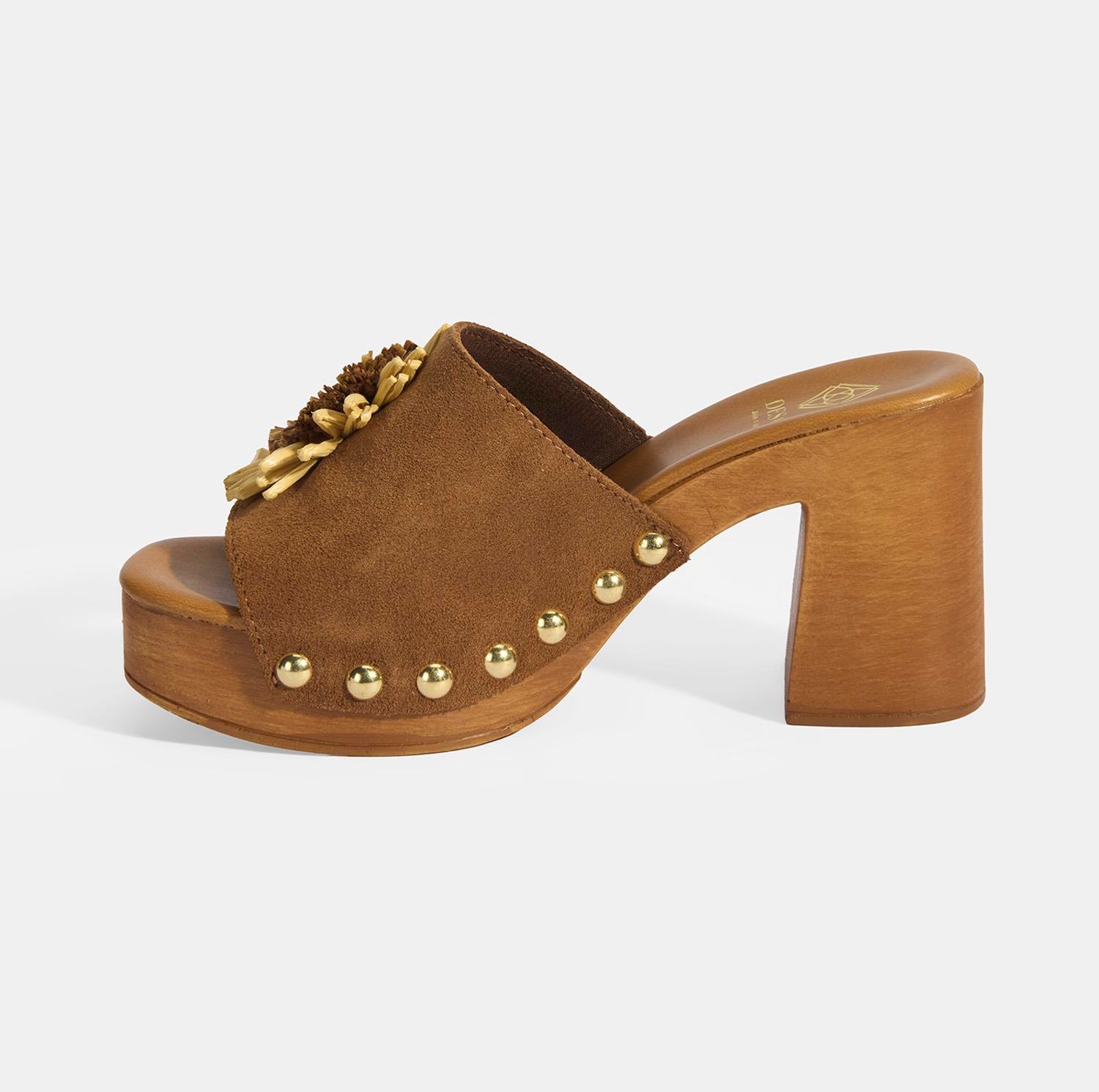 Kadın Taba Çiçek Aksesuarlı Süet Topuklu Terlik