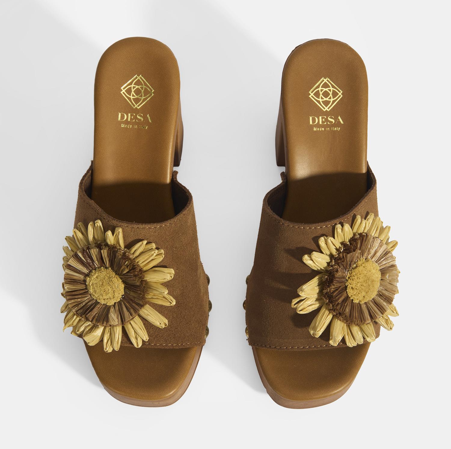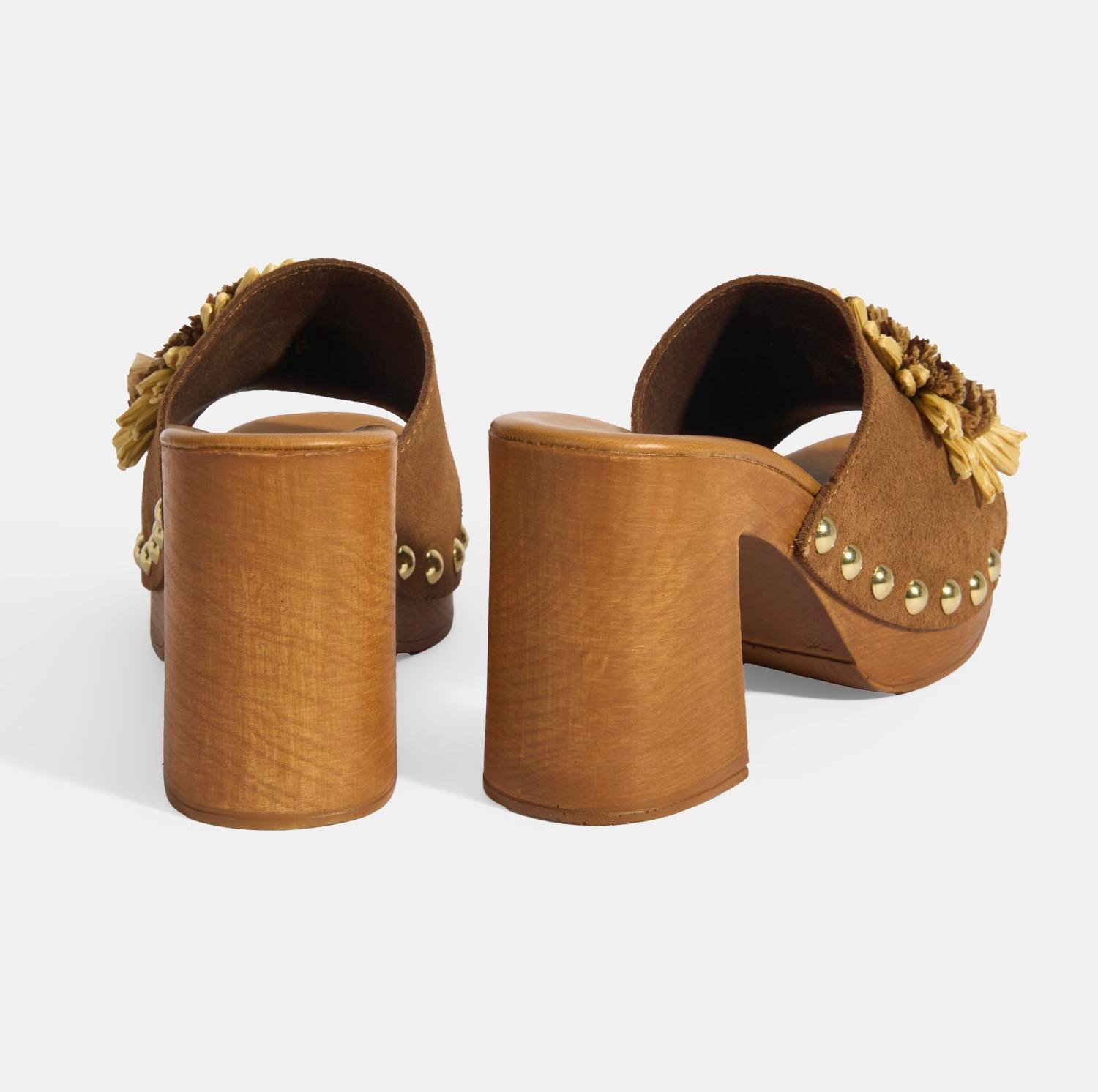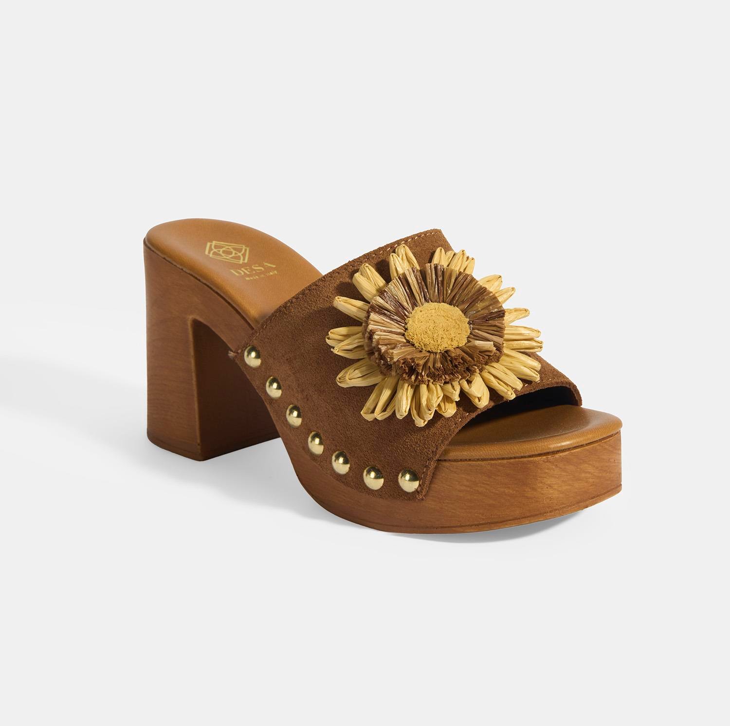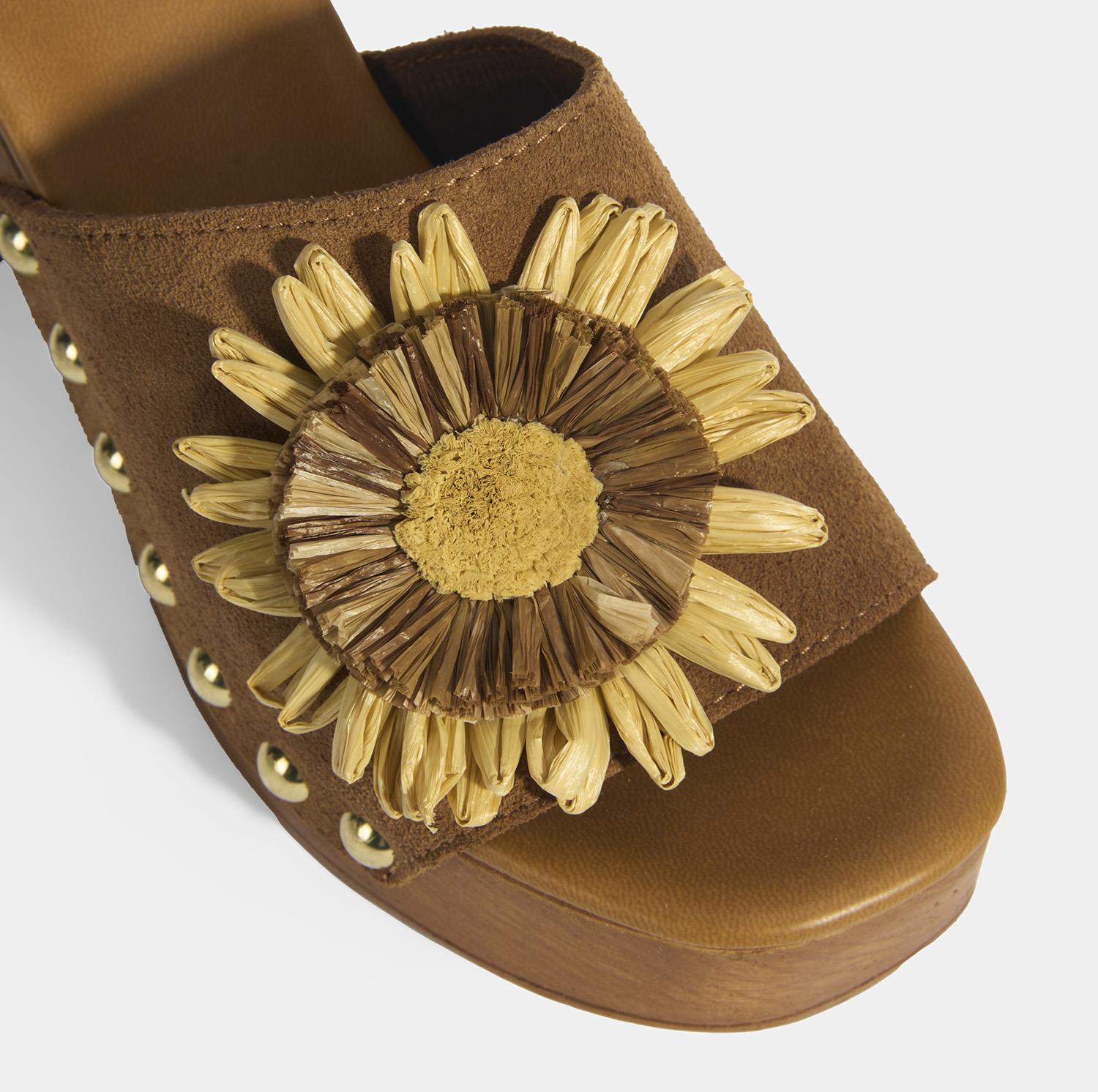 %100 deri, deri astarlı, pu iç tabanlı, hasır çiçek aksesuar detaylı, kadın topuklu terlik.