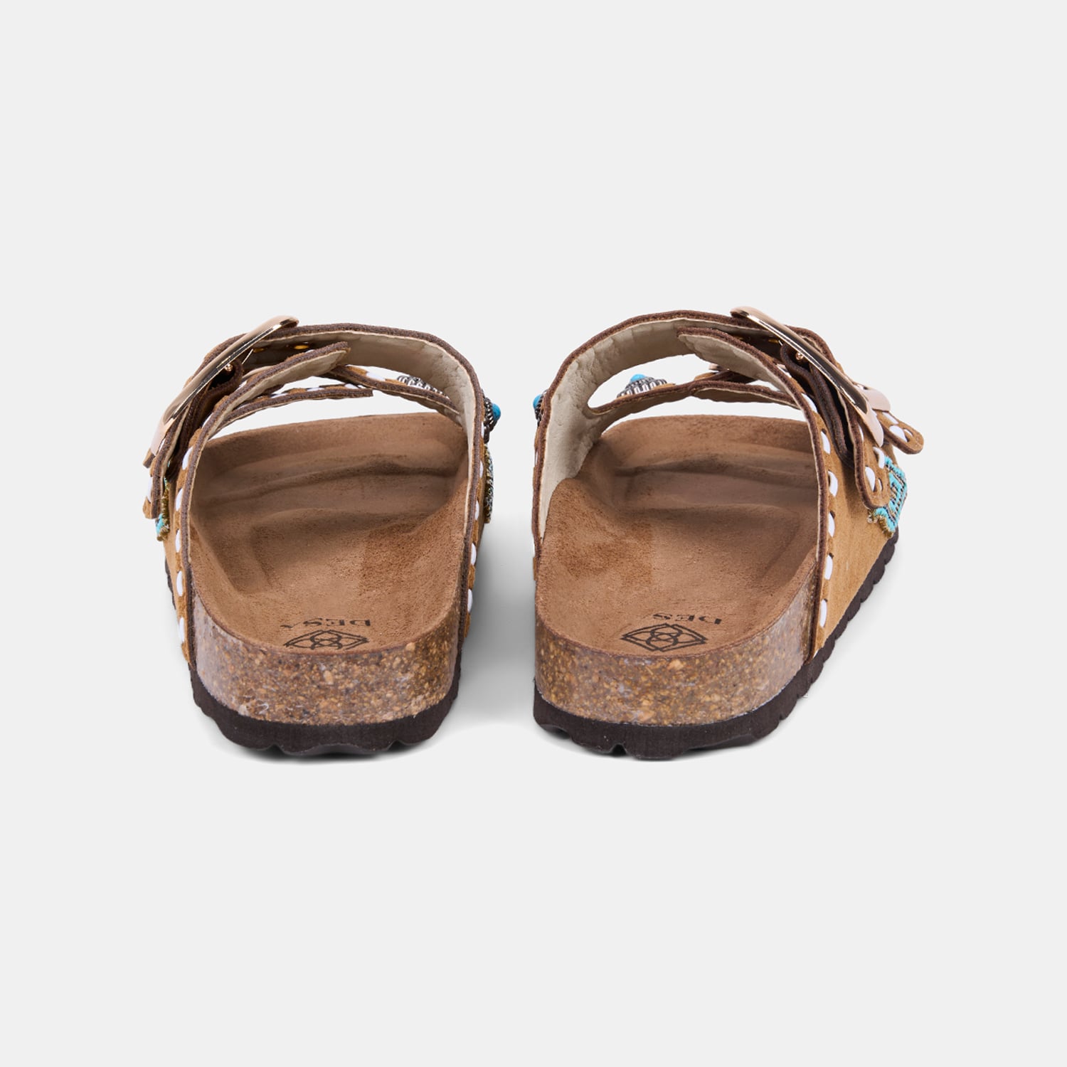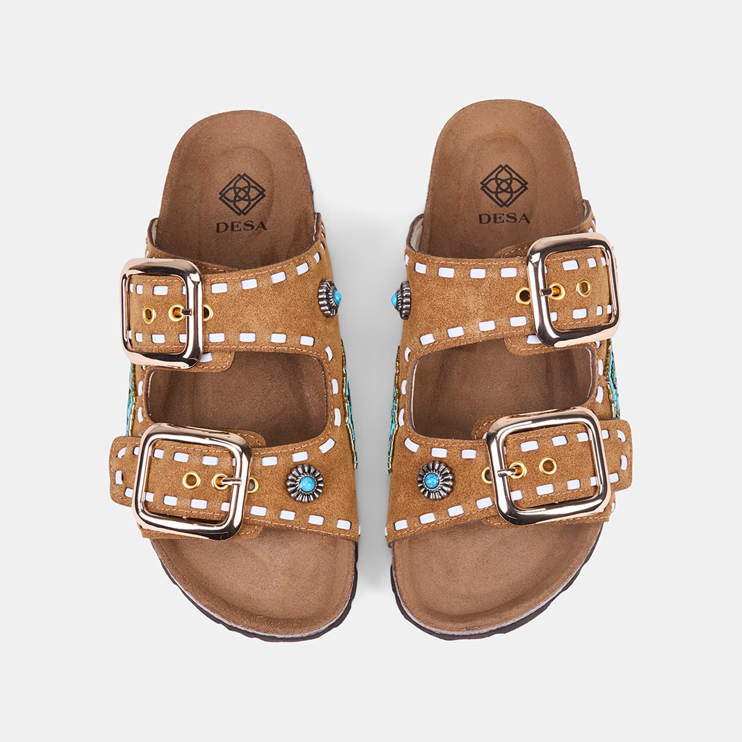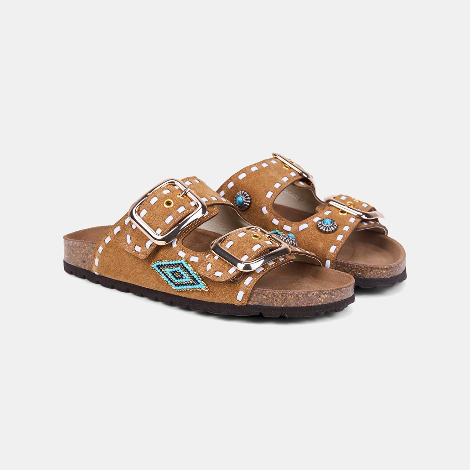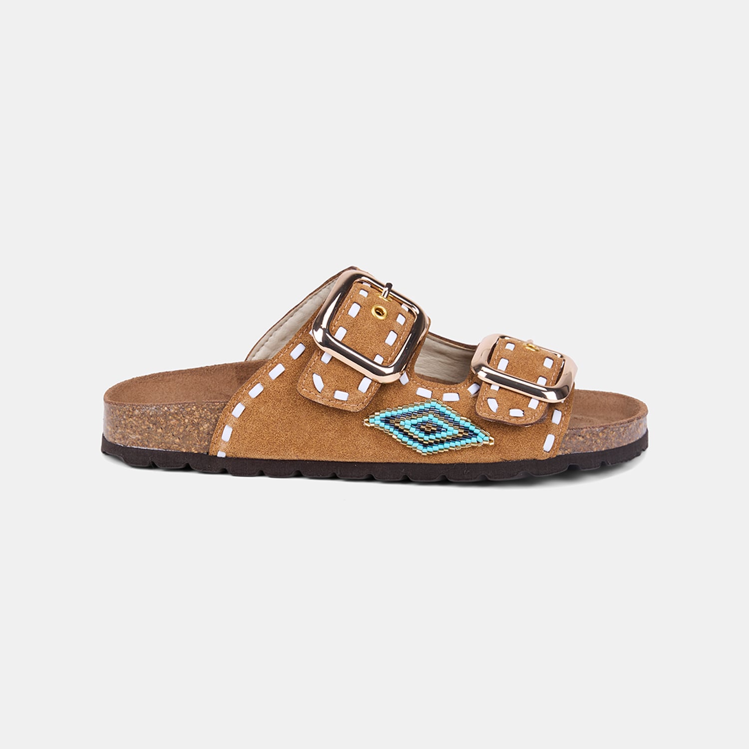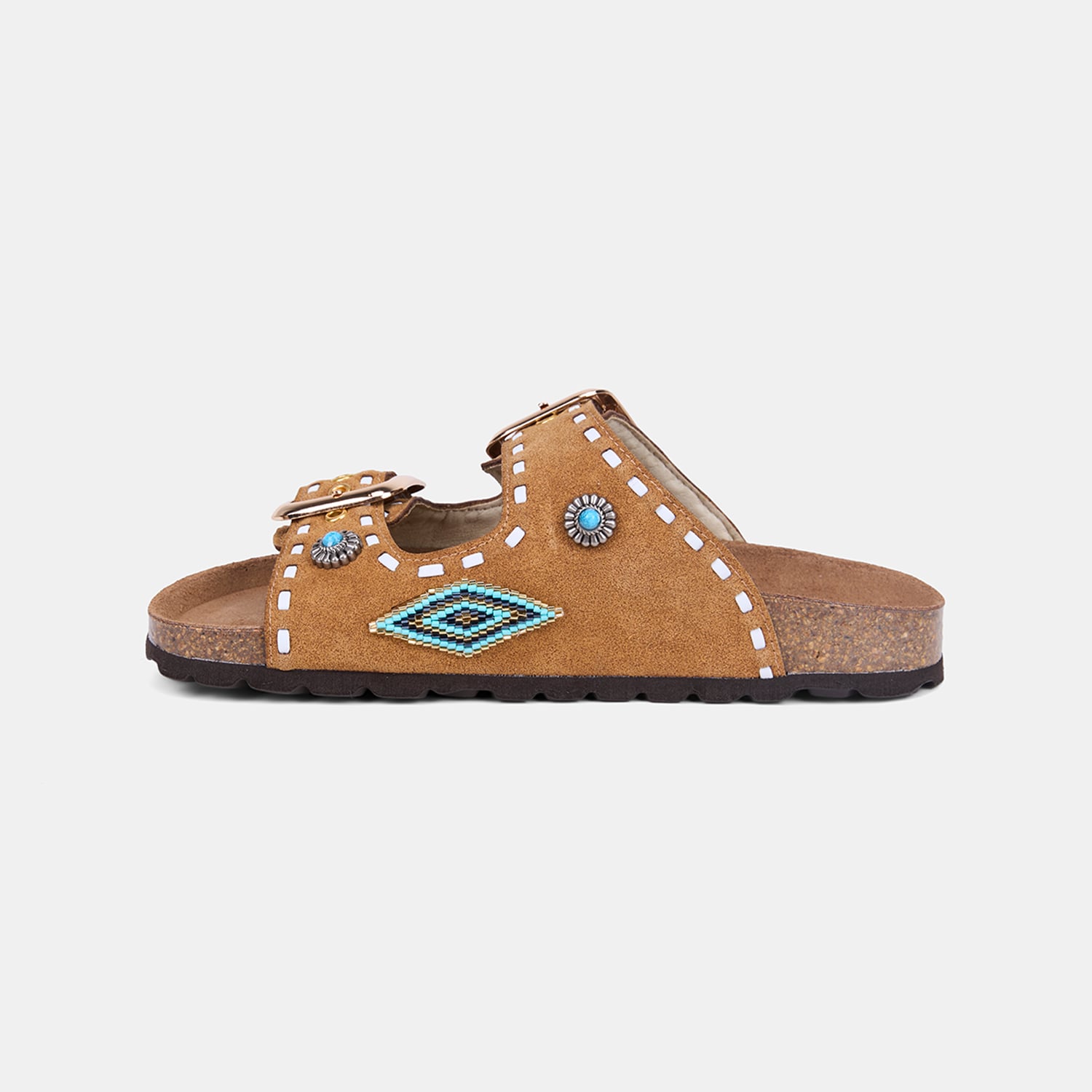 Kadın Taba Çift Metal Tokalı Boncuklu Etnik Desenli Süet Terlik