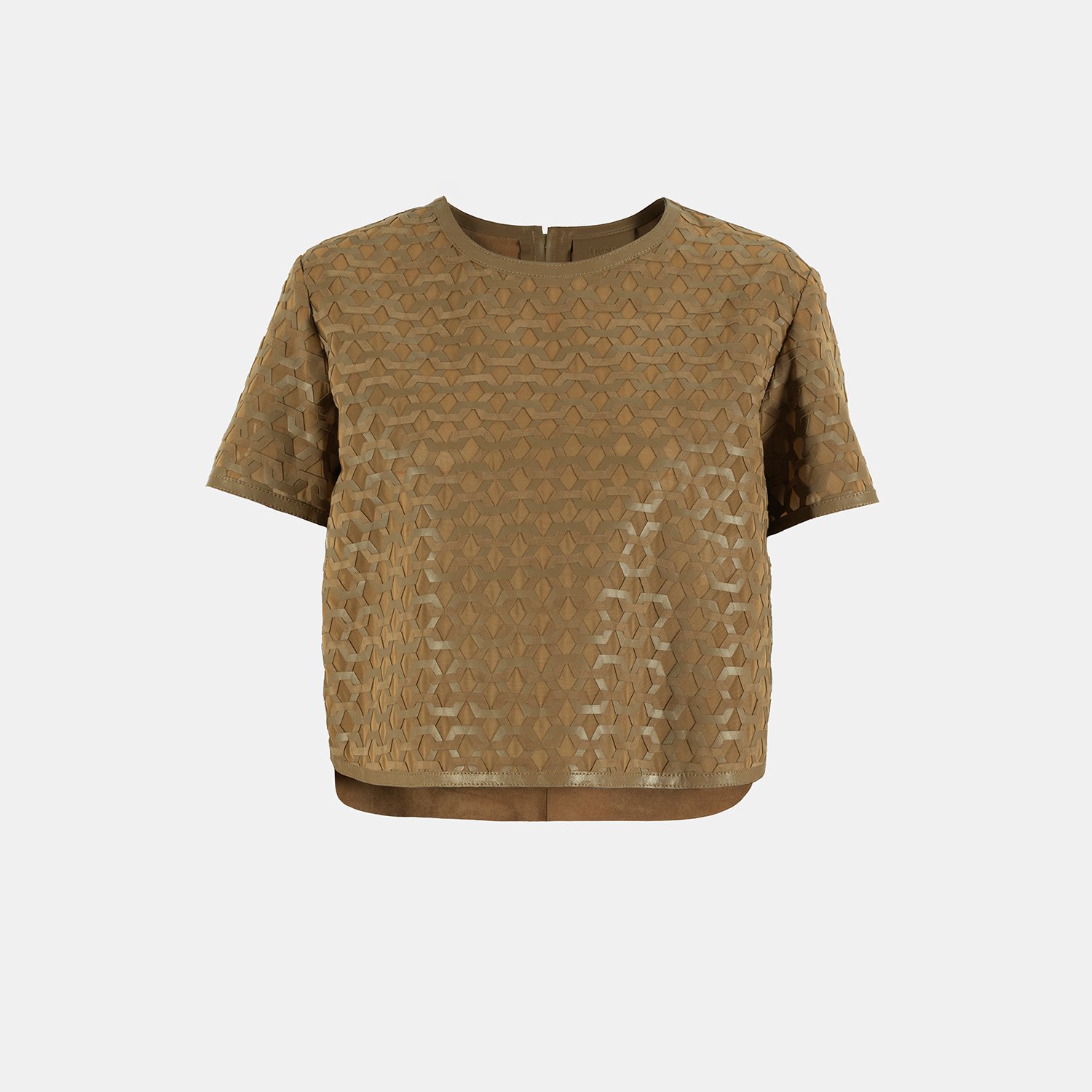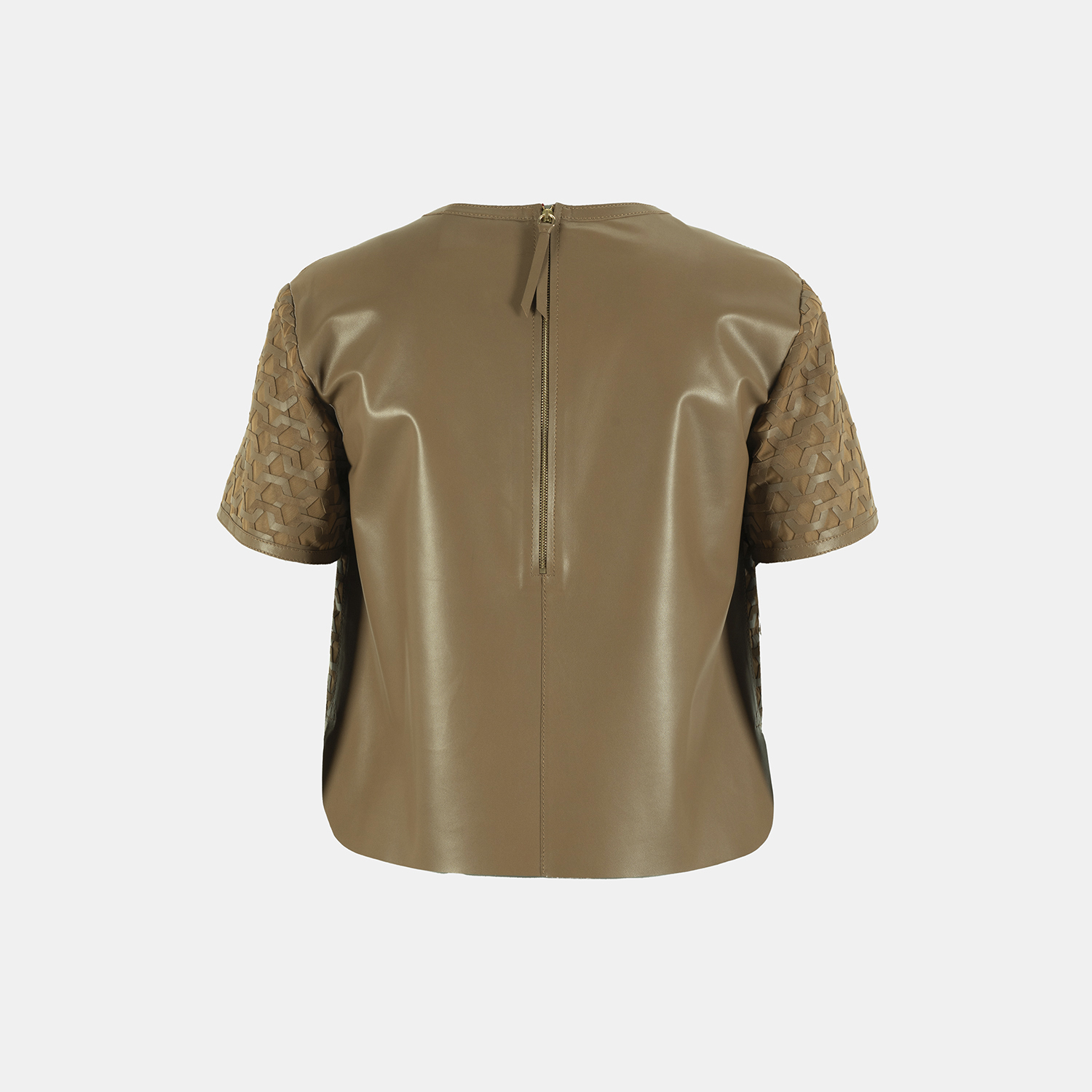 Kadın yuvarlak yakalı deri bluz, arkadan metal fermuar kapamalıdır.