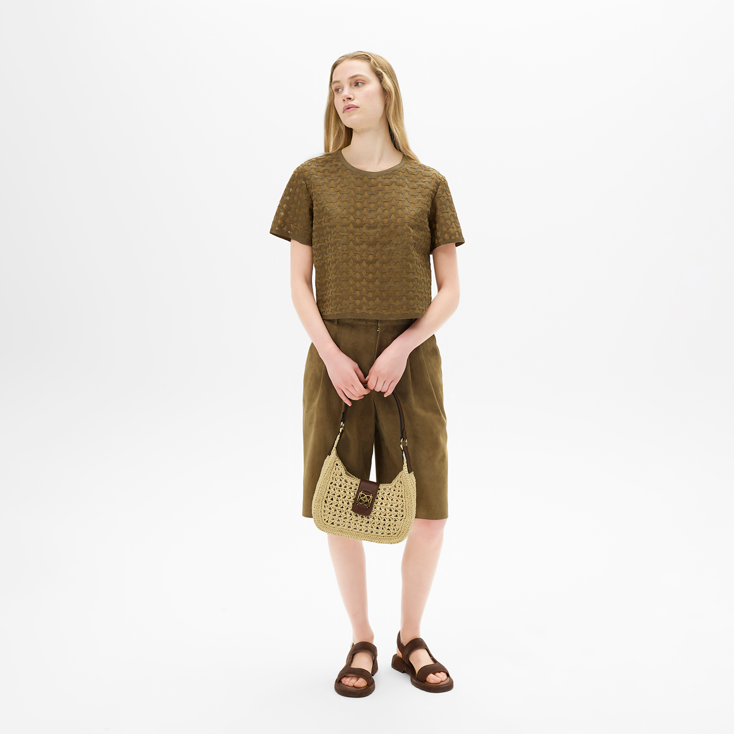 Ön yüzünde özel olarak tül üzerine lamine tekniği ile deri ve süet harmanlaştırarak geometrik şekiller ile hareketlilik verilmiştir.