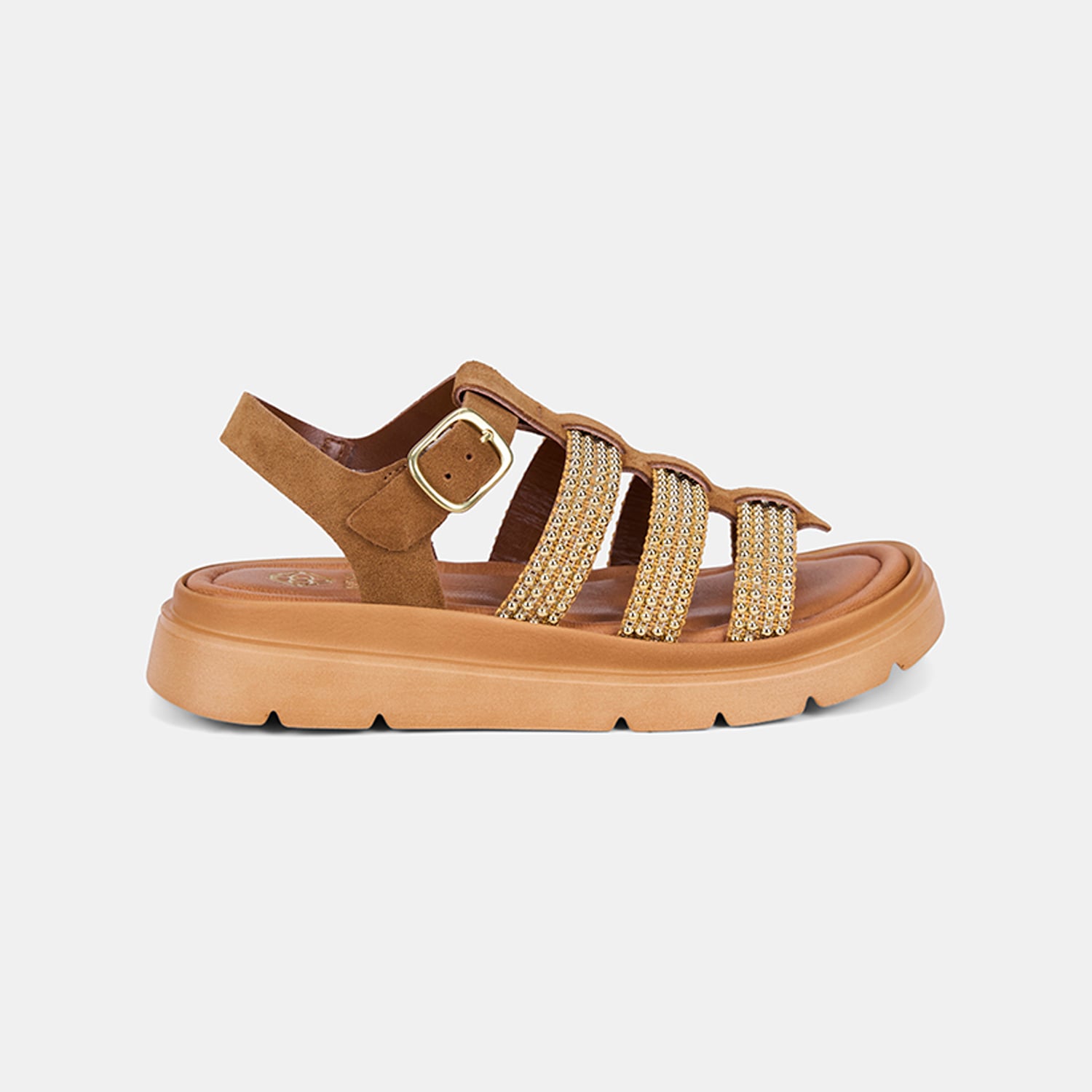 Kadın Taba Metal Aksesuarlı Parlak Şeritli Sandalet