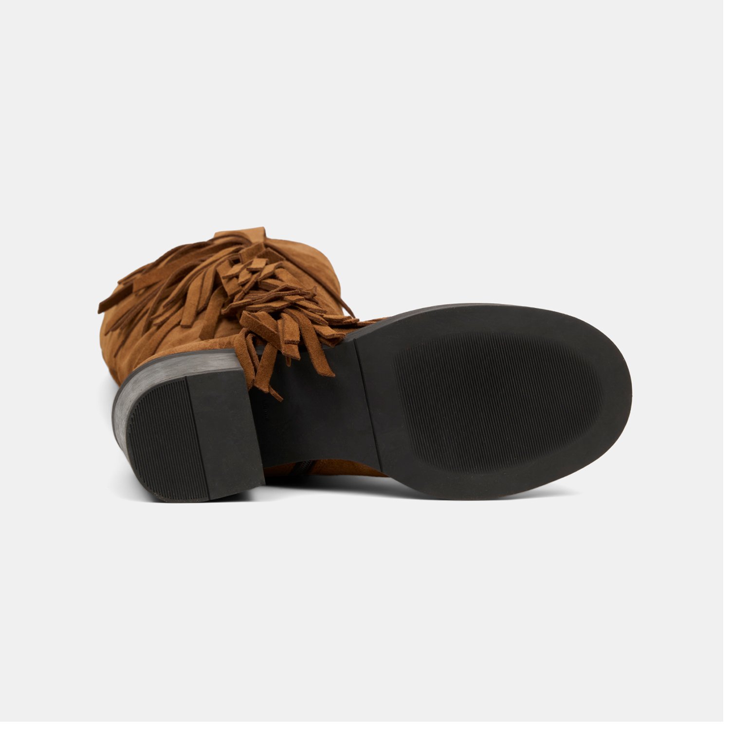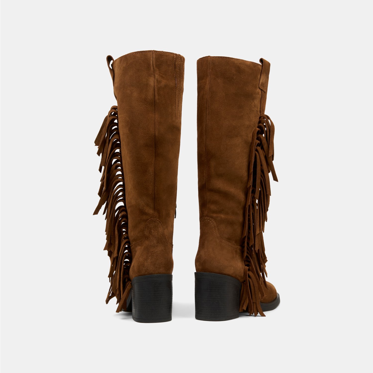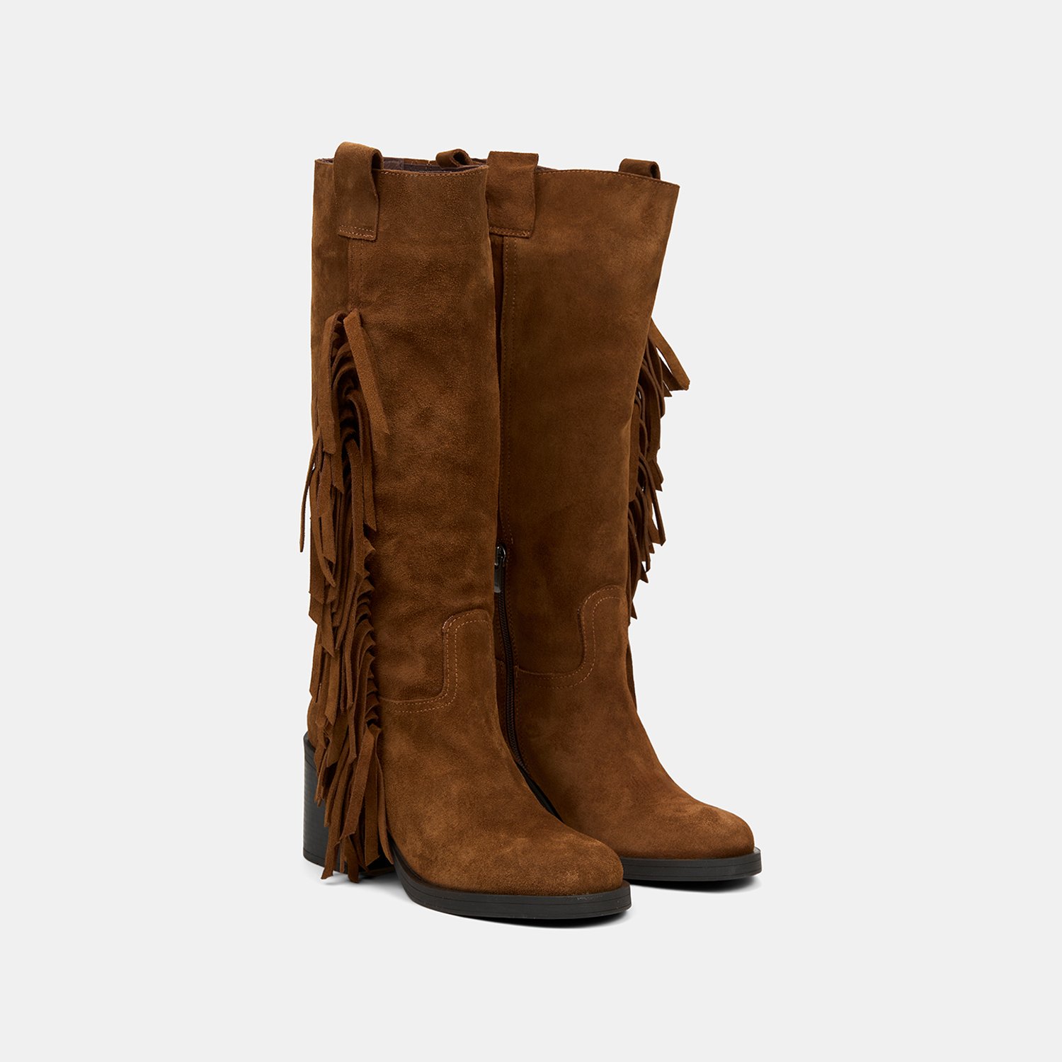 %100 süet deri, deri iç tabanlı, sıcak tekstil astarlı, püskül detaylı, termo tabanlı kadın çizme. Topuk yüksekliği: 4,5 cm.