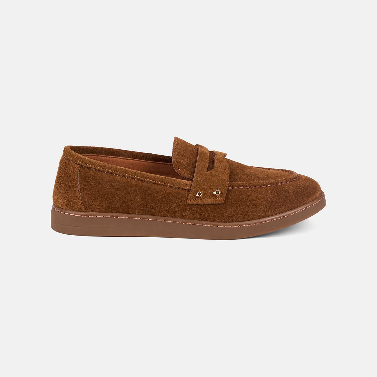 Kadın loafer, süet yüzeyi ve metal zımba detaylarıyla klasik formu modern ve güçlü bir stile dönüştüren şık bir tasarıma sahiptir.