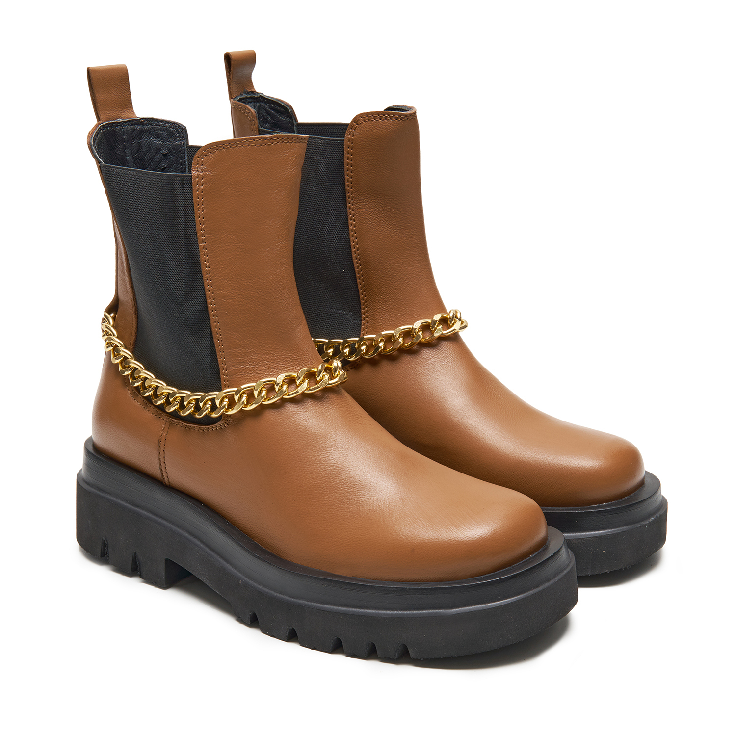 Napa deri, deri iç tabanlı,lastikli ,zincir aksesuarlı,esnek ve hafif poliüretan tabanlı kadın bot.Taban yüksekliği;4 cm.