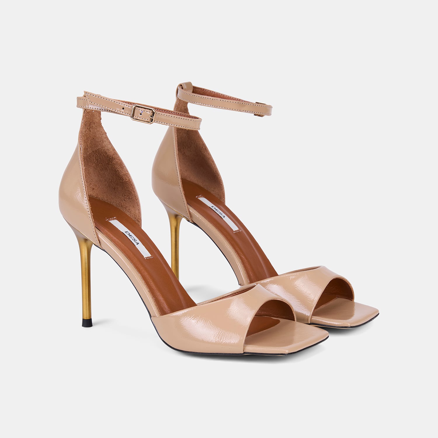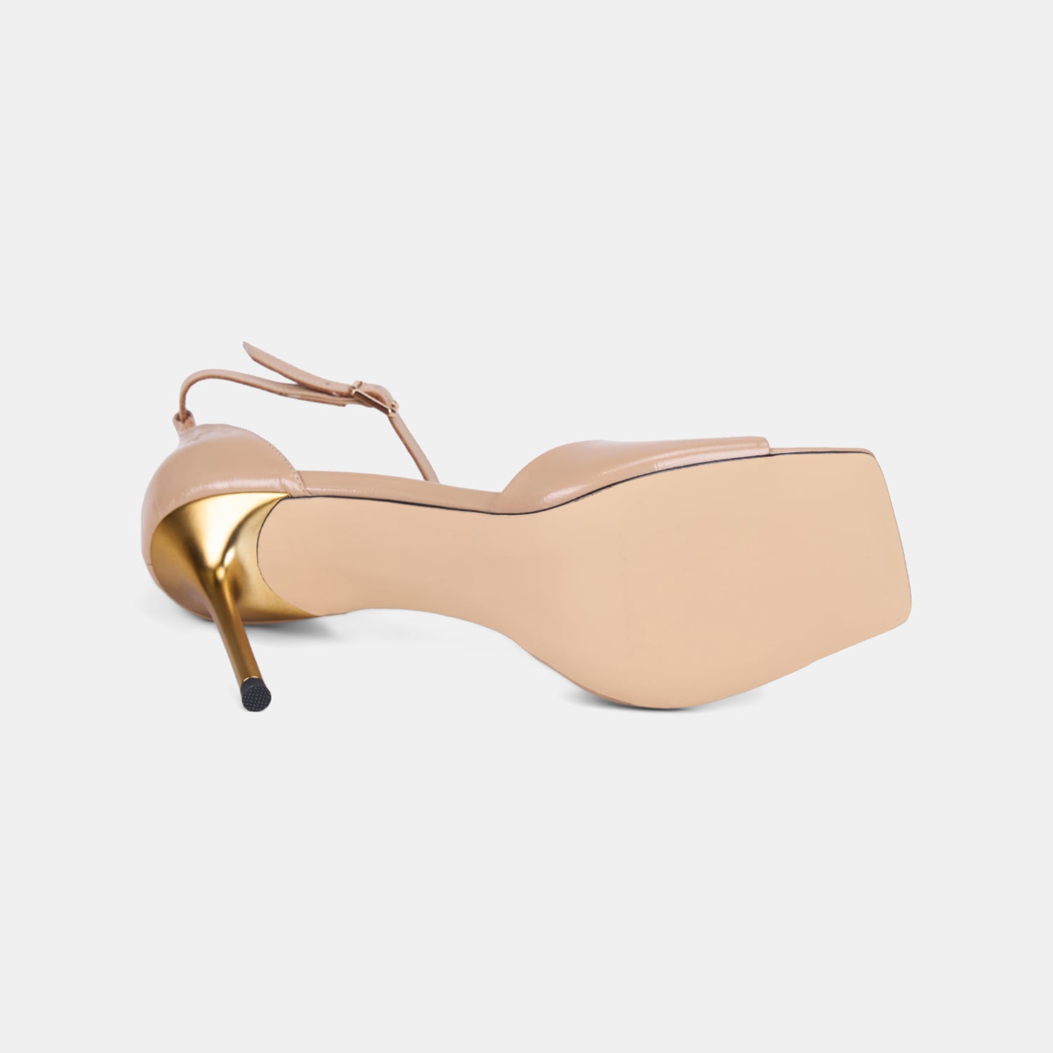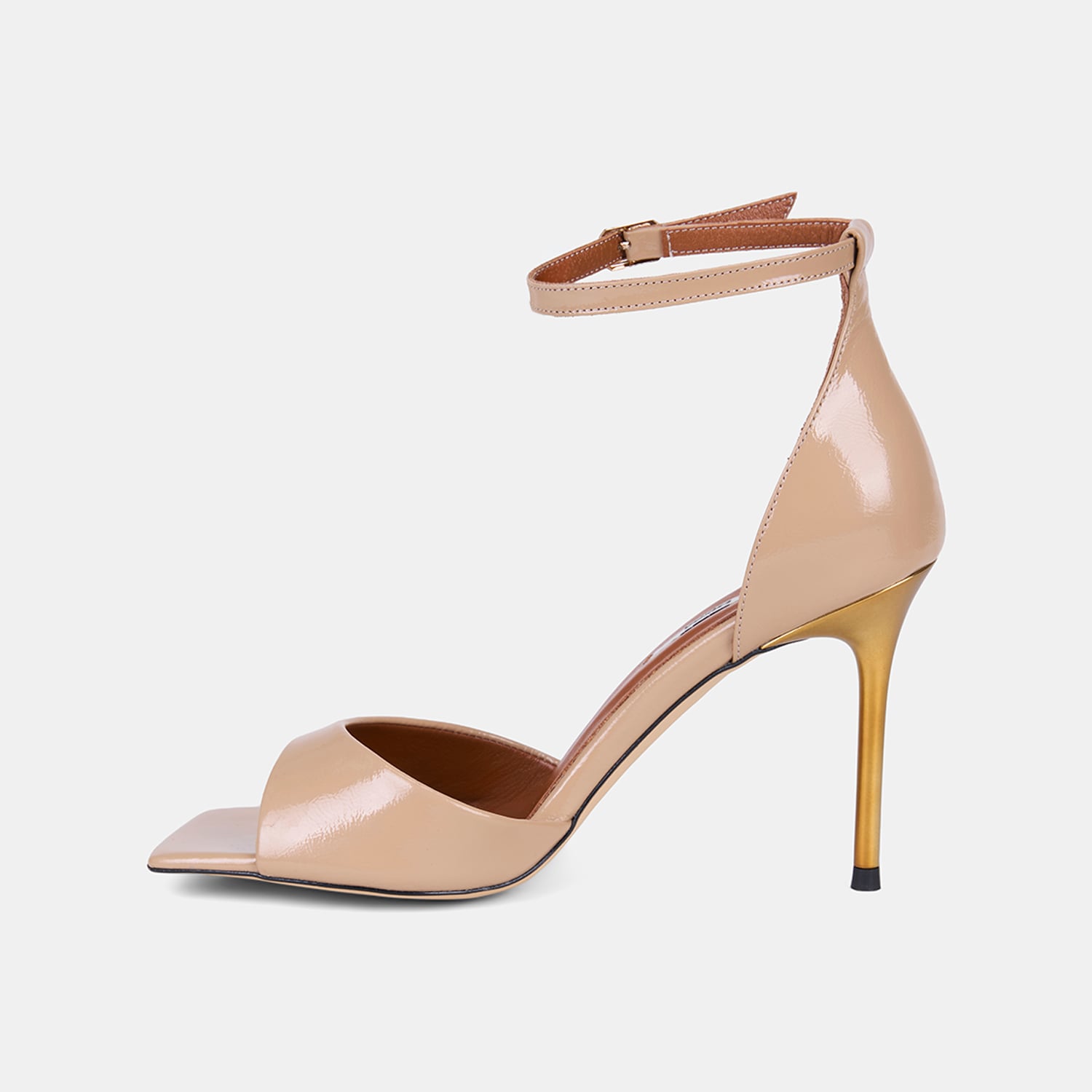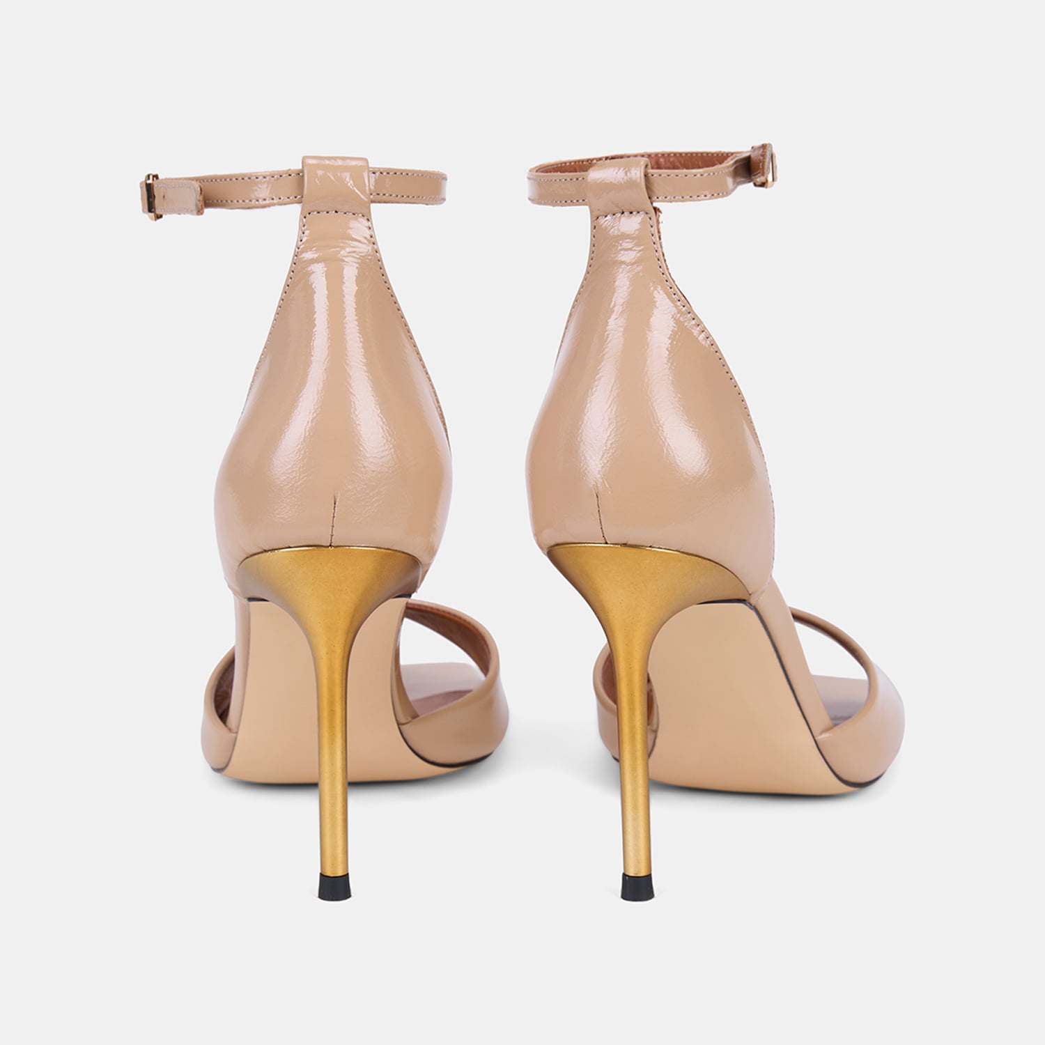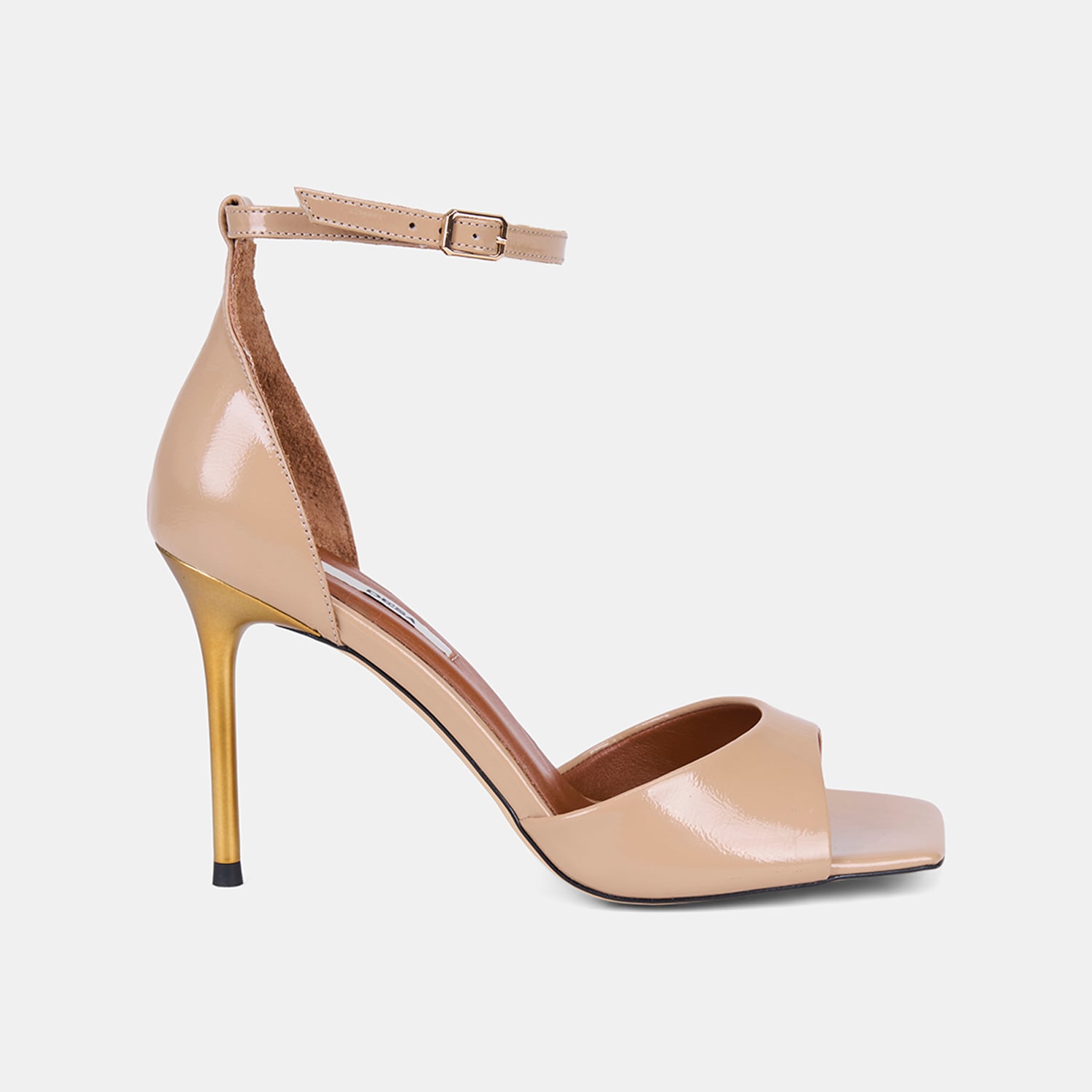 Kadın rugan deri topuklu abiye sandalet, tek bantlı tasarımı ve ince topuk formuyla özel davetlerde öne çıkan zarif bir modeldir.
