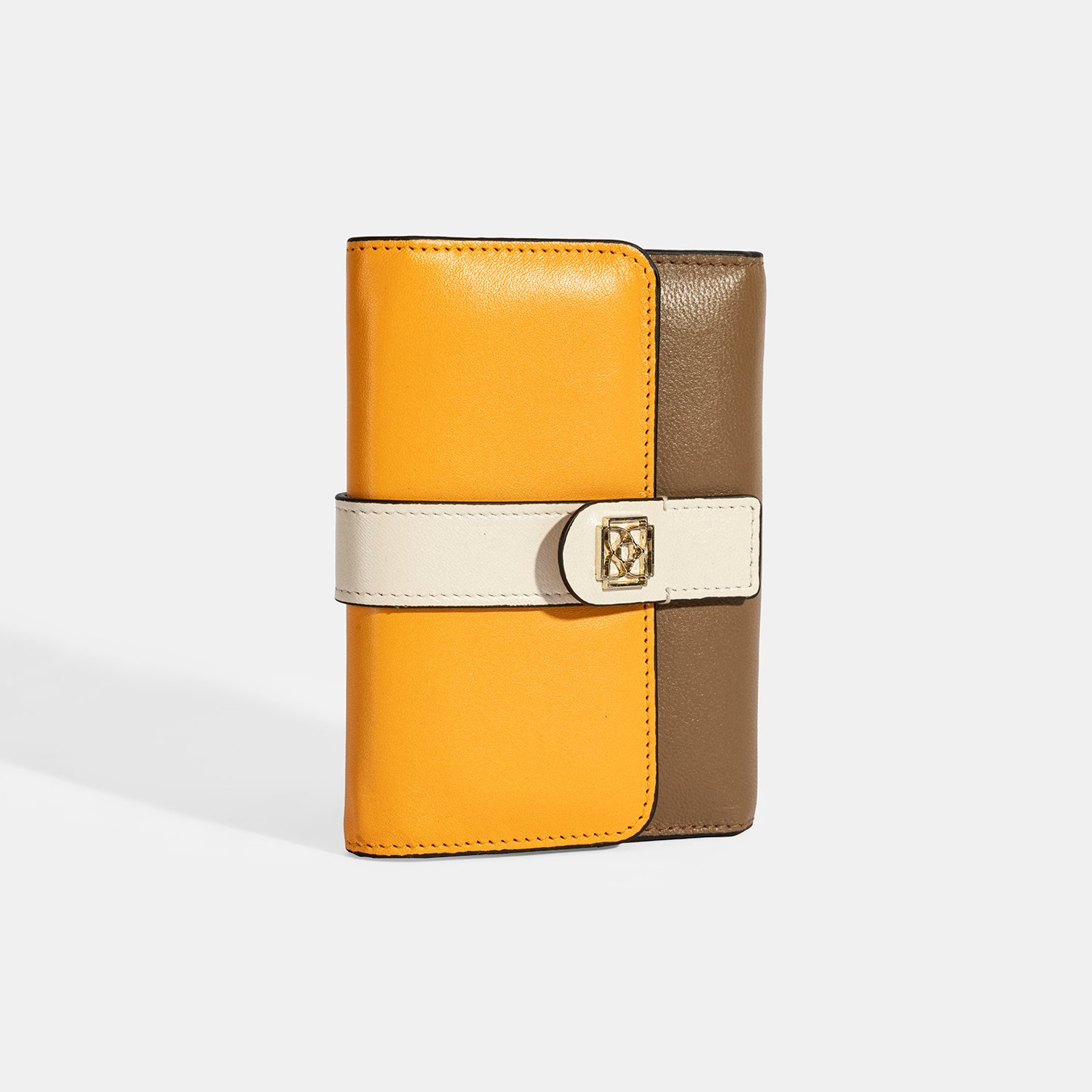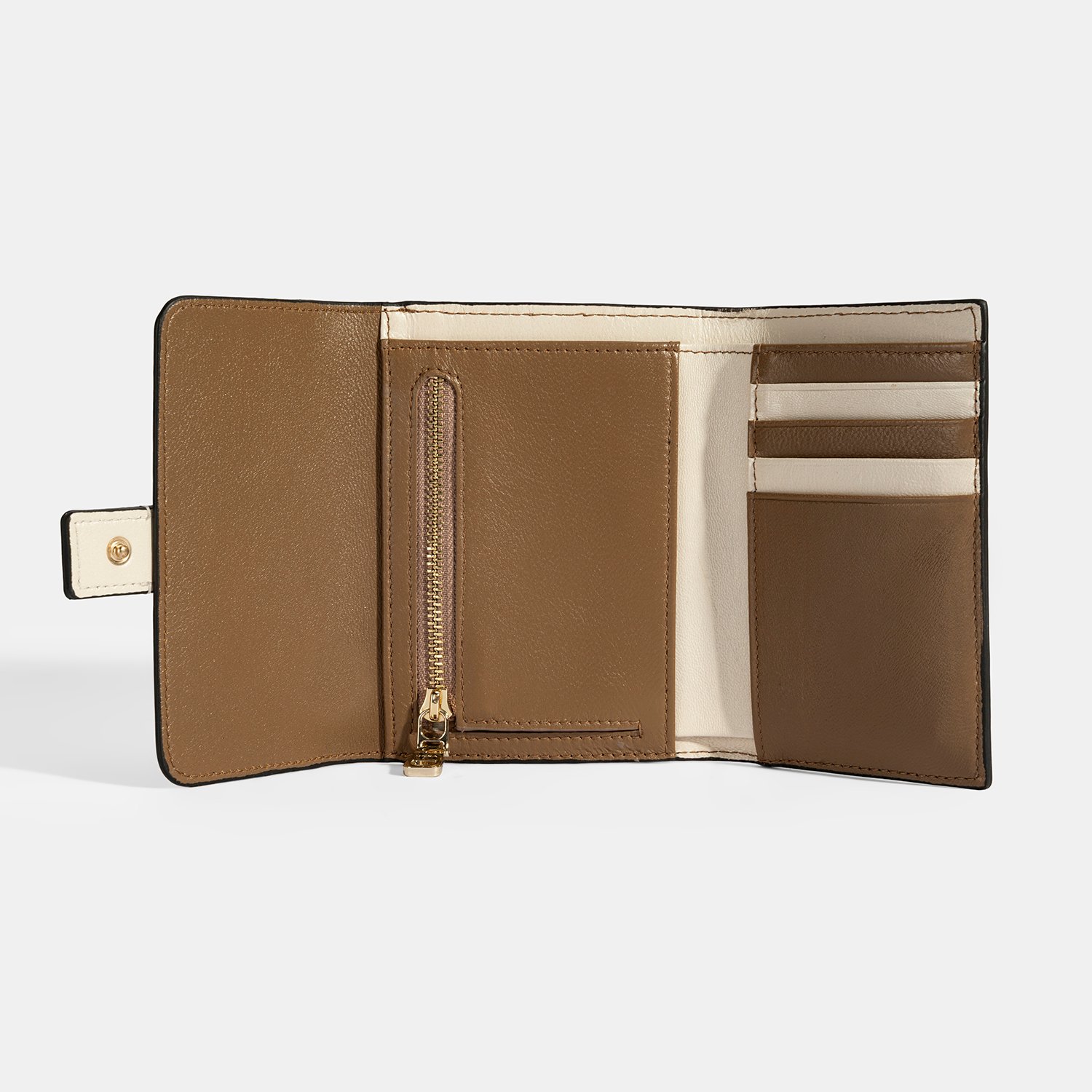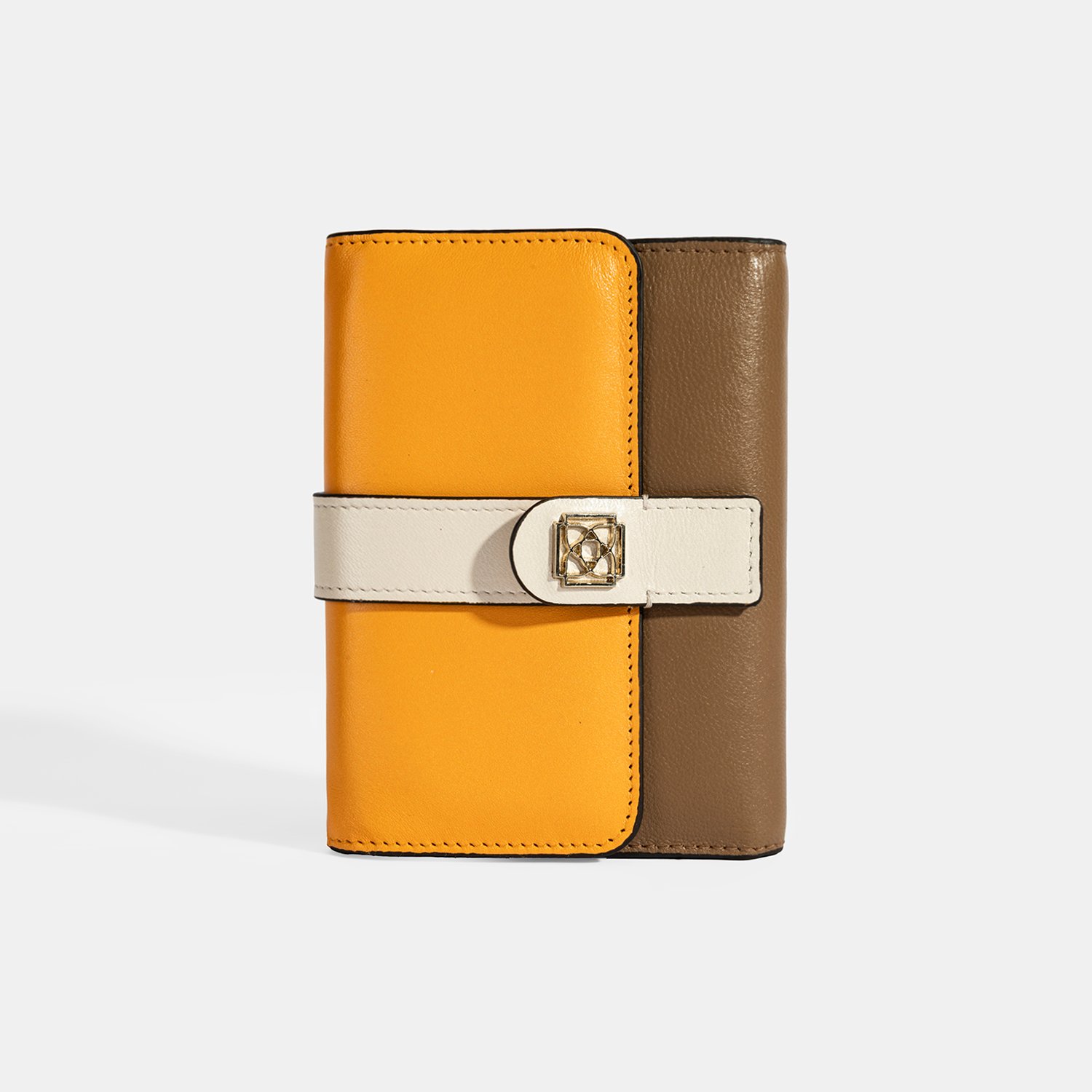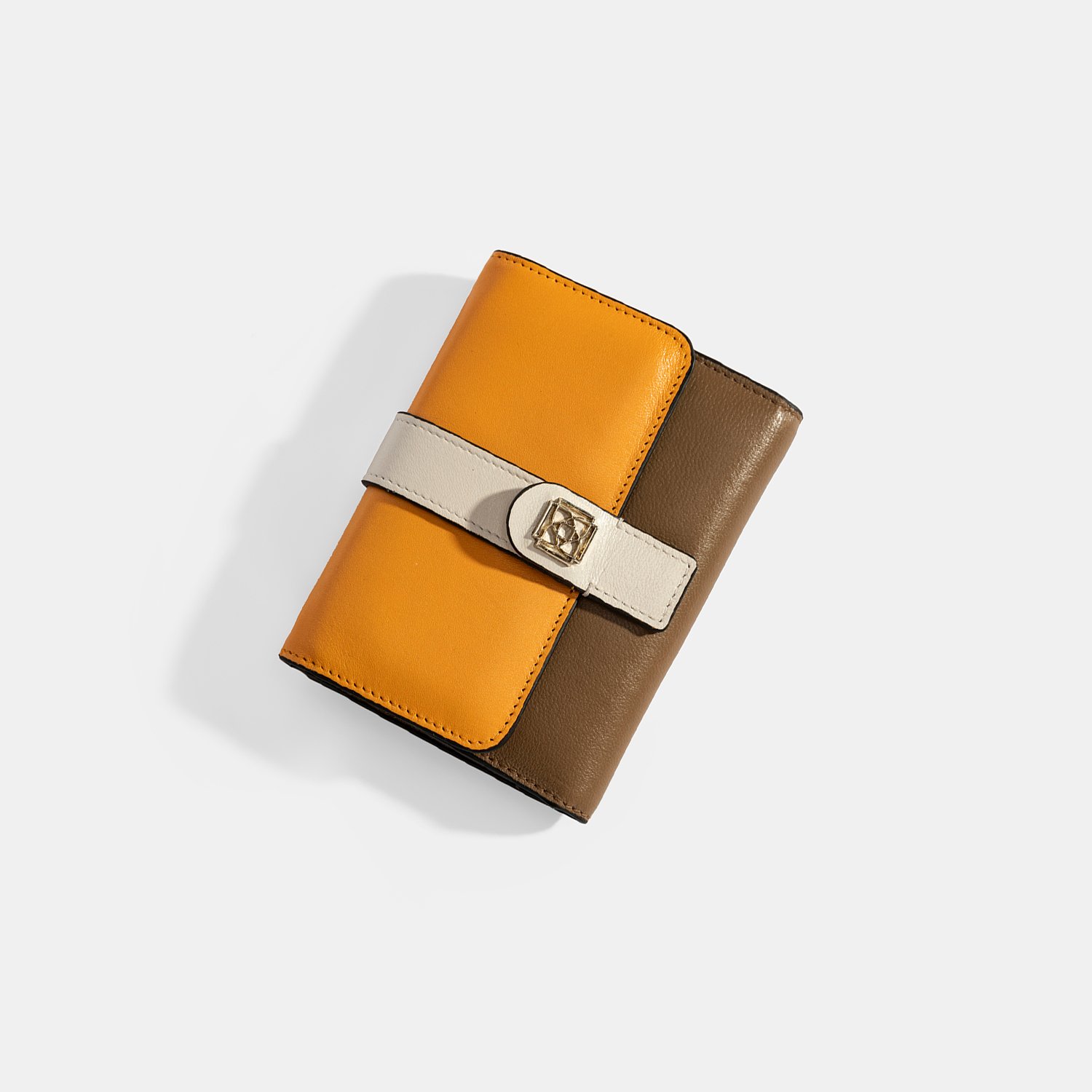 Çıtçıt kapamalı, parlak düz renkte ve çiçek logolu deri cüzdan.