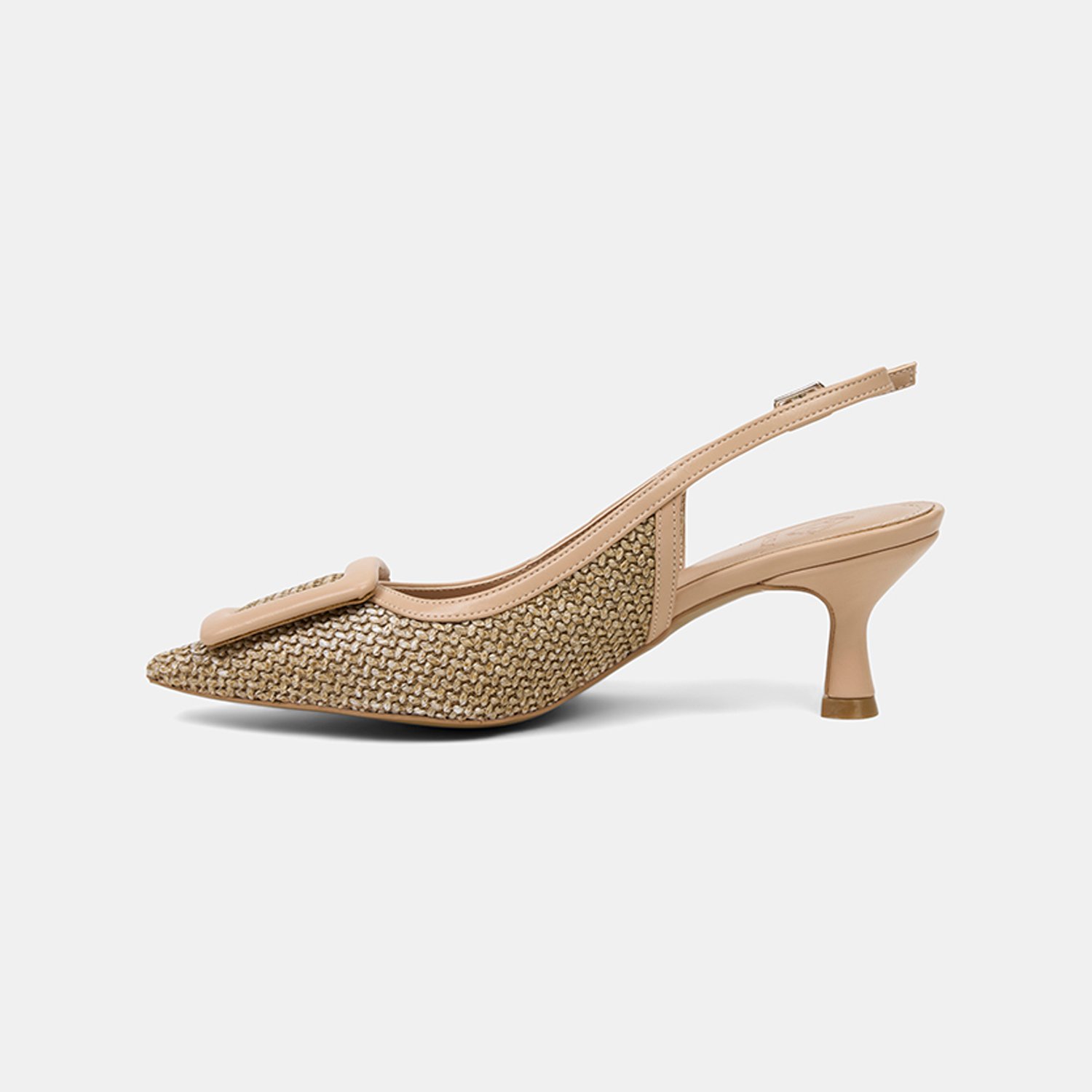 Hasır dokulu ayarlanabilir metal tokalı bant detayı, hem estetik hem de ayağa uyumlu bir kullanım imkânı sunar