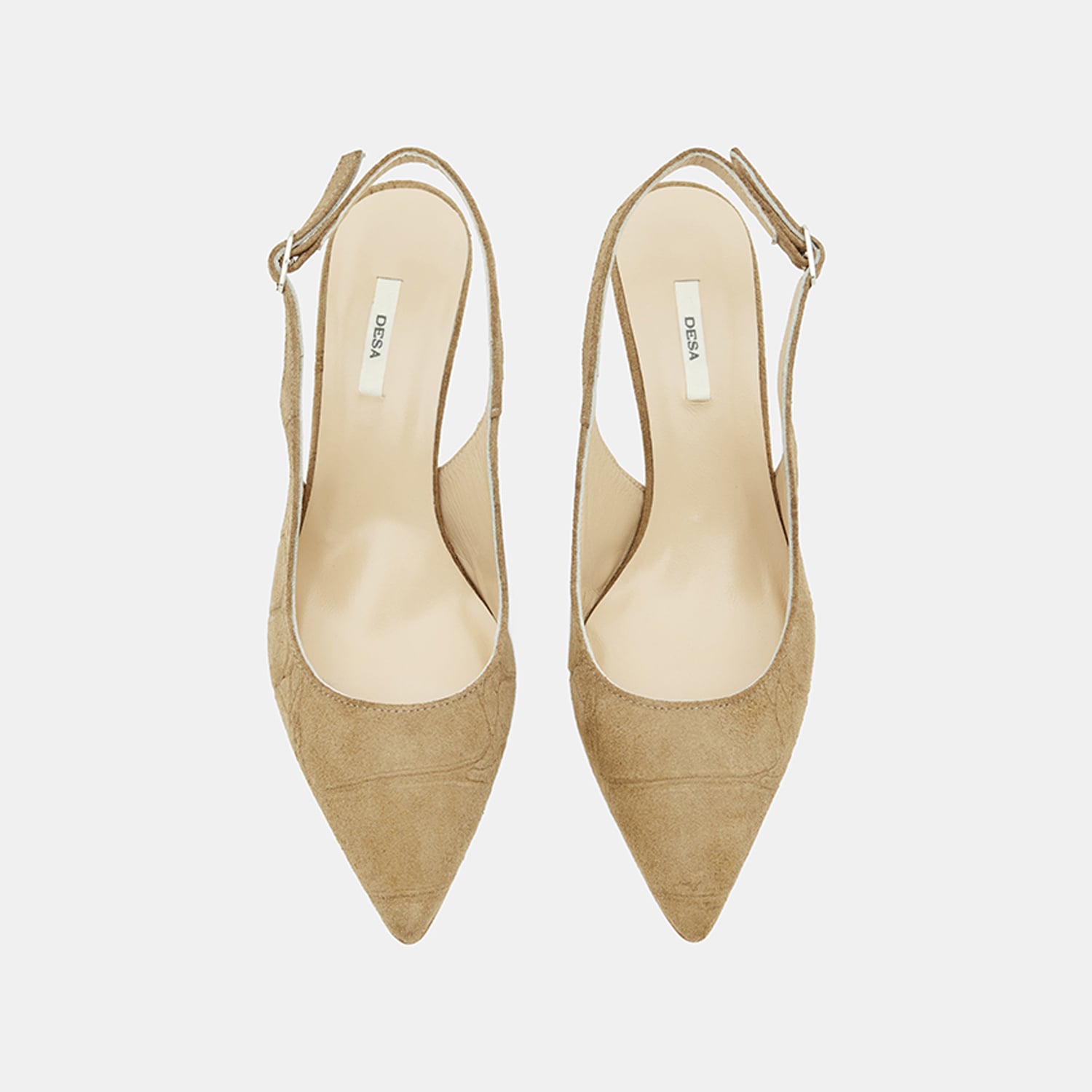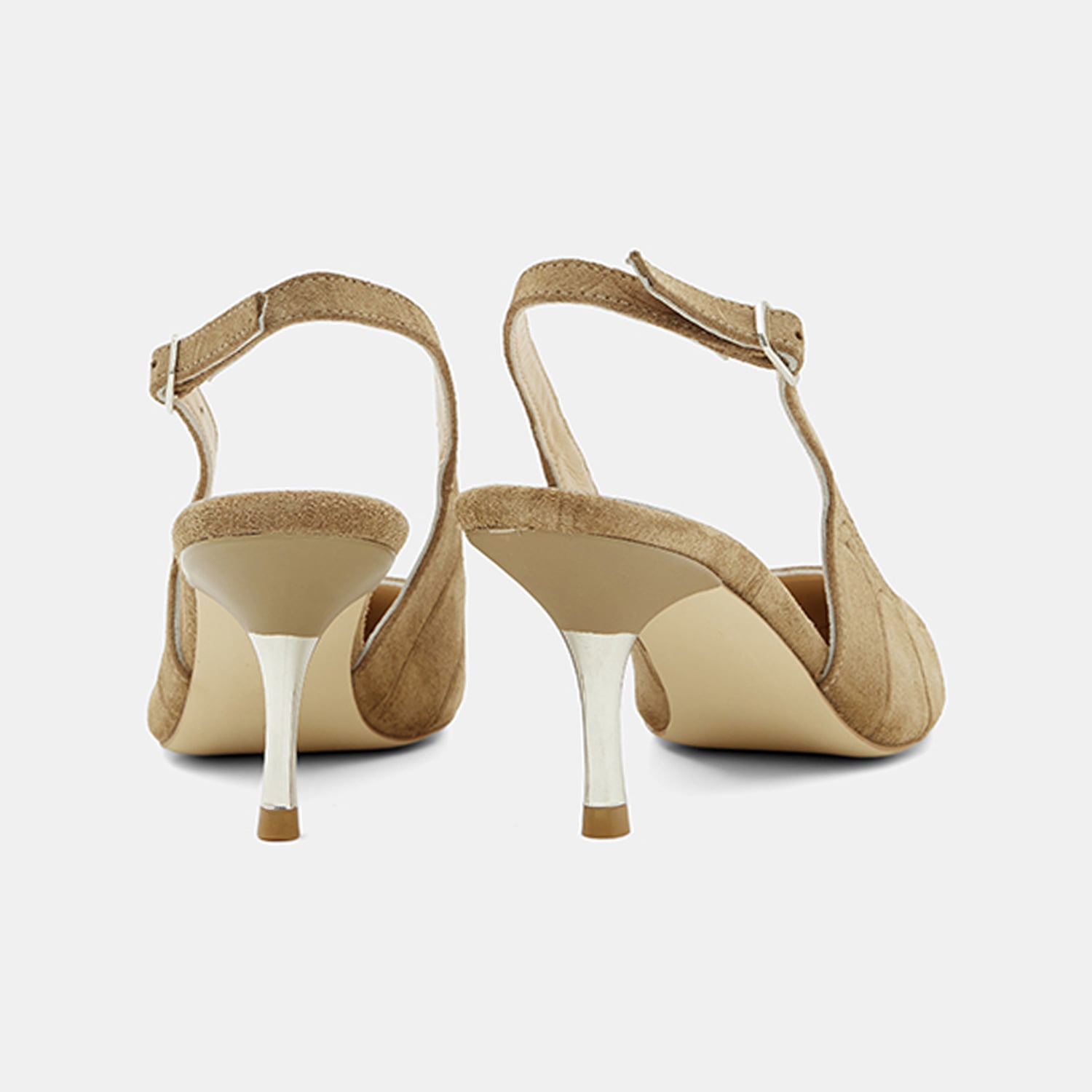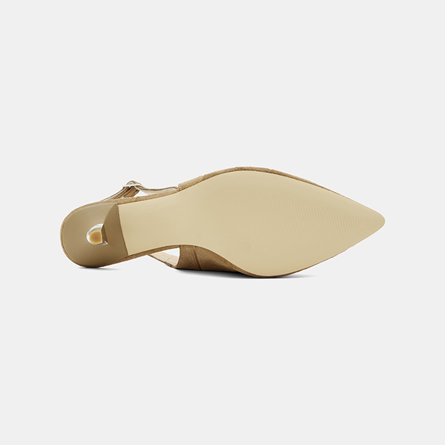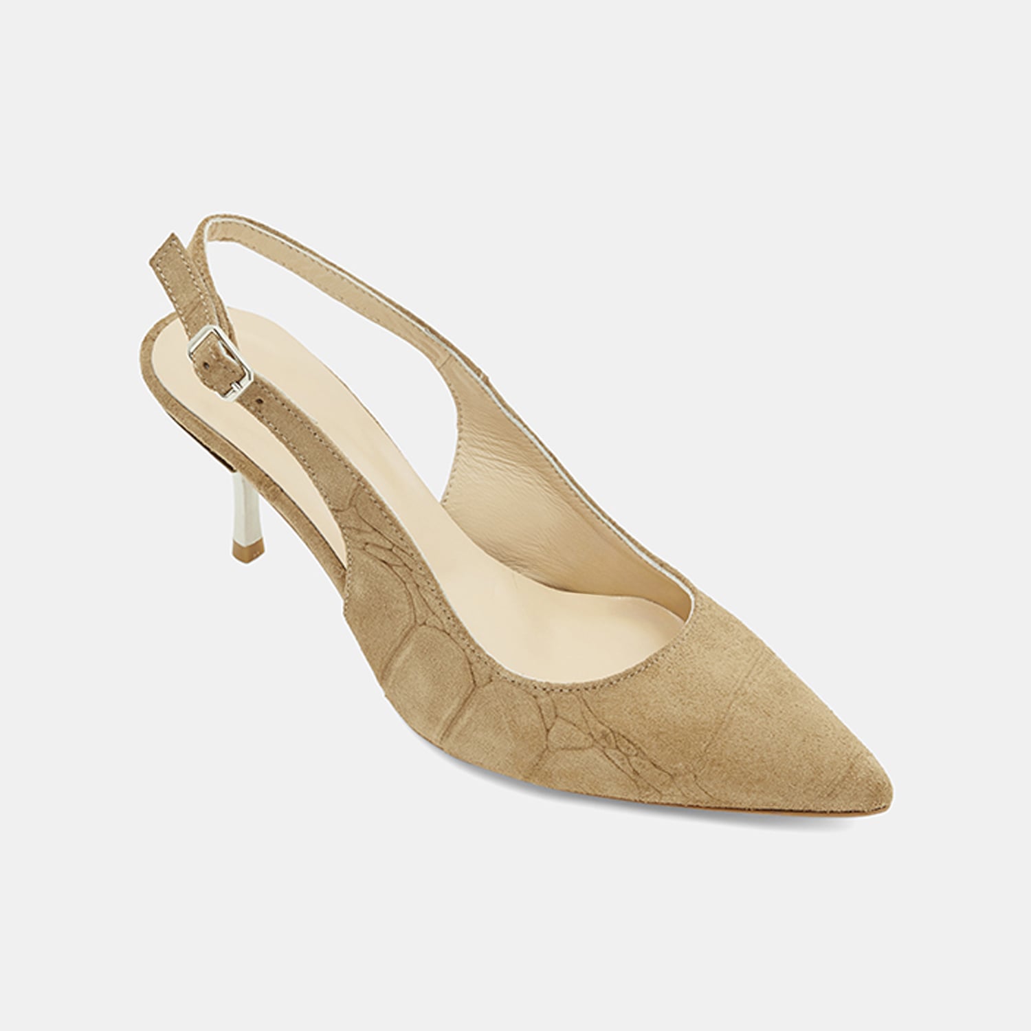 Kadın süet deri klasik topuklu ayakkabı, sivri burun formu ve dikkat çekici yüzeyiyle günlük kullanım ve şehir stiline uyum sağlayan şık bir modeldir.