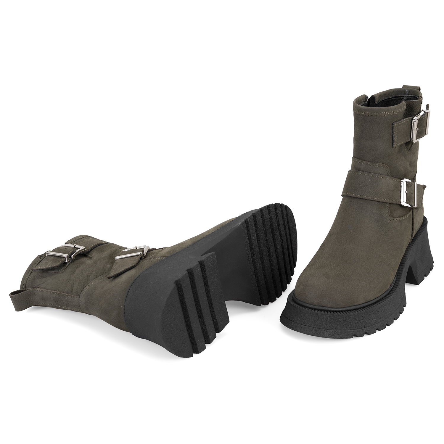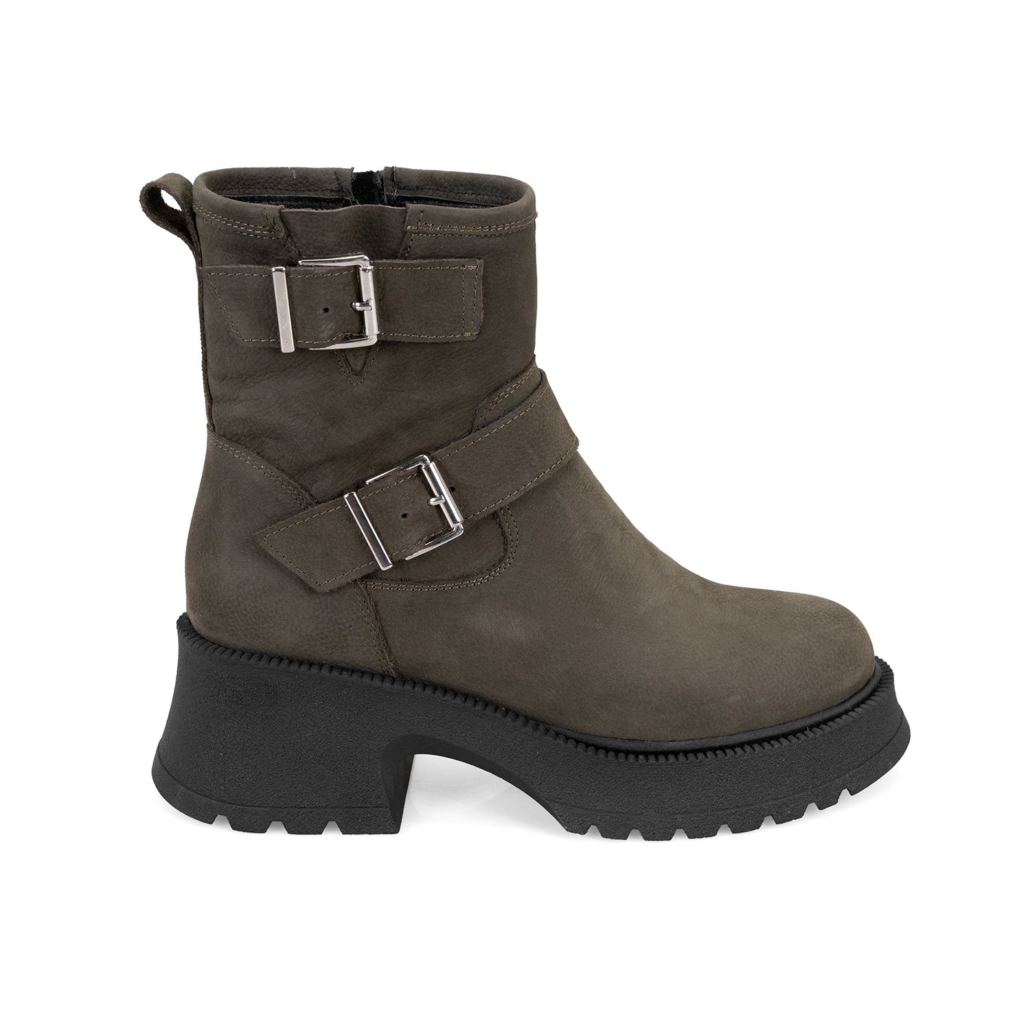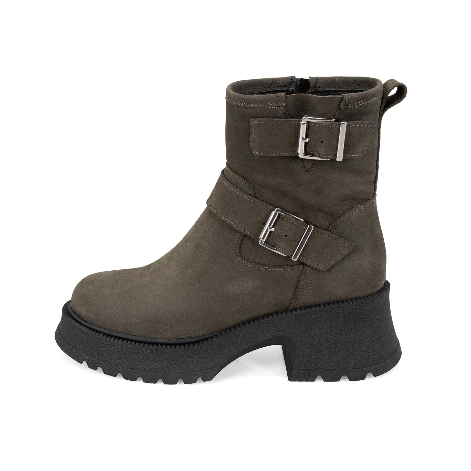 %100 nubuk deri, deri iç tabanlı, tekstil astarlı, termo tabanlı, çift metal toka detaylı, içten fermuarlı, kadın biker bot.