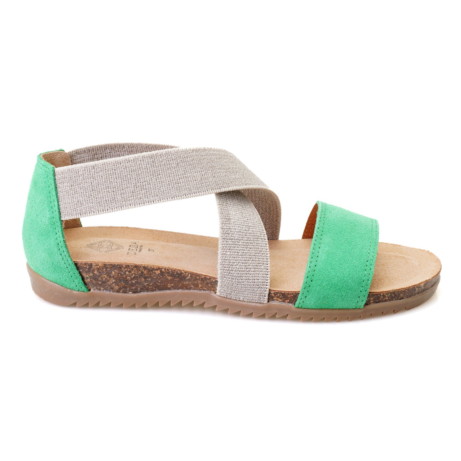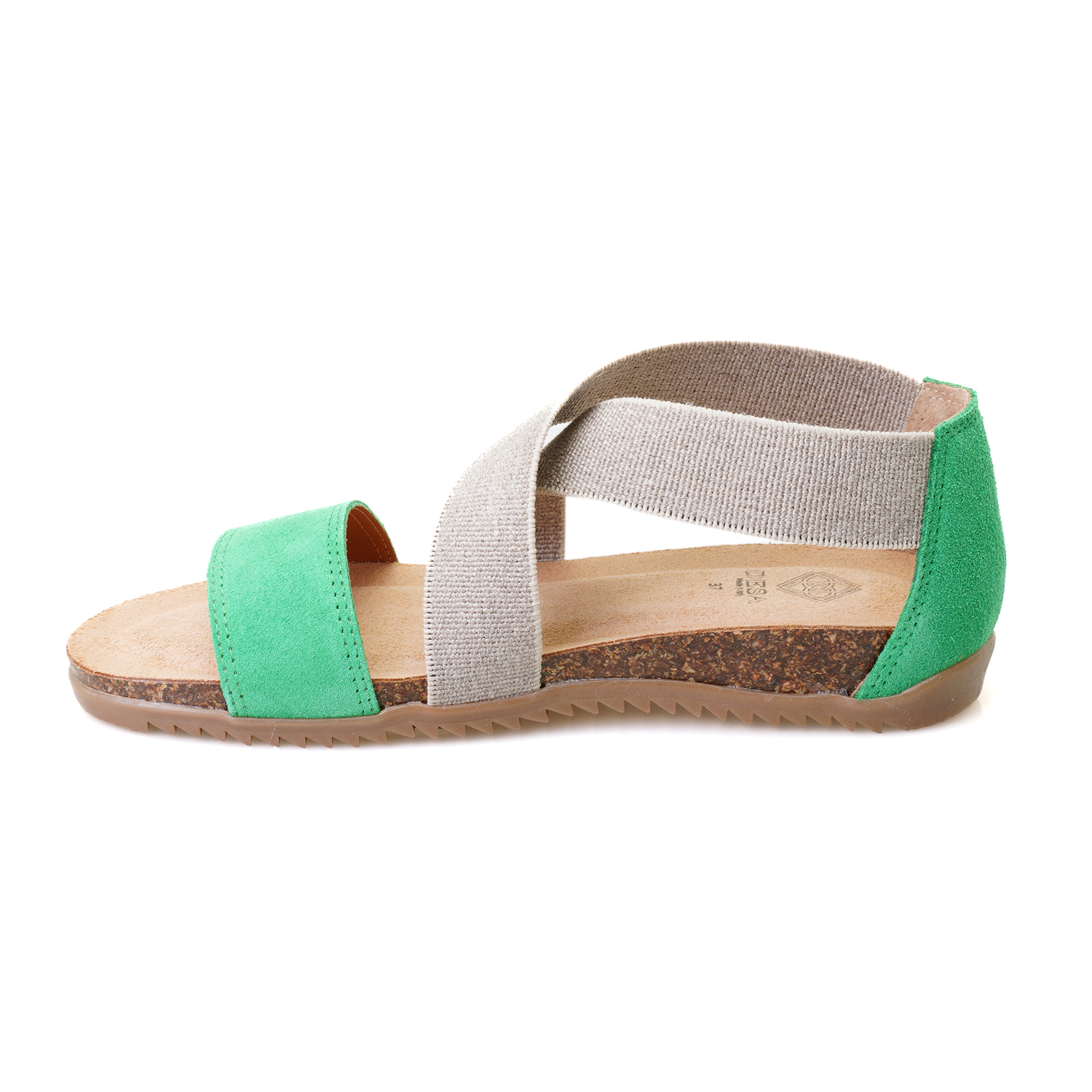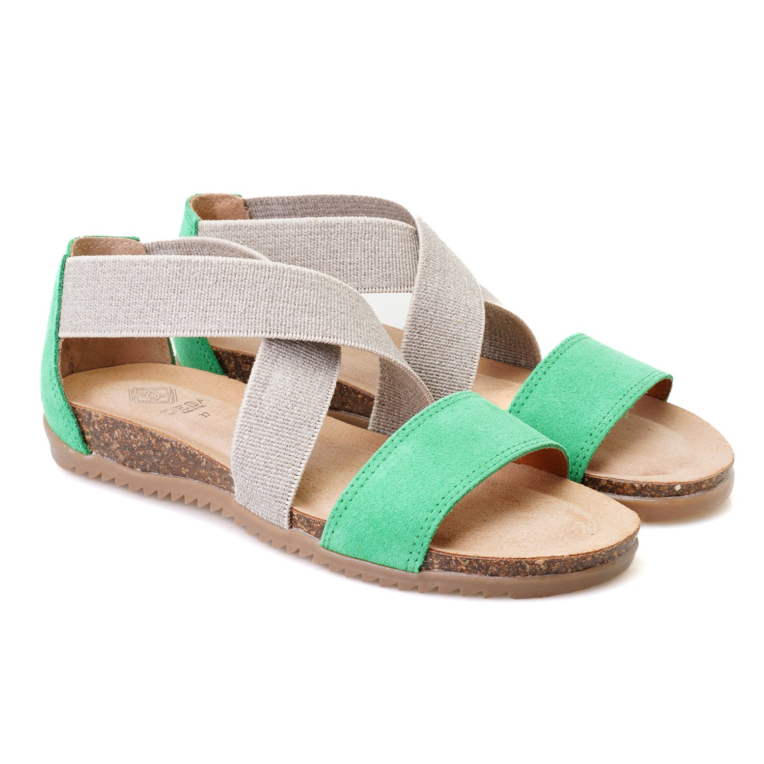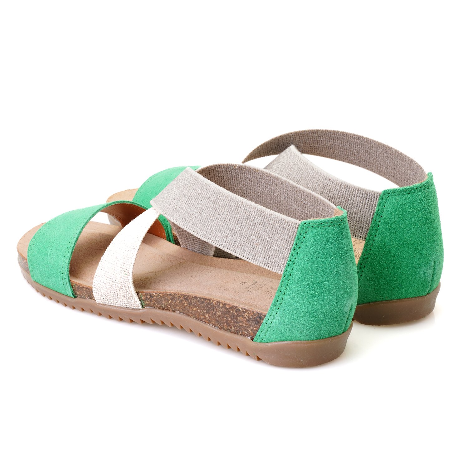 %40 süet deri, %60 lastik, deri iç astarlı, deri iç tabanlı, mantar tabanlı, kadın sandalet. Taban yüksekliği 2.5 cm.