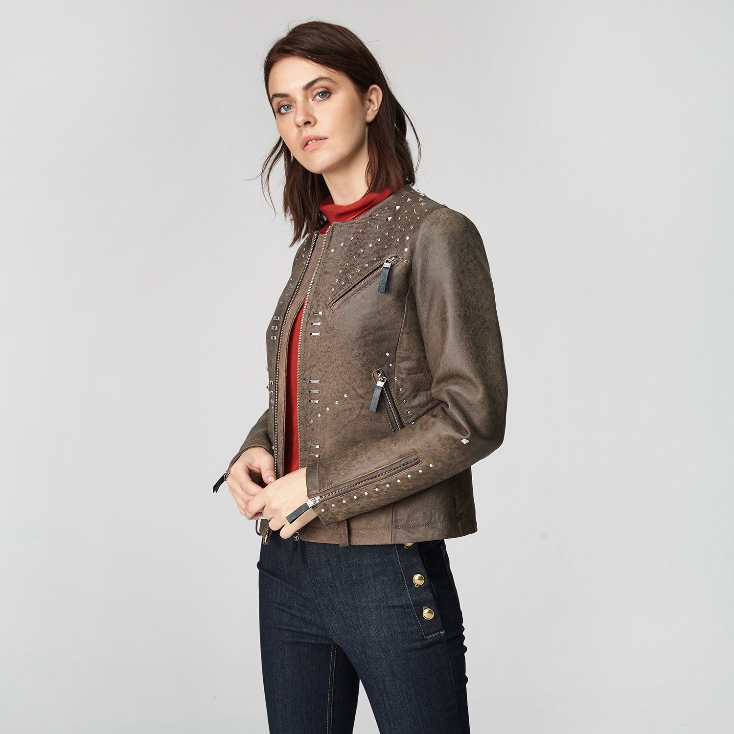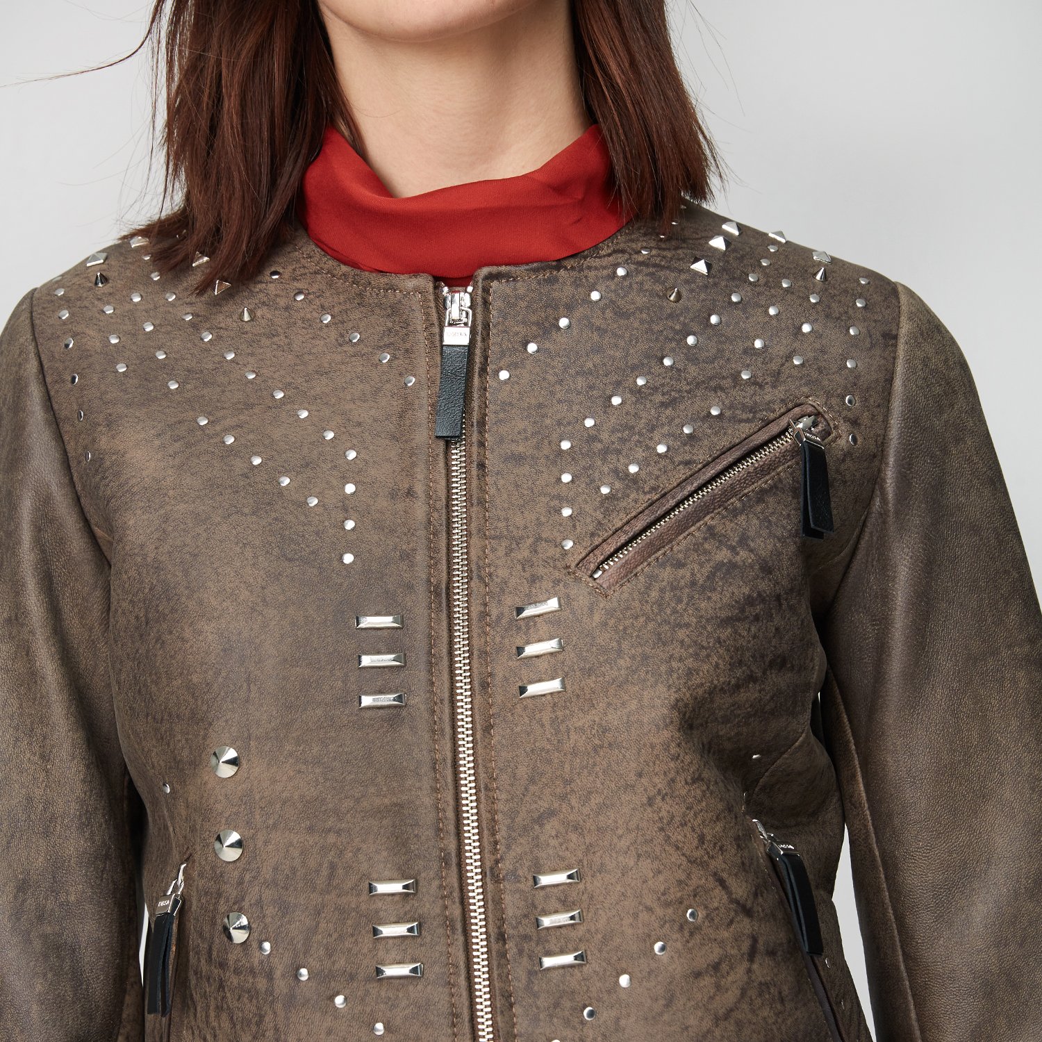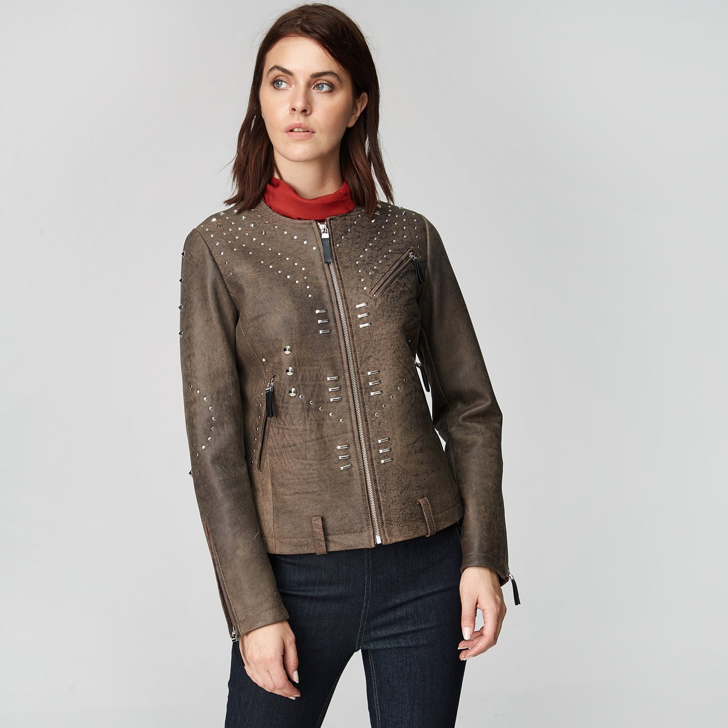 Farklılık seven ve şıklığına önem verenlere kadınlara zımbalı deri mont.