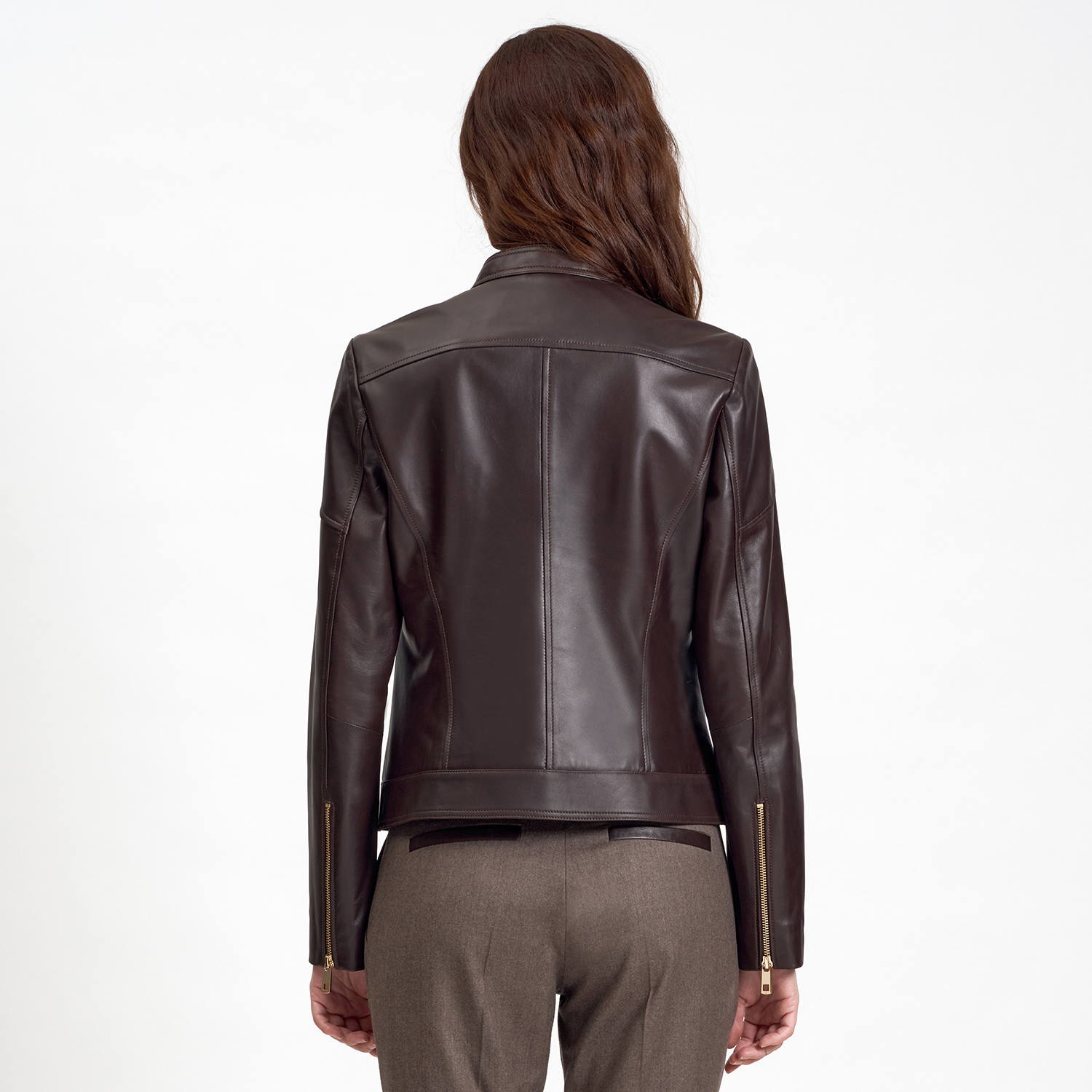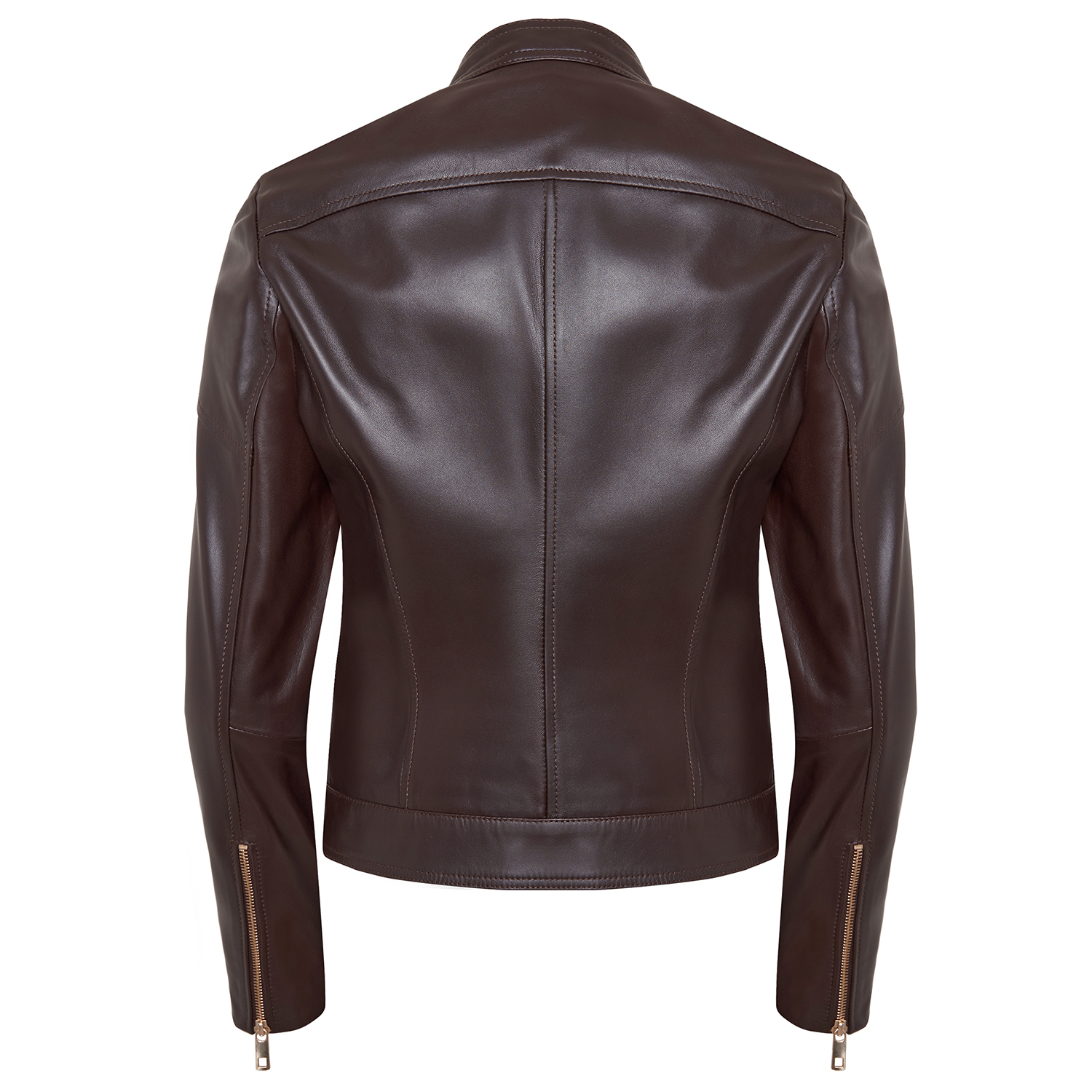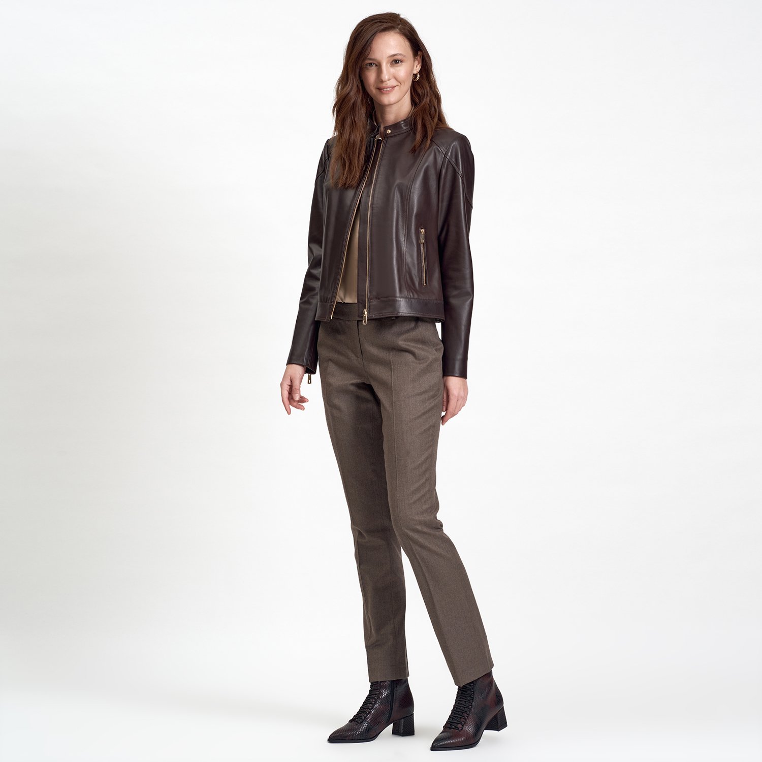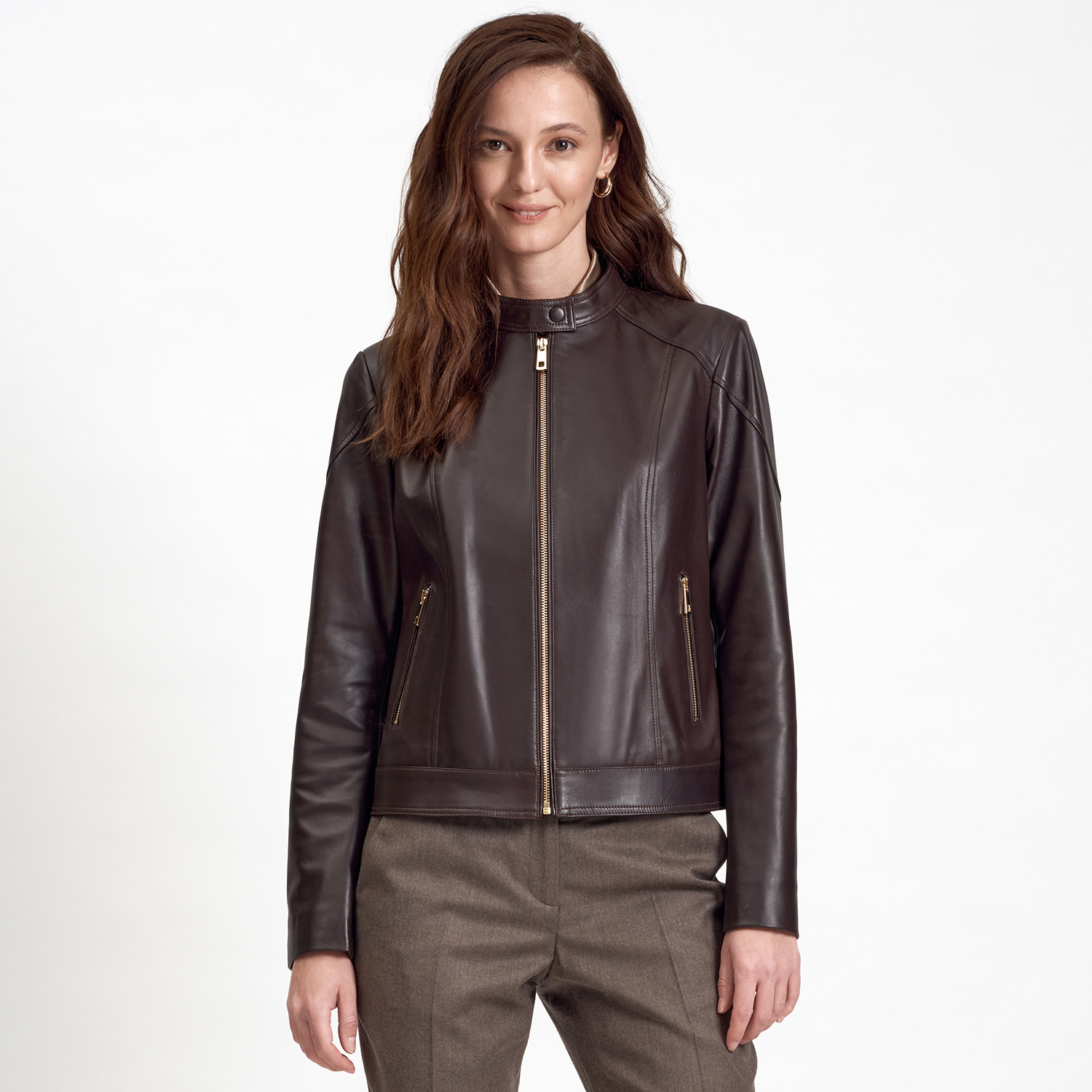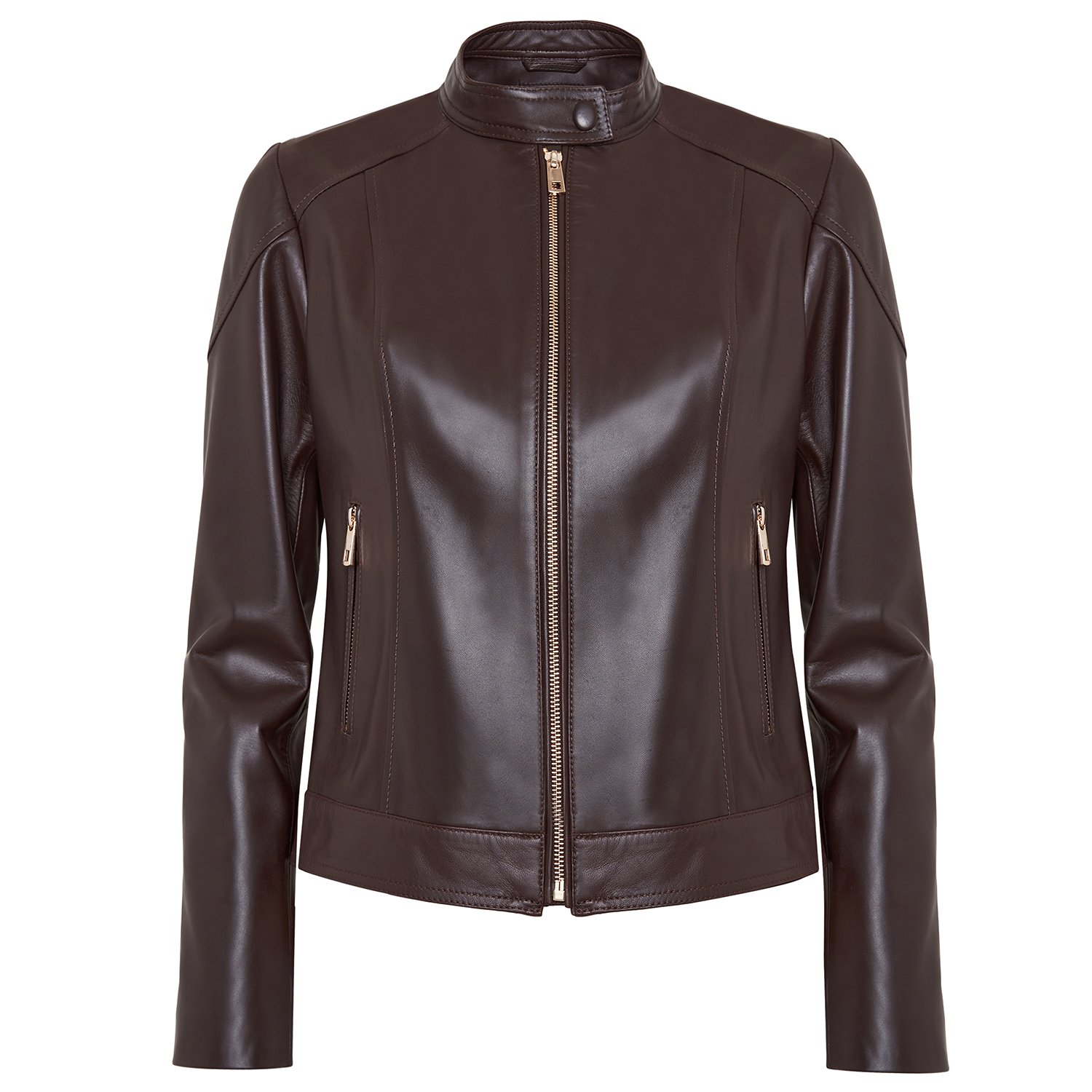 Kadın basic deri mont. hakim yakalı, önden metal fermuar kapamalı.