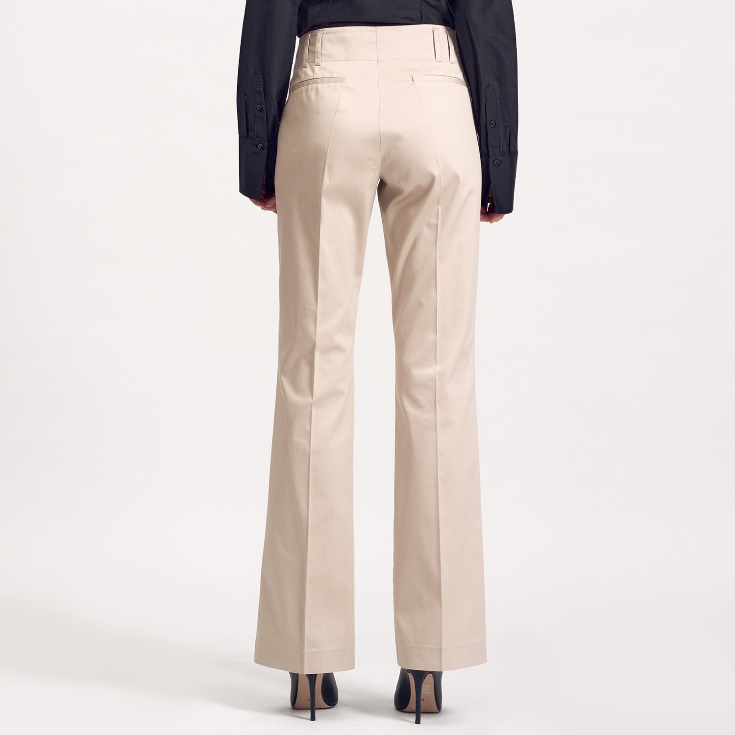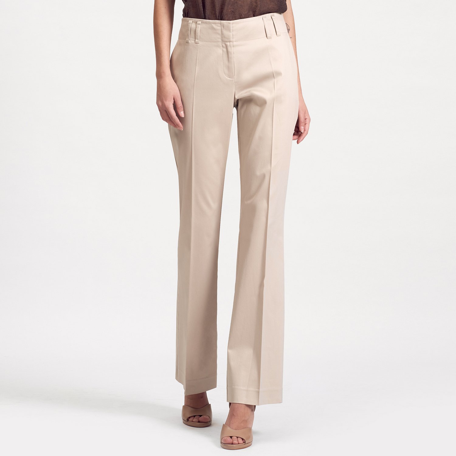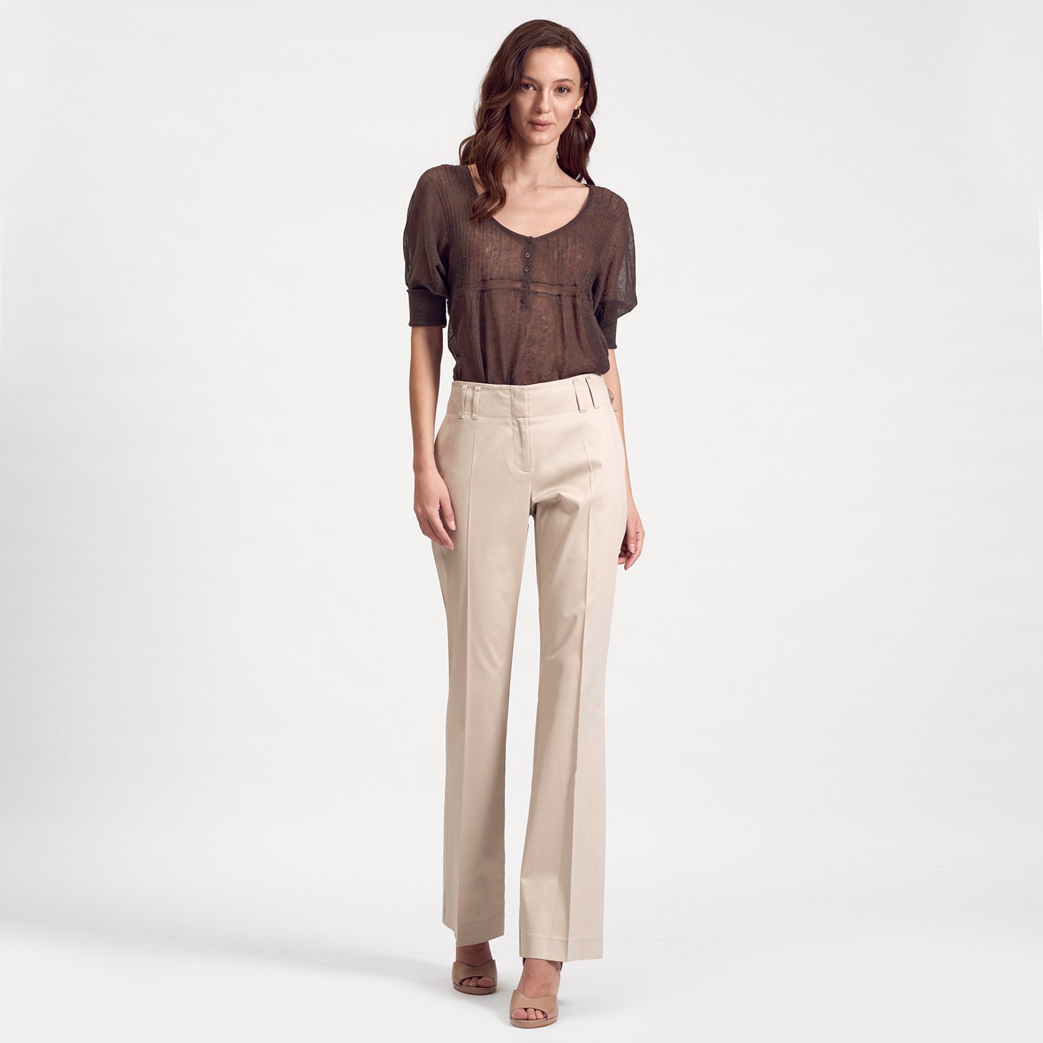 Düz paça, orta bel, geniş kemerli, ütü izli kadın koton pantolon.
