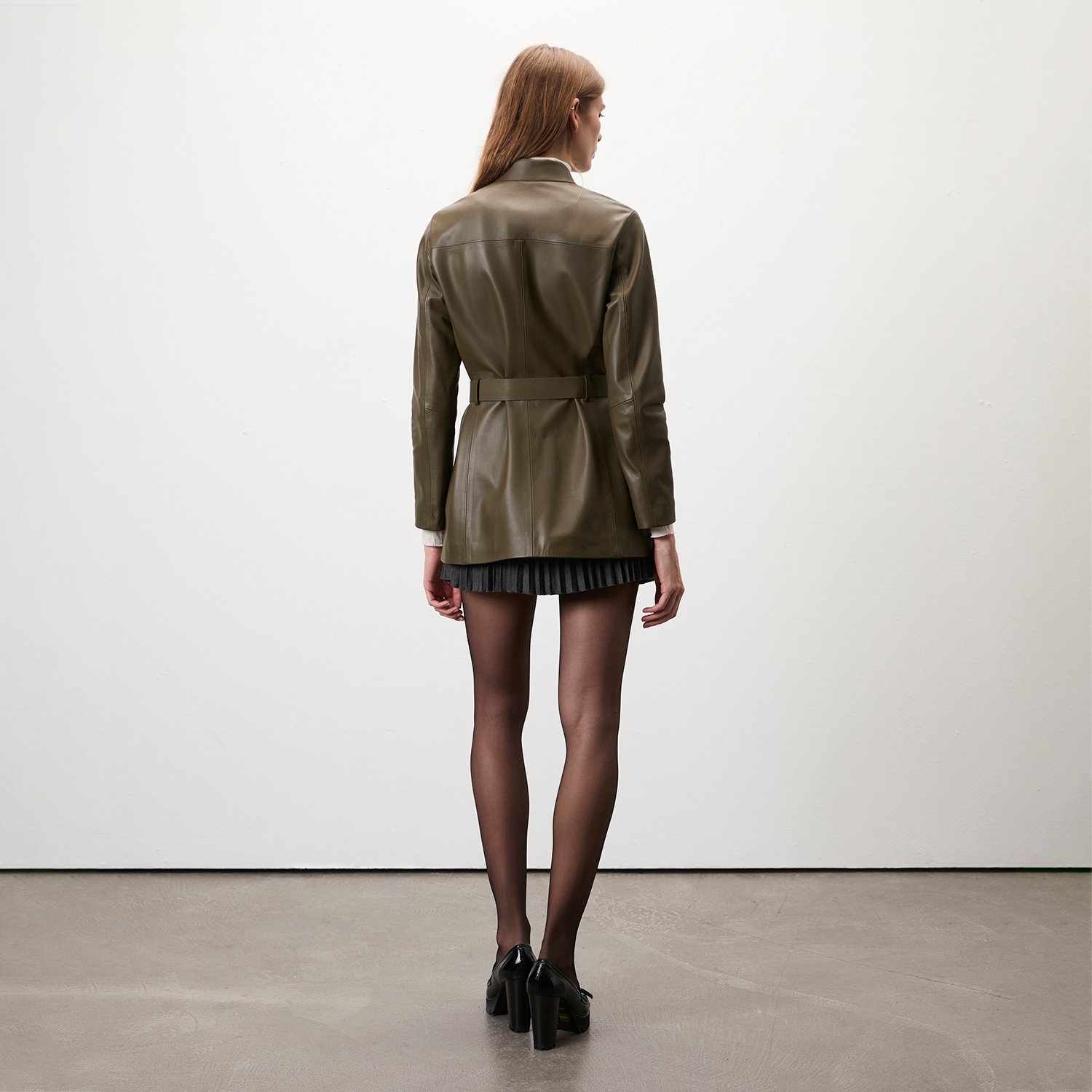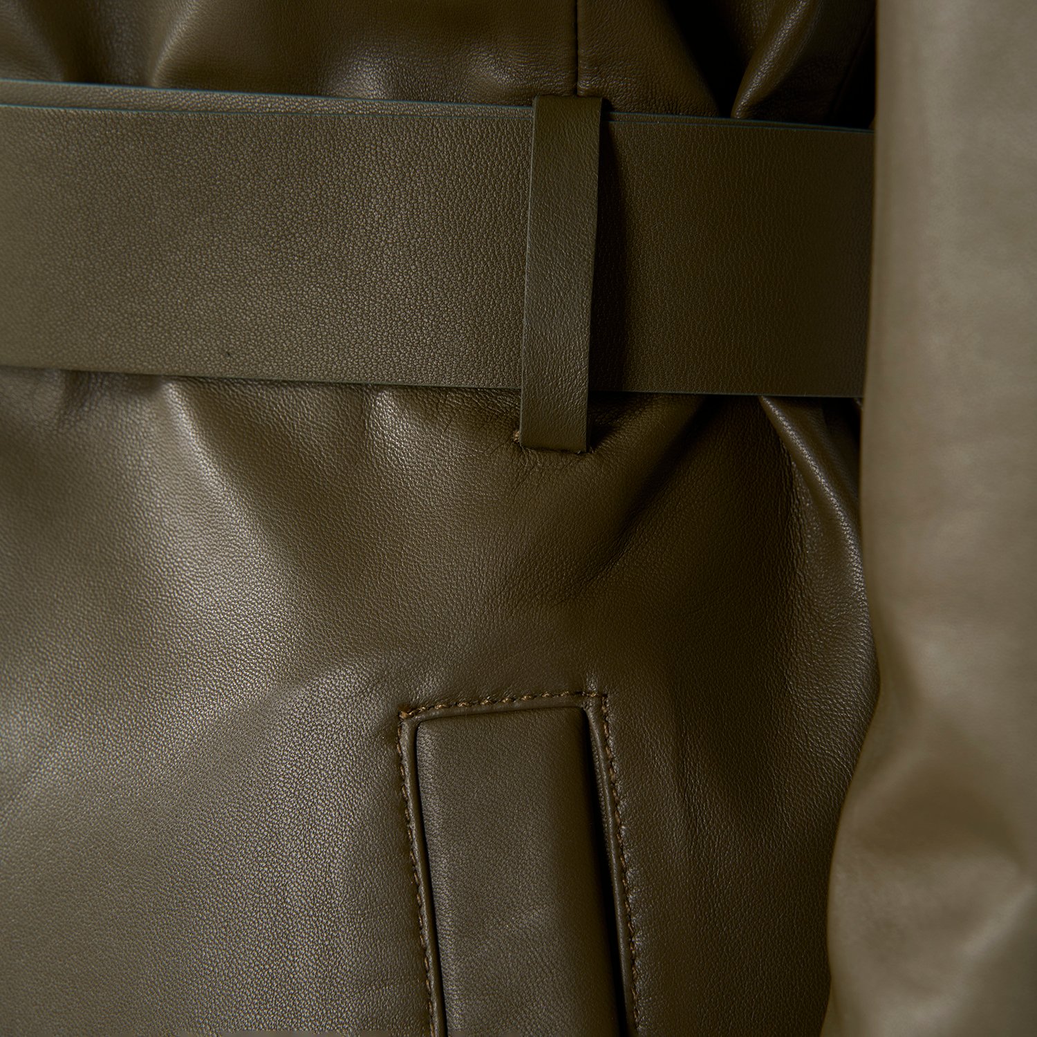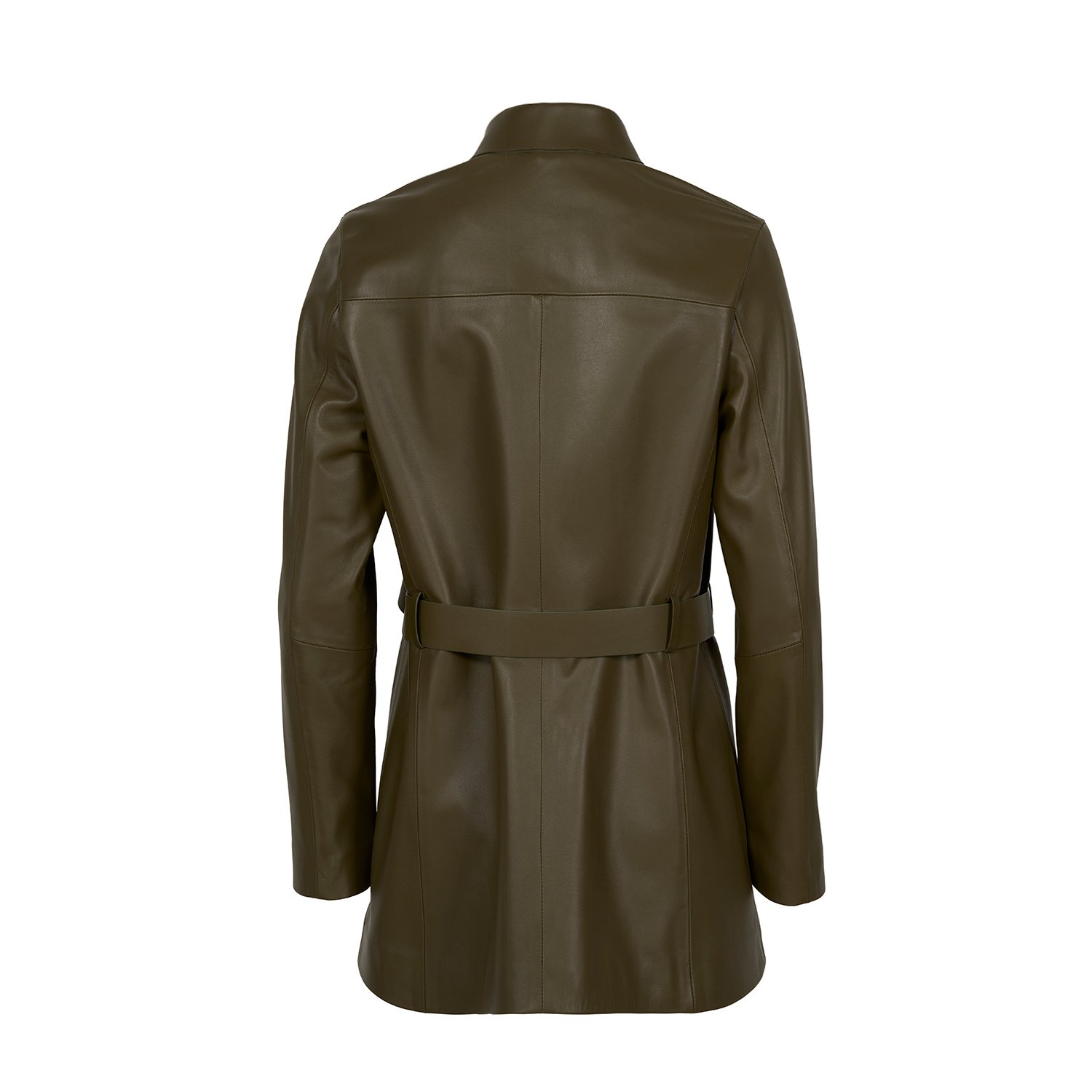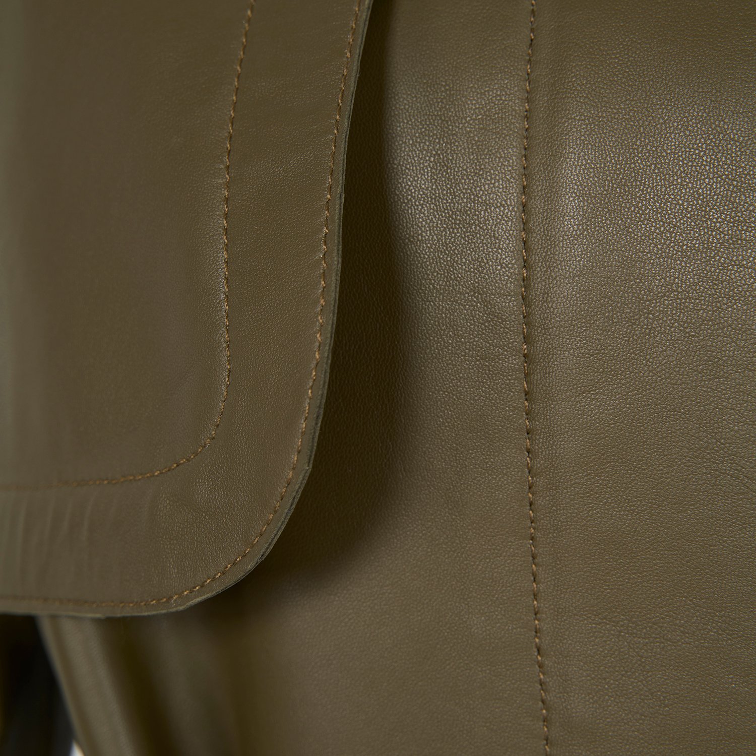 Kemer kenarlarında ve yakada özel işçilik kenar boyası ve çift kat deri lamine tekniği kullanılmıştır.