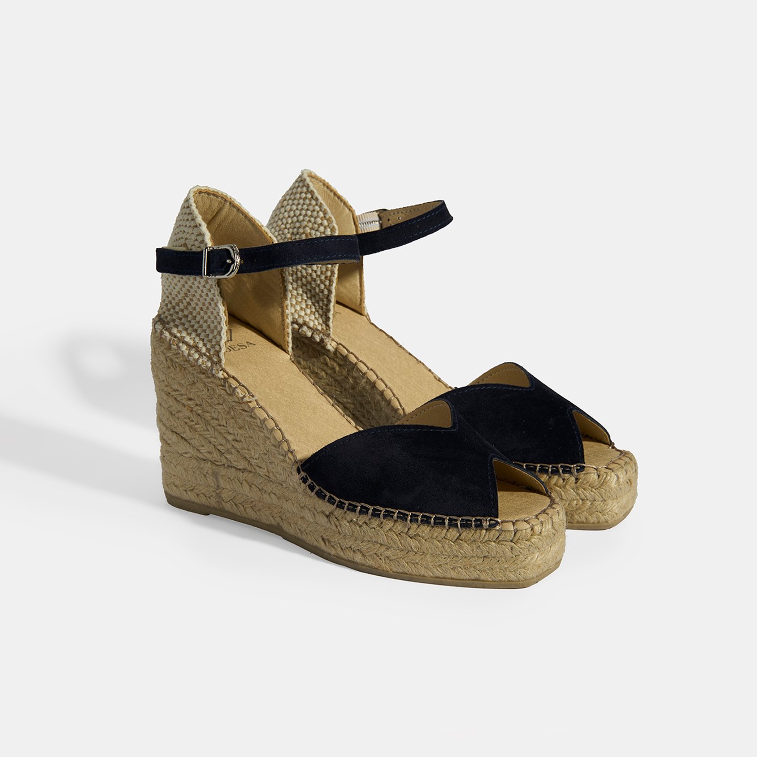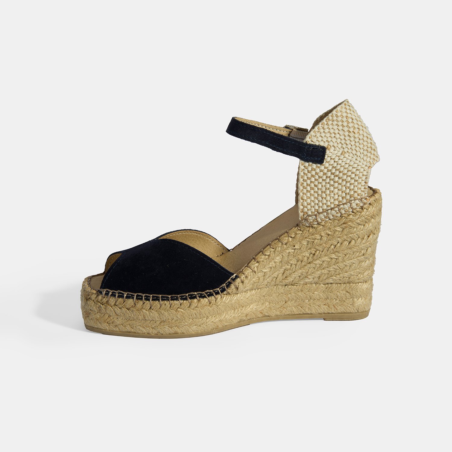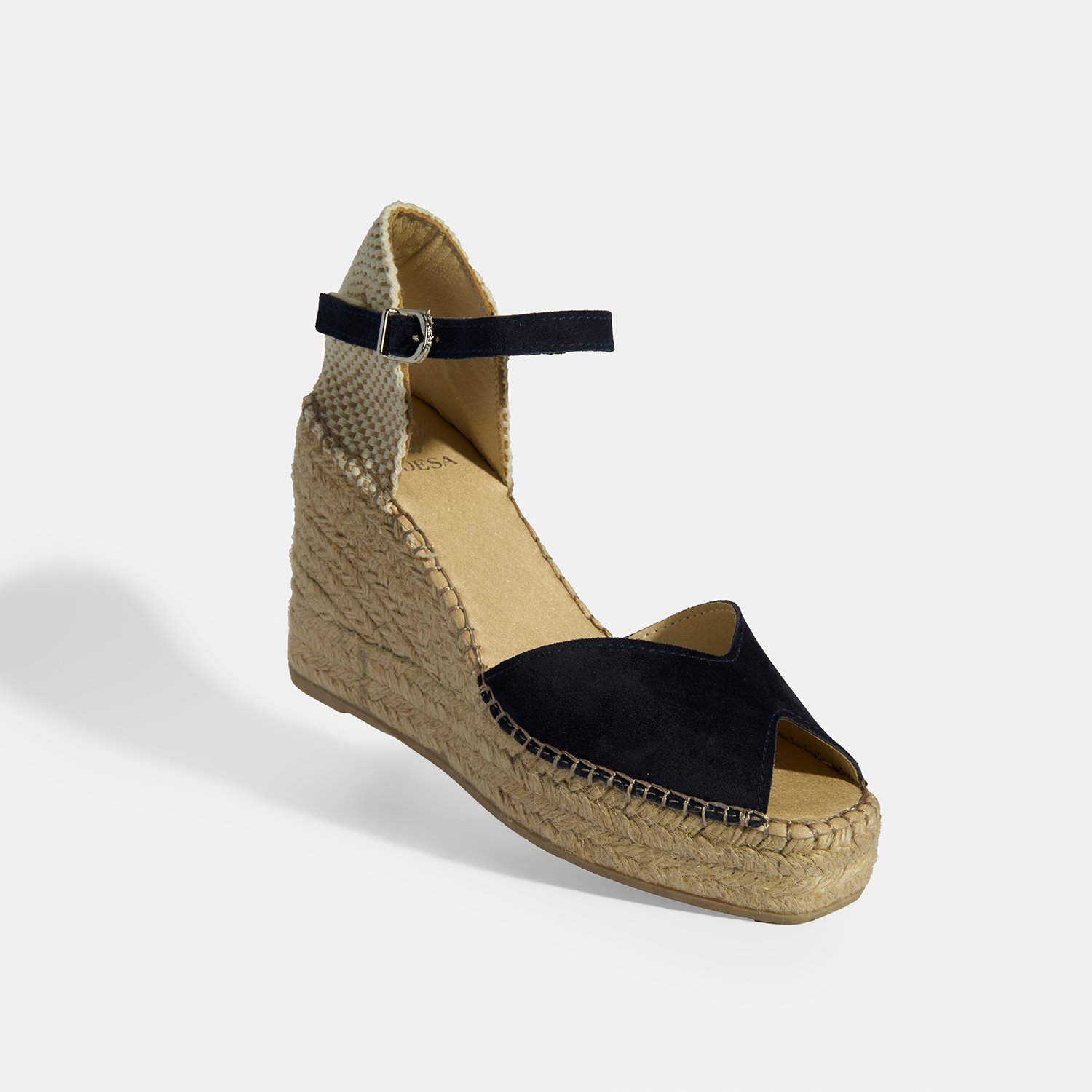 %100 süet deri, deri iç tabanlı, deri astarlı, ayarlanabilir metal tokalı, jüt sargılı tpu tabanlı, kadın dolgu topuklu espadril.