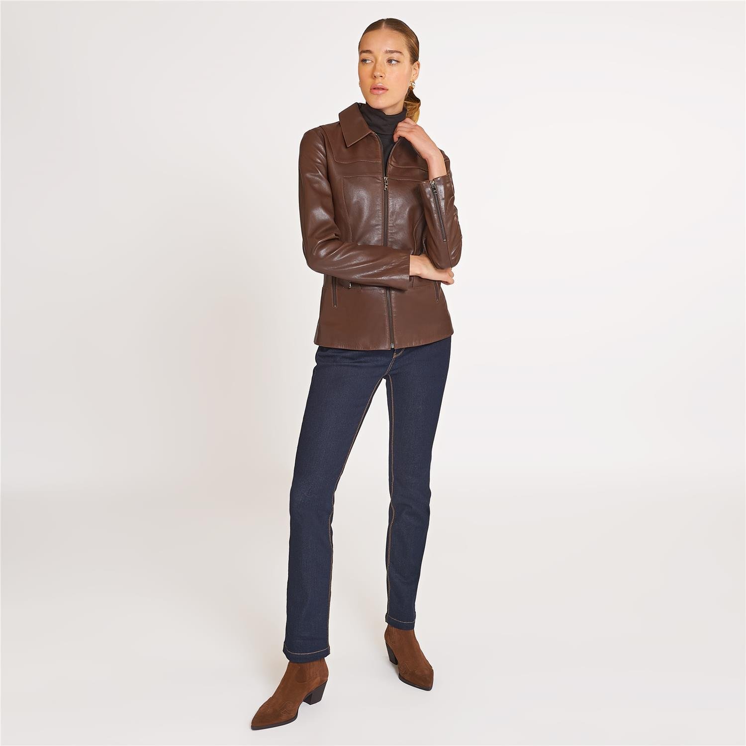Kombinlerin tamamlayıcı parçası olacak, çift taraflı deri mont.