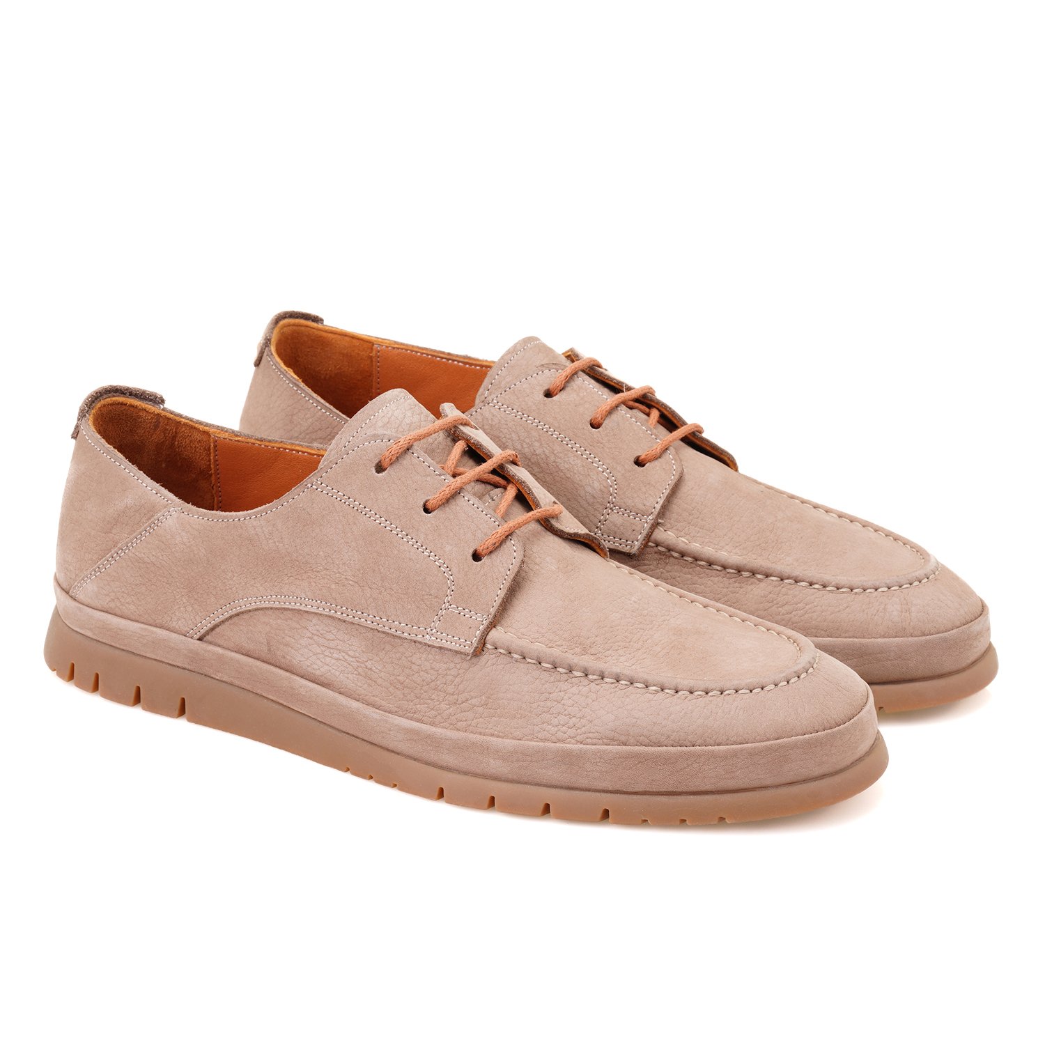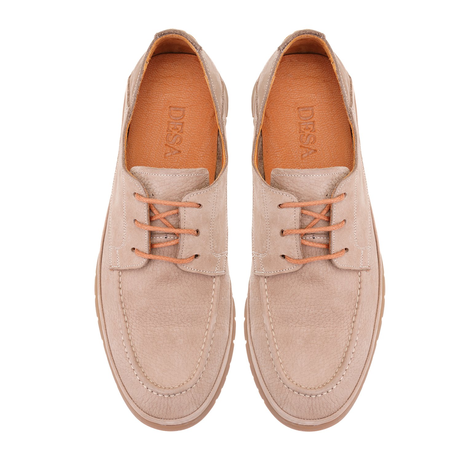%100 nubuk deri, deri iç tabanlı, astarsız , kauçuk tabanlı, bağcıklı erkek günlük ayakkabı. Taban yüksekliği 2 cm