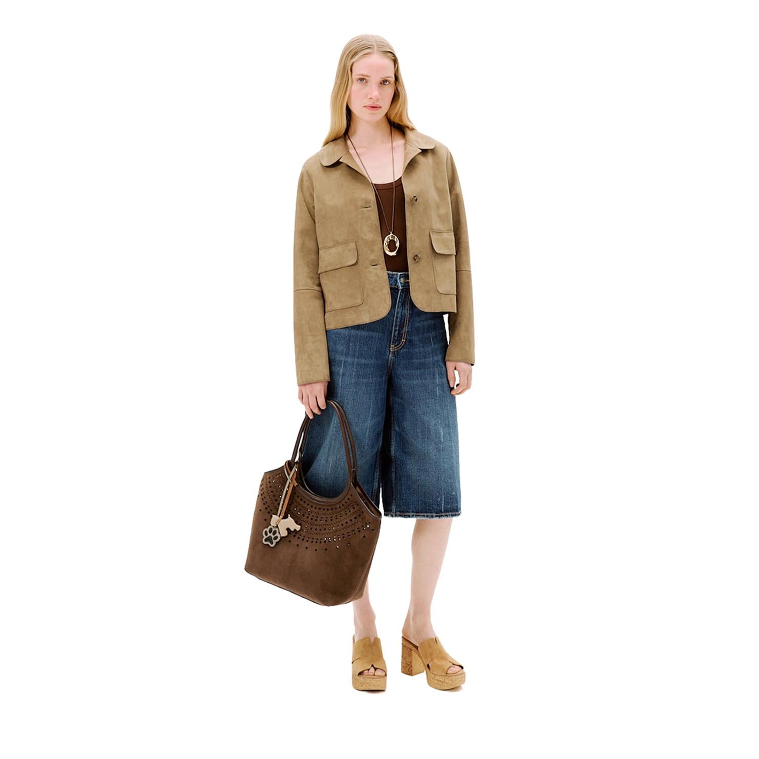 Kadın gömlek yakalı kısa süet ceket, önden düğme kapamalıdır.